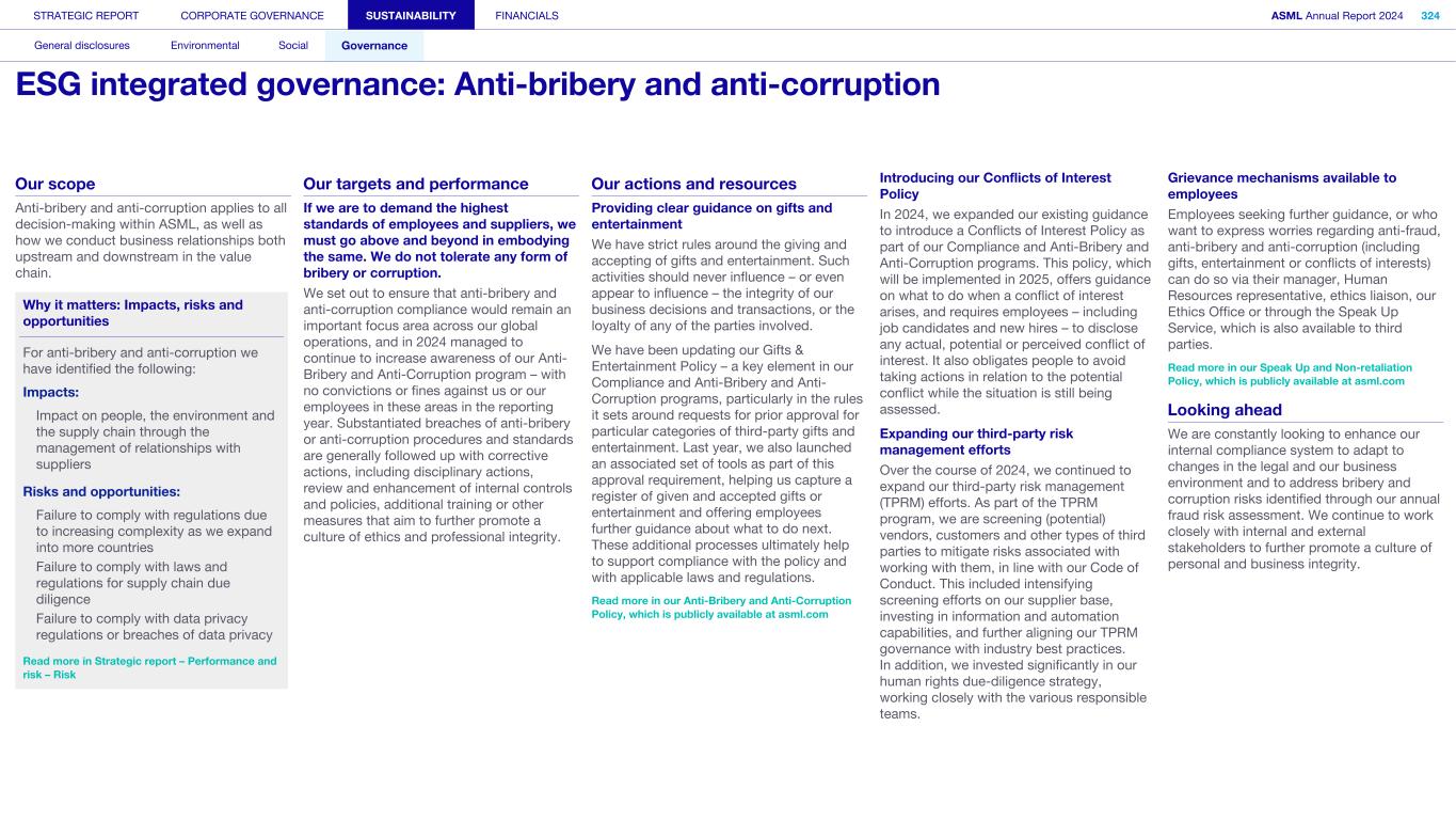 我们的范围反贿赂和反腐败适用于ASML范围内的所有决策,以及我们如何在价值链的上下游开展业务关系。为什么重要:反贿赂和反腐败的影响、风险和机会我们确定了以下几点:影响:对人的影响,通过管理与供应商的关系来保护环境和供应链风险和机会:随着我们扩展到更多国家,由于复杂性增加,未能遵守法规F a i未能遵守供应链尽职调查的法律法规未能遵守数据隐私法规或违反数据隐私在战略报告中阅读更多内容–绩效和风险–风险我们的目标和绩效如果我们要要求员工和供应商达到最高标准,我们必须在体现相同方面超越和超越。我们不容忍任何形式的贿赂和腐败。我们着手确保反贿赂和反腐败合规仍然是我们全球业务的一个重要重点领域,并在2024年设法继续提高对我们的反贿赂和反腐败计划的认识——在报告年度内没有对我们或我们在这些领域的员工定罪或罚款。经证实违反反贿赂或反腐败程序和标准的行为一般会采取纠正行动,包括纪律行动、审查和加强内部控制和政策、额外培训或其他旨在进一步促进道德文化和职业操守的措施。我们的行动和资源在礼品和娱乐方面提供明确的指导我们围绕礼品和娱乐的赠送和接受有严格的规定。此类活动绝不应影响——甚至似乎影响——我们的商业决策和交易的完整性,或任何相关方的忠诚度。我们一直在更新我们的礼品和娱乐政策——这是我们合规和反贿赂和反腐败计划的一个关键要素,特别是在它围绕特定类别的第三方礼品和娱乐的事先批准请求制定的规则中。去年,作为这一批准要求的一部分,我们还推出了一套相关的工具,帮助我们记录下赠送和接受的礼物或娱乐活动,并为员工提供关于下一步该做什么的进一步指导。这些额外流程最终有助于支持遵守政策和适用的法律法规。更多信息请阅读我们的反贿赂和反腐败政策,该政策可在asml.com上公开获得。在介绍我们的2024年利益冲突政策时,我们扩展了现有的指导,以引入利益冲突政策,作为我们合规和反贿赂和反腐败计划的一部分。这项将于2025年实施的政策为出现利益冲突时该怎么做提供了指导,并要求员工——包括求职者和新员工——披露任何实际、潜在或感知到的利益冲突。它还要求人们在局势仍在评估期间避免就潜在冲突采取行动。扩大我们的第三方风险管理工作在2024年期间,我们继续扩大我们的第三方风险管理(TPRM)工作。作为TPRM计划的一部分,我们正在根据我们的行为准则筛选(潜在)供应商、客户和其他类型的第三方,以降低与他们合作相关的风险。这包括加强对我们供应商基础的筛选工作,投资于信息和自动化能力,并进一步使我们的TPRM治理与行业最佳实践保持一致。此外,我们在人权尽职调查战略上投入了大量资金,与各负责团队密切合作。员工可使用的申诉机制寻求进一步指导的员工,或希望表达对反欺诈、反贿赂和反腐败(包括礼物、娱乐或利益冲突)的担忧,可以通过其经理、人力资源代表、道德联络员、我们的道德操守办公室或通过Speak Up Service进行,该服务也可供第三方使用。在我们的发声和不报复政策中阅读更多, 可在asml.com上公开查阅展望未来我们不断寻求加强我们的内部合规体系,以适应法律和商业环境的变化,并应对通过我们的年度欺诈风险评估确定的贿赂和腐败风险。我们继续与内部和外部利益相关者密切合作,以进一步促进个人和商业诚信文化。战略报告公司治理可持续发展金融公司ASML年度报告2024324一般披露环境社会治理ESG一体化治理:反贿赂和反腐败