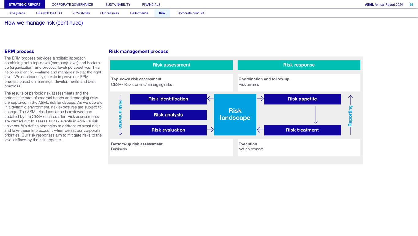 ERM流程ERM流程提供了一种结合自上而下(公司层面)和自下而上(组织和流程级)视角的整体方法。这有助于我们在适当的水平上识别、评估和管理风险。我们不断寻求根据所学到的知识、发展情况和最佳做法来改进我们的ERM流程。定期风险评估的结果以及外部趋势和新出现的风险的潜在影响在ASML风险格局中得到捕捉。由于我们在动态环境中运营,风险敞口可能会发生变化。CESR每个季度都会审查和更新ASML风险格局。开展风险评估,以评估ASML风险范围内的所有风险事件。我们定义应对相关风险的战略,并在设定公司优先事项时将这些考虑在内。我们的风险应对措施旨在将风险降低到风险偏好定义的水平。风险管理流程风险评估风险响应自上而下风险评估协调和后续CESR/风险所有者/新兴风险所有者风险识别风险格局风险偏好风险分析风险评估风险处理自下而上风险评估执行业务行动所有者战略报告企业治理可持续性金融《2024年度报告》63与CEO的一览问答2024故事我们的业务绩效风险企业行为我们如何管理风险(续)