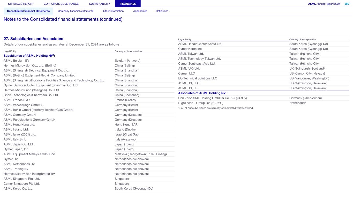 27.我司于2024年12月31日的子公司及联营公司详情如下:阿斯麦 NV1的子公司:ASML比利时BV比利时(安特卫普)爱马仕微视有限公司(北京)中国(北京)ASMLTERM3(北京)设备维修有限公司中国(北京)ASML(上海)光刻设施科技有限公司中国(上海)赛默半导体设备(上海)有限公司中国(上海)爱马仕微视(上海)有限公司,Ltd中国(上海)博锐科技(深圳)有限公司中国(深圳)ASML法国S.a.r.l.法国(克罗尔斯)ASML Verwaltungs GmbH i.l.德国(柏林)ASML Berlin GmbH(原Berliner Glas GmbH)德国(柏林)ASMLTERM3ASML Germany(Dresden)TERM4 Participations Germany GmbH Germany(Dresden)ASMLTERM5 Hong Kong Ltd. Hong Kong SAR ASMLTERM6 Ireland Ltd. Ireland(Dublin)ASML Israel(2001)Ltd. Israel(Kiryat Gat)ASMLTERMItaly S.r.l. Italy(Avezzano)ASML Japan Co有限公司。马来西亚(Georgetown,Pulau Pinang)Cymer BV Netherlands(Veldhoven)ASML Netherlands BV Netherlands(Veldhoven)HERMES Microvision Incorporated BV Netherlands(Veldhoven)ASML Singapore Pte. Ltd. Singapore Cymer Singapore Pte Ltd. Singapore ASML Korea Co. Ltd. South Korea(Gyeonggi-Do)Legal Entity of Incorporation Country of Korea Ltd. South Korea(Gyeonggi-Do)Cymer Korea Inc. South Korea(Gyeonggi-Do)ASML Taiwan Ltd. Taiwan(新Washington)ASML US,LLC US(Wilmington,Delaware)ASML US,LP US(Wilmington,Delaware)Associates of 阿斯麦 NV:Carl Zeiss SMT Holding GmbH & Co. KG(24.9%)Germany(Oberkochen)HighTechXL Group BV(31.97%)Netherlands Legal Entity Country of Incorporation 1。我们所有的附属公司均为(直接或间接)全资拥有。战略报告公司治理可持续发展金融公司ASML年度报告2024380合并财务报表公司财务报表其他信息附录定义合并财务报表附注(续)