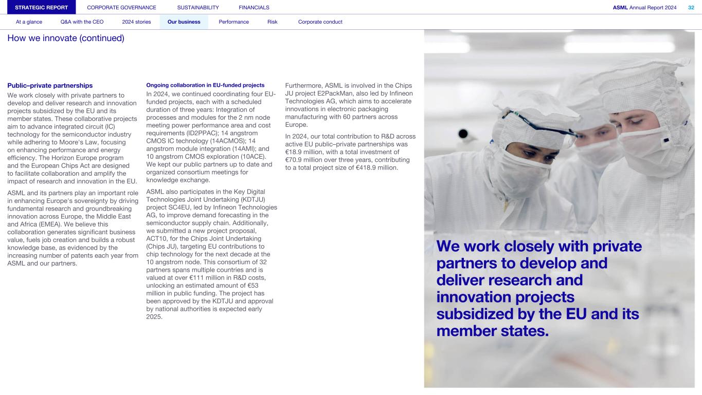 公共–私营伙伴关系我们与私营伙伴密切合作,开发和交付由欧盟及其成员国补贴的研究和创新项目。这些合作项目旨在推进半导体行业的集成电路(IC)技术,同时坚持摩尔定律,重点是提高性能和能效。地平线欧洲计划和欧洲芯片法案旨在促进合作并扩大研究和创新在欧盟的影响。ASML及其合作伙伴通过推动整个欧洲、中东和非洲(EMEA)的基础研究和突破性创新,在增强欧洲主权方面发挥着重要作用。我们相信,这种合作会产生显着的商业价值,推动创造就业机会,并建立一个强大的知识库,这一点从ASML和我们的合作伙伴每年不断增加的专利数量就可以证明。正在进行的欧盟资助项目合作2024年,我们继续协调四个欧盟资助的项目,每个项目的预定持续时间为三年:满足功率性能区域和成本要求的2nm节点的工艺和模块集成(ID2PPAC);14埃CMOS IC技术(14ACMOS);14埃CMOS模块集成(14AMI);和10埃CMOS探索(10ACE)。我们让我们的公共合作伙伴保持最新状态,并组织了知识交流的联盟会议。ASML还参与了由Infineon Technologies AG牵头的关键数字技术联合承担(KDTJU)项目SC4EU,以改善半导体供应链中的需求预测。此外,我们还为芯片联合承诺(Chips JU)提交了一份新的项目提案,即ACT10,目标是欧盟在10埃格节点对未来十年芯片技术的贡献。这个由32个合作伙伴组成的财团横跨多个国家,研发成本估值超过1.11亿欧元,估计释放了5300万欧元的公共资金。该项目已获得KDTJU的批准,预计将于2025年初获得国家当局的批准。此外,ASML还参与了同样由英飞凌科技股份公司领导的芯片JU项目E2PackMan,该项目旨在与欧洲各地的60个合作伙伴一起加速电子封装制造领域的创新。2024年,我们在活跃的欧盟公私合作伙伴关系中对研发的总贡献为1890万欧元,三年内的总投资为7090万欧元,贡献的项目总规模为4.189亿欧元。战略报告企业治理可持续发展金融学ASML年度报告202432与CEO的问答一目了然2024年的故事我们的业务绩效风险企业行为我们如何创新(续)我们与私营合作伙伴密切合作,以开发和交付由欧盟及其成员国补贴的研究和创新项目。