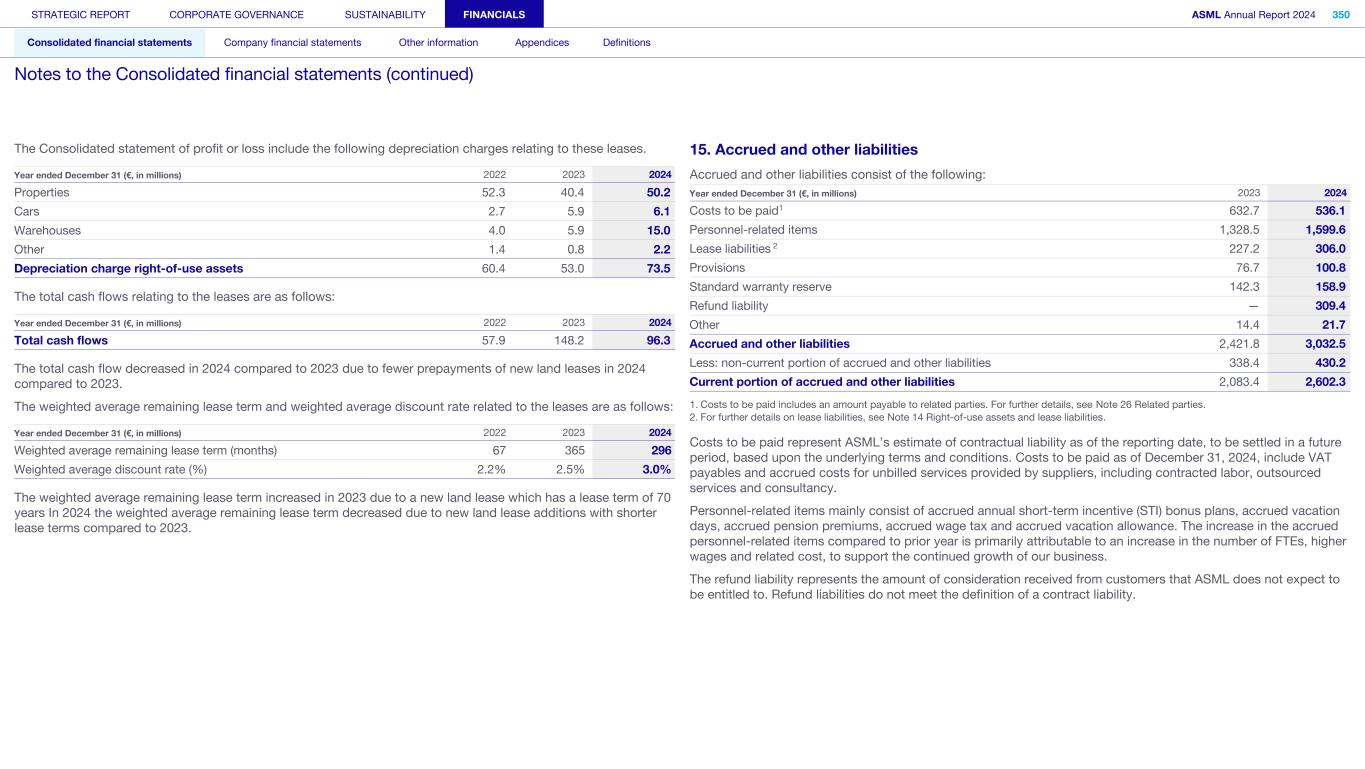 综合损益表包括以下与该等租赁有关的折旧费用。截至12月31日止年度(欧元,百万)202220232024物业52.34 0.45 0.2汽车2.75.96.1仓库4.05.9 15.0其他1.4 0.8 2.2折旧费用使用权资产60.45 3.07 3.5与租赁有关的总现金流量如下:截至12月31日止年度(欧元,百万)202220232024总现金流量57.91 48.296.3由于2024年新土地租赁的预付款比2023年减少,因此2024年总现金流量比2023年有所下降。与租约相关的加权平均剩余租期及加权平均折现率如下:截至12月31日止年度(欧元,百万元)202220232024加权平均剩余租期(月)67365296加权平均折现率(%)2.2% 2.5% 3.0%加权平均剩余租期2023年增加是由于2024年新增租期为70年的土地租约加权平均剩余租期减少是由于新增租期较2023年更短的土地租约。15.应计和其他负债应计和其他负债包括:截至12月31日止年度(欧元,百万)20232024年待支付成本1632.75 36.1人员相关项目1,328.51,599.6租赁负债2227.23 06.0拨备76.7 100.8标准保修准备金142.3158.9退款负债— 309.4其他14.42 1.7应计和其他负债2,421.83,03 2.5减:应计和其他负债的非流动部分338.44 30.2应计和其他负债的流动部分2,083.42,602.31。需支付的成本包括应付关联方的金额。更多详情,见附注26关联方。2.有关租赁负债的进一步详情,见附注14使用权资产和租赁负债。需支付的成本代表ASML对截至报告日的合同负债的估计,将根据基础条款和条件在未来期间内结算。截至2024年12月31日将支付的成本包括应付增值税和供应商提供的未开票服务的应计成本,包括承包劳务、外包服务和咨询。人事相关项目主要包括应计年度短期激励(STI)奖金计划、应计休假天数、应计养老金保费、应计工资税和应计休假津贴。与上一年相比,应计人事相关项目的增加主要是由于FTE数量增加、工资和相关成本增加,以支持我们业务的持续增长。退款责任指从客户处收到的、而ASML预期无权获得的对价金额。退款负债不符合合同负债的定义。战略报告公司治理可持续发展财务ASML年度报告2024350合并财务报表公司财务报表其他信息附录定义合并财务报表附注(续)