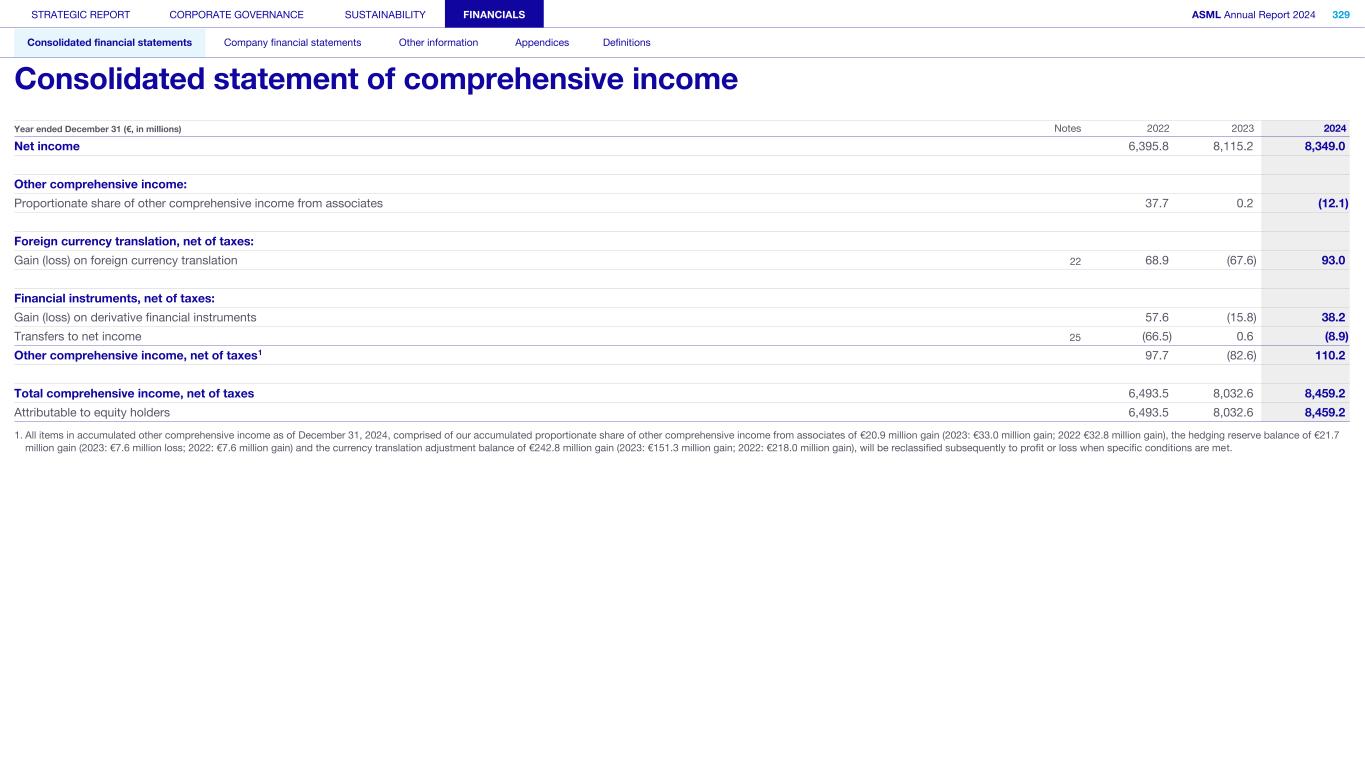 截至12月31日止年度(欧元,百万)票据202220232024净收益6,395.88,115.28,349.0其他综合收益:按比例应占联营公司其他综合收益37.7 0.2(12.1)外币折算,税后净额:外币折算收益(亏损)2268.9(67.6)93.0金融工具,税后净额:衍生金融工具收益(亏损)57.6(15.8)38.2转入净收益25(66.5)0.6(8.9)其他综合收益,税后净额1 97.7(82.6)110.2综合收益总额,税后净额6,493.58,032.68,459.2归属于权益持有人6,493.58,032.68,459.2 1。截至2024年12月31日累计其他综合收益中的所有项目,包括我们从联营公司获得的累计按比例分摊的其他综合收益2090万欧元收益(2023年:3300万欧元收益;2022年3280万欧元收益)、对冲准备金余额2170万欧元收益(2023年:760万欧元损失;2022年:760万欧元收益)和货币换算调整余额2.428亿欧元收益(2023年:1.513亿欧元收益;2022年:2.18亿欧元收益),将在满足特定条件后重新分类至损益。战略报告公司治理可持续发展金融机构ASML年度报告2024329合并财务报表公司财务报表其他信息附录定义合并综合收益表