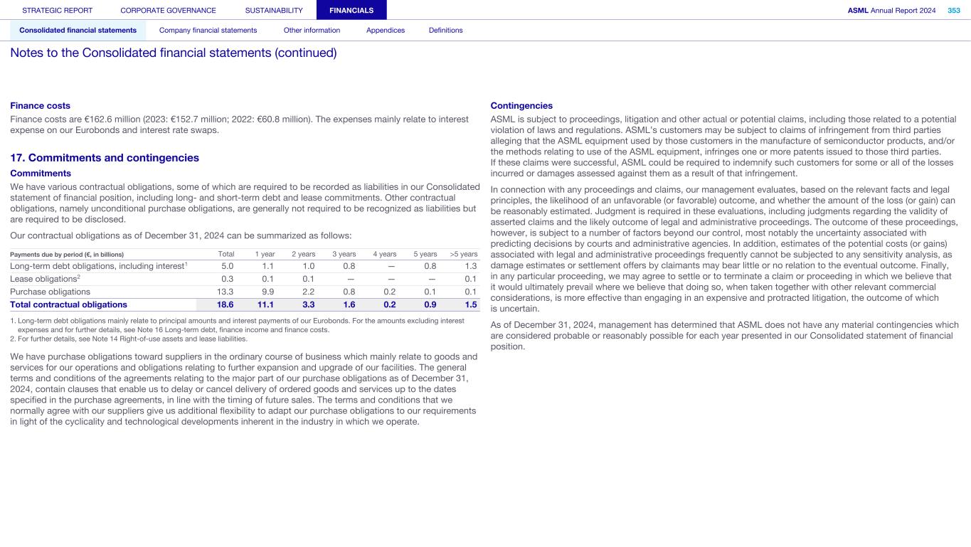 财务成本财务成本为1.626亿欧元(2023年:1.527亿欧元;2022年:6080万欧元)。这些费用主要涉及我们的欧洲债券和利率掉期的利息支出。17.承诺和或有事项承诺我们有各种合同义务,其中一些要求在我们的综合财务状况表中记录为负债,包括长短期债务和租赁承诺。其他合同义务,即无条件购买义务,一般不要求确认为负债,但要求予以披露。我们截至2024年12月31日的合同义务可概括如下:按期限到期的付款(欧元,单位:十亿)总计1年2年3年4年5年> 5年长期债务义务,包括利息15.0 1.11.0 0.8 — 0.8 1.3租赁义务20.3 0.10.1 —— 0.1采购义务13.39.9 2.2 0.8 0.2 0.10.1合同义务总额18.61 1.1 3.3 1.6 0.2 0.9 1.51。长期债务义务主要涉及我们的欧洲债券的本金金额和利息支付。有关不包括利息支出的金额及进一步详情,请参阅附注16长期债务、财务收入和财务成本。2.更多详情,见附注14使用权资产和租赁负债。我们在日常业务过程中对供应商负有采购义务,这主要涉及我们运营的商品和服务,以及与进一步扩大和升级我们的设施有关的义务。截至2024年12月31日,与我们购买义务的主要部分有关的协议的一般条款和条件包含使我们能够根据未来销售的时间推迟或取消在购买协议规定的日期之前交付所订购的商品和服务的条款。我们通常与供应商商定的条款和条件使我们能够根据我们经营所在行业固有的周期性和技术发展,根据我们的要求调整我们的采购义务。或有事项ASML受制于诉讼、诉讼和其他实际或潜在的索赔,包括与潜在违反法律法规有关的索赔。ASML的客户可能会受到第三方的侵权索赔,声称这些客户在制造半导体产品时使用的ASML设备,和/或与使用ASML设备有关的方法,侵犯了授予这些第三方的一项或多项专利。如果这些索赔成功,可能会要求ASML赔偿这些客户因该侵权行为而遭受的部分或全部损失或评估的损害。对于任何诉讼和索赔,我们的管理层根据相关事实和法律原则评估出现不利(或有利)结果的可能性,以及是否可以合理估计损失(或收益)的金额。在这些评估中需要作出判断,包括关于所主张的索赔的有效性以及法律和行政诉讼的可能结果的判断。然而,这些诉讼的结果受到我们无法控制的一些因素的影响,最明显的是与预测法院和行政机构的决定相关的不确定性。此外,对与法律和行政诉讼相关的潜在成本(或收益)的估计往往无法进行任何敏感性分析,因为索赔人的损害估计或和解提议可能与最终结果关系不大或根本没有关系。最后,在任何特定程序中,我们可能会同意解决或终止我们认为最终将占上风的索赔或程序,如果我们认为这样做与其他相关商业考虑因素一起考虑,比进行昂贵且旷日持久的诉讼更有效,其结果是不确定的。截至2024年12月31日,管理层已确定ASML在我们的综合财务状况表中呈列的每一年都没有任何被认为很可能或合理可能的重大或有事项。战略报告公司治理可持续发展财务ASML年度报告2024353合并财务报表公司财务报表其他信息附录定义合并财务报表附注(续)