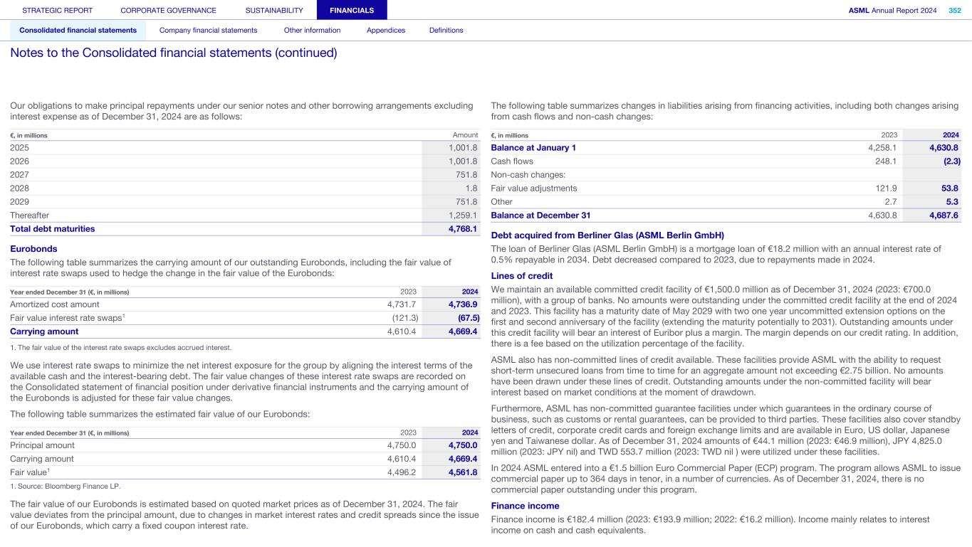 截至2024年12月31日,我们根据优先票据和其他借款安排(不包括利息费用)偿还本金的义务如下:欧元,单位:百万金额20251,001.820261,001.82027751.8 20281.8 2029751.8此后1,259.1债务到期总额4,768.1欧元债券下表汇总了我们未偿还的欧洲债券的账面金额,包括用于对冲欧洲债券公允价值变动的利率掉期的公允价值:截至12月31日止年度(欧元,百万)20232024年摊余成本金额4,731.74,736.9公允价值利率掉期1(121.3)(67.5)账面金额4,610.44,669.41。利率掉期的公允价值不包括应计利息。我们使用利率互换,通过调整可用现金和有息债务的利息条款,最大限度地减少集团的净利息敞口。这些利率掉期的公允价值变动记入综合财务状况表衍生金融工具项下,欧洲债券的账面值就这些公允价值变动进行调整。下表汇总了我们的欧洲债券的估计公允价值:截至12月31日的年度(欧元,单位:百万)20232024年本金金额4,750.04,750.0账面金额4,610.44,669.4公允价值14,496.24,56 1.81。资料来源:Bloomberg Finance LP。我们的欧洲债券的公允价值是根据截至2024年12月31日的市场报价估计的。公允价值偏离本金额,是由于自我们发行固定票面利率的欧洲债券以来市场利率和信用利差的变化。下表汇总了筹资活动引起的负债变化,包括现金流量和非现金变化引起的变化:欧元,单位:百万20232024年1月1日余额4,258.14,630.8现金流量248.1(2.3)非现金变化:公允价值调整121.95 3.8其他2.75.3 12月31日余额4,630.84,687.6从Berliner Glas(ASML Berlin GmbH)获得的债务Berliner Glas(ASML Berlin GmbH)的贷款为1820万欧元的抵押贷款,年利率为0.5%,应于2034年偿还。与2023年相比,债务有所减少,原因是2024年进行了偿还。信贷额度截至2024年12月31日,我们与一组银行保持了15.00亿欧元的可用承诺信贷额度(2023年:7.00亿欧元)。截至2024年底和2023年底,承诺信贷额度下没有未偿金额。该贷款的到期日为2029年5月,在贷款的第一个和第二个周年日有两个一年未承诺的延期选择(可能将期限延长至2031年)。该信贷安排下的未偿金额将承担Euribor的利息加上保证金。保证金取决于我们的信用评级。此外,根据设施的使用百分比收取费用。ASML也有可用的非承诺信用额度。这些便利使ASML能够不时要求提供总额不超过27.5亿欧元的短期无担保贷款。在这些信贷额度下没有提取任何金额。非承诺融资项下的未偿金额将根据提款时刻的市场情况计息。此外,ASML还有非承诺性担保便利,根据这些便利,可以向第三方提供日常业务过程中的担保,例如海关担保或租金担保。这些设施还涵盖备用信用证、企业信用卡和外汇限额,提供欧元、美元、日元和台币。截至2024年12月31日,这些设施下的使用金额为4410万欧元(2023年:4690万欧元)、48.25亿日元(2023年:零日元)和5.537亿新台币(2023年:零新台币)。2024年,ASML签订了一项15亿欧元的商业票据(ECP)计划。该计划允许ASML以多种货币发行期限最长为364天的商业票据。截至2024年12月31日,该计划下没有未偿还的商业票据。财务收入财务收入为1.824亿欧元(2023年:1.939亿欧元;2022年:1620万欧元)。收益主要与现金及现金等价物的利息收入有关。战略报告公司治理可持续发展财务ASML年度报告2024352合并财务报表公司财务报表其他信息附录定义合并财务报表附注(续)