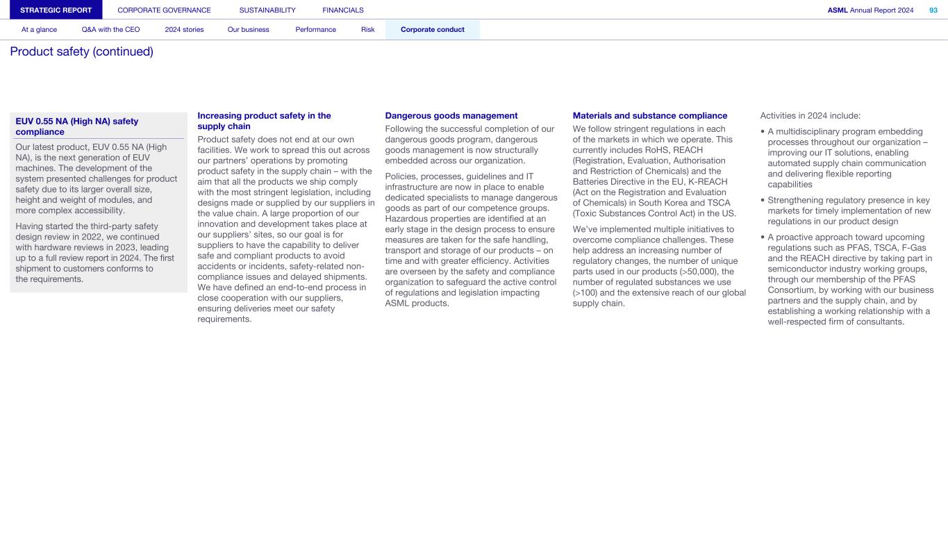 EUV 0.55 NA(High NA)安全符合性我们最新的产品,EUV 0.55 NA(High NA),是下一代EUV机器。该系统的开发由于其更大的整体尺寸、模块的高度和重量,以及更复杂的可访问性,对产品安全性提出了挑战。在2022年开始第三方安全设计审查后,我们在2023年继续进行硬件审查,最终在2024年发布全面审查报告。首次发货给客户符合要求。增加供应链中的产品安全产品安全并不止于我们自己的设施。我们致力于通过促进供应链中的产品安全,将这一点推广到合作伙伴的运营中——目标是我们发货的所有产品都符合最严格的法规,包括由价值链中的供应商制作或供应的设计。我们的创新和发展有很大一部分发生在供应商的现场,因此我们的目标是让供应商有能力交付安全和合规的产品,以避免事故或事故、与安全相关的不合规问题和延迟发货。我们与供应商密切合作,定义了端到端流程,确保交付符合我们的安全要求。危险品管理继我们的危险品方案圆满完成后,危险品管理现已在结构上嵌入我们整个组织。政策、流程、指南和IT基础设施现已到位,以使专门的专家能够管理危险货物,作为我们能力组的一部分。危险特性在设计过程的早期阶段就被识别出来,以确保采取措施来安全处理、运输和储存我们的产品——准时且效率更高。活动由安全与合规组织监督,以保障对影响ASML产品的法规和立法的主动控制。材料和物质合规我们在我们经营的每个市场都遵循严格的规定。这目前包括欧盟的RoHS、REACH(化学品注册、评估、授权和限制)和电池指令,韩国的K-REACH(化学品注册和评估法案)和美国的TSCA(有毒物质控制法)。我们实施了多项举措来克服合规挑战。这些有助于解决越来越多的监管变化、我们产品中使用的独特部件数量(> 50,000)、我们使用的受管制物质数量(> 100)以及我们全球供应链的广泛覆盖。2024年的活动包括:•一项将流程嵌入整个组织的多学科计划——改进我们的IT解决方案,实现自动化供应链沟通并提供灵活的报告能力•加强关键市场的监管存在,以便在我们的产品设计中及时实施新法规•通过参加半导体行业工作组、通过我们作为PFAS联盟的成员、通过与我们的业务合作伙伴和供应链合作,以及通过与一家受人尊敬的顾问公司建立工作关系,对即将出台的PFAS、TSCA、F-Gas和REACH指令等法规采取积极主动的态度。战略报告企业治理可持续发展财务ASML年度报告202493与CEO问答一览2024故事我们的业务绩效风险企业行为产品安全(续)