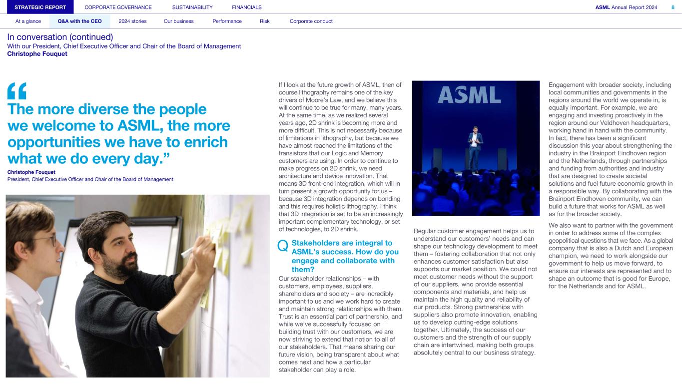 如果我看看ASML未来的增长,那么光刻当然仍然是摩尔定律的关键驱动因素之一,我们相信这将在很多很多年里继续存在。同时,正如我们几年前意识到的,2D缩容越来越难了。这不一定是因为光刻技术的限制,而是因为我们几乎达到了我们的逻辑和内存客户正在使用的晶体管的限制。为了继续在2D缩容上取得进展,我们需要架构和设备创新。这意味着3D前端集成,这反过来将为我们提供增长机会——因为3D集成依赖于粘合,而这需要整体光刻。我认为,3D集成将成为一种越来越重要的互补技术,或者说是一套技术,对2D缩小。Q利益相关者是ASML成功不可或缺的一部分。你如何与他们互动协作?我们的利益相关者关系——与客户、员工、供应商、股东和社会——对我们来说非常重要,我们努力与他们建立并保持牢固的关系。信任是伙伴关系的重要组成部分,虽然我们成功地专注于与客户建立信任,但我们现在正努力将这一理念推广到我们所有的利益相关者。这意味着分享我们的未来愿景,对接下来发生的事情以及特定利益相关者如何发挥作用保持透明。定期的客户参与有助于我们了解客户的需求,并可以塑造我们的技术开发以满足他们——促进协作,不仅可以提高客户满意度,还可以支持我们的市场地位。没有供应商的支持,我们无法满足客户的需求,供应商提供必要的组件和材料,并帮助我们保持产品的高质量和可靠性。与供应商的强大伙伴关系也促进了创新,使我们能够一起开发尖端解决方案。最终,我们客户的成功和我们供应链的实力是交织在一起的,这使得这两个集团对我们的业务战略具有绝对的核心意义。与更广泛的社会,包括我们在世界各地开展业务的地区的当地社区和政府的接触,同样重要。例如,我们正在Veldhoven总部周围的区域积极参与和投资,与社区携手合作。事实上,今年在Brainport埃因霍温地区和荷兰进行了一场关于加强该行业的重要讨论,通过合作伙伴关系和来自当局和行业的资助,旨在创造社会解决方案并以负责任的方式推动未来的经济增长。通过与Brainport Eindhoven社区合作,我们可以建立一个为ASML以及更广泛社会服务的未来。我们还希望与政府合作,以解决我们面临的一些复杂的地缘政治问题。作为一家同时也是荷兰和欧洲冠军的全球性公司,我们需要与我们的政府一起帮助我们前进,确保我们的利益得到代表,并塑造一个对欧洲、对荷兰和对ASML都有利的结果。战略报告公司治理可持续发展财务报告ASML 2024年度报告8一览与首席执行官的问答2024故事我们的业务绩效风险与我们的总裁、首席执行官和管理委员会主席克里斯托夫·福凯(Christopher Fouquet)对话(续)中的公司行为我们对ASML欢迎的人越多样化,我们就越有机会丰富我们每天所做的事情。”Christophe Fouquet总裁、首席执行官兼管理委员会主席