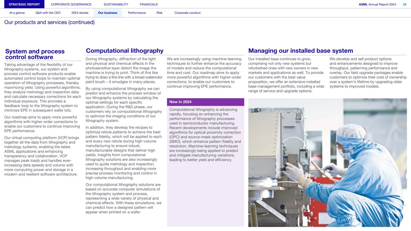 系统和过程控制软件利用我们光刻系统的灵活性,我们的系统和过程控制软件产品使自动化控制回路能够保持光刻工艺的最佳运行,从而最大限度地提高产量。他们使用强大的算法,分析计量和检查数据,并为每个单独的暴露计算出必要的校正。这为光刻系统提供了一个反馈回路,以最大限度地减少后续晶圆批次中的EPE。我们的路线图旨在应用更强大的算法和更高阶的修正,使我们的客户能够继续提高EPE性能。我们的虚拟计算平台(VCP)汇集了来自光刻和计量系统的所有数据,支持最新的ASML应用程序并增强透明度和协作。VCP管理峰值负载,并在现代化且有弹性的软件架构中以更多的计算能力和存储处理不断增长的数据速度和体积。在光刻过程中,光的衍射以及感光层中的物理和化学效应会使机器试图打印的图像失真。把这想象成试图用宽阔的水彩画笔画出一条细线——它在很多地方都有污迹。通过使用计算光刻,我们可以通过计算每个特定应用的最佳设置来预测和增强我们光刻系统的工艺窗口。在研发阶段,我们的客户依靠计算光刻来优化我们光刻系统的成像条件。此外,他们还开发了优化网版图案的配方,以实现最佳的图案保真度,这将在大批量制造期间应用于每一个新的网版,以确保提供高产量的坚固、可制造的设计。计算光刻解决方案的洞察力也越来越多地用于指导计量和检查,提高吞吐量,并在大批量制造中实现更精确的过程监测和控制。我们的计算光刻解决方案基于光刻系统和过程的精确计算机模拟,代表了多种物理和化学效应。通过这些模拟,我们可以预测当打印在晶圆上时,设计好的图案将如何出现。我们越来越多地使用机器学习技术来进一步提高模型的准确性,减少计算时间和成本。我们的路线图旨在应用更强大的算法和更高阶的修正,使我们的客户能够继续提高EPE性能。我们的安装基数继续增长,不仅包括新系统,还包括在新市场和应用程序中拥有新所有者的翻新系统。为了向我们的客户提供最佳的价值主张,我们提供广泛的安装基础管理组合,包括广泛的服务和升级选项。我们开发和销售产品选项和增强功能,旨在提高吞吐量、图案化性能和覆盖。我们的现场升级包使客户能够通过将旧系统升级到改进的模型,在系统的整个生命周期内优化其拥有成本。战略报告公司治理可持续发展财务ASML年度报告202426一览与CEO的问答2024故事我们的业务绩效风险公司行为我们的产品和服务(续)计算光刻管理我们的安装底座系统New in 2024计算光刻正在快速推进,重点是提高半导体制造中使用的光刻工艺的性能。最近的发展包括改进的光学接近校正(OPC)算法和源掩码优化(SMO),它们可以增强图案保真度和分辨率。机器学习技术正越来越多地被应用于预测和缓解制造差异,从而带来更好的产量和效率。