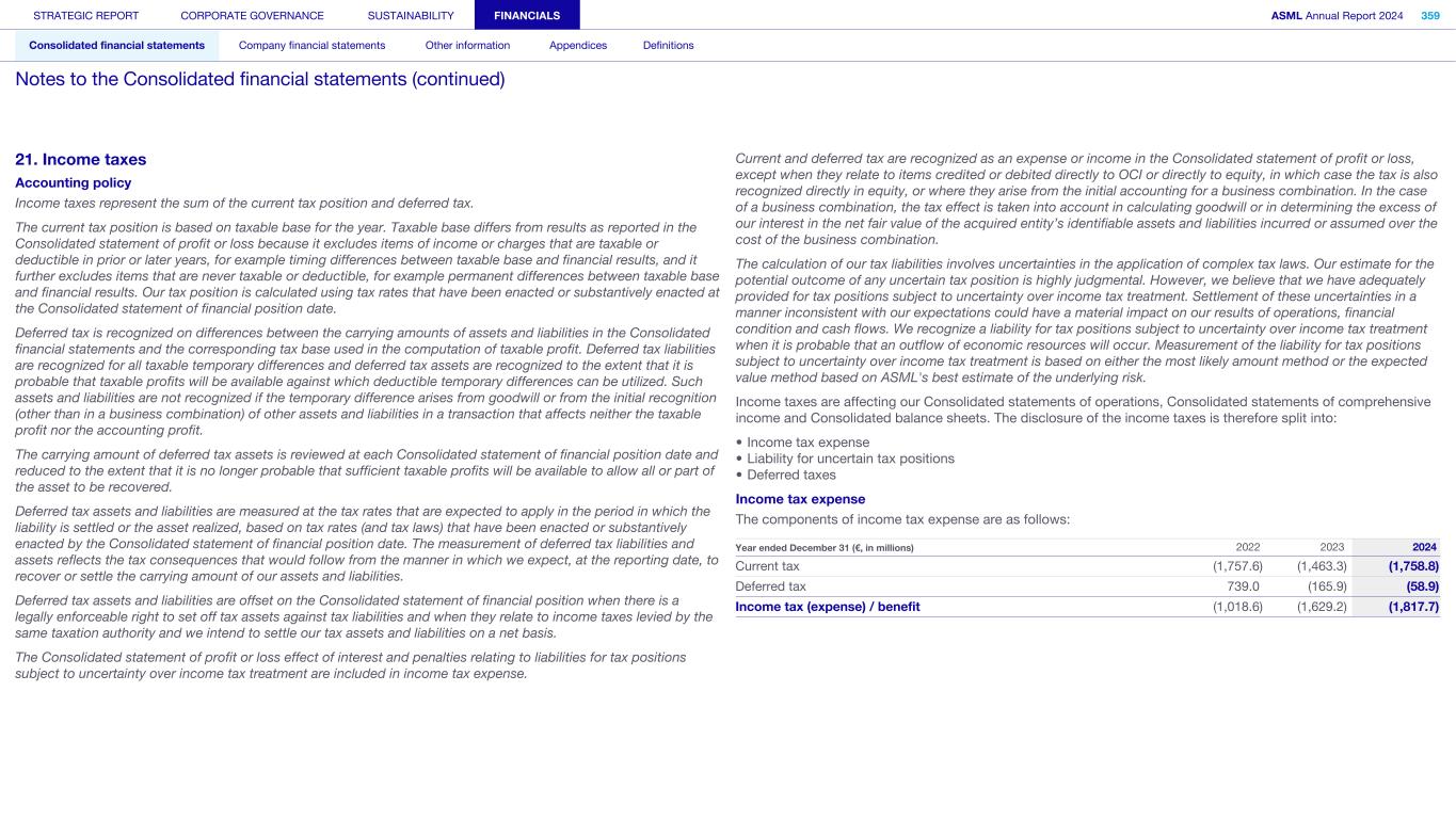 21.所得税会计政策所得税代表当期纳税状况和递延税款之和。当前纳税情况以当年应纳税基数为准。应课税基数与综合损益表中报告的结果不同,因为它不包括在以前或以后年度应课税或可扣除的收入或费用项目,例如应课税基数与财务结果之间的时间差异,并且进一步不包括从不课税或可扣除的项目,例如应课税基数与财务结果之间的永久性差异。我们的税务状况是使用在综合财务状况表日期已颁布或实质上已颁布的税率计算的。递延税项乃就综合财务报表中资产及负债的账面值与计算应课税利润所使用的相应税基之间的差额确认。就所有应课税暂时性差异确认递延所得税负债,并在很可能取得可抵扣暂时性差异的应课税利润时确认递延所得税资产。如果暂时性差异产生于商誉或在既不影响应纳税所得额也不影响会计利润的交易中初始确认(企业合并中除外)其他资产和负债,则不确认此类资产和负债。递延税项资产的账面值在每个综合财务状况表日进行复核,并在不再可能获得足够的应课税利润以收回全部或部分资产的情况下予以减记。递延税项资产和负债根据综合财务状况表日已颁布或实质上已颁布的税率(和税法),按预期在清偿负债或资产变现期间适用的税率计量。递延税项负债和资产的计量反映了我们预计在报告日收回或结算我们的资产和负债账面值的方式所产生的税务后果。递延税项资产和负债在合并财务状况表中进行抵销时,当存在可依法强制执行的税项资产抵销税项负债的权利且与同一税务机关征收的所得税有关且我们拟以净额结算我们的税项资产和负债时。与所得税处理存在不确定性的税务头寸的负债相关的利息和罚款的综合损益表影响计入所得税费用。当期和递延税项在综合损益表中确认为费用或收入,除非它们与直接计入OCI或直接计入权益的贷记或借记项目有关,在这种情况下,该税项也直接在权益中确认,或它们产生于企业合并的初始会计处理。在企业合并的情况下,在计算商誉或确定我们在被收购实体的可辨认资产和负债的公允价值净值中的权益超过企业合并成本时,会考虑税收影响。我们的税务负债的计算涉及复杂税法适用的不确定性。我们对任何不确定的税务状况的潜在结果的估计是高度判断的。然而,我们认为,我们已为受所得税处理不确定性影响的税务头寸提供了充足的准备金。以不符合我们预期的方式解决这些不确定性可能会对我们的经营业绩、财务状况和现金流产生重大影响。当很可能发生经济资源外流时,我们确认对所得税处理具有不确定性的税务头寸的负债。对于所得税处理存在不确定性的税务头寸,该负债的计量采用最可能金额法或基于ASML对基础风险的最佳估计的预期价值法。所得税正在影响我们的合并经营报表、合并综合收益表和合并资产负债表。因此,所得税的披露分为:•所得税费用•不确定税务状况的负债•递延税项所得税费用所得税费用的组成部分如下:截至12月31日止年度(欧元, 百万)202220232024当期税项(1,757.6)(1,463.3)(1,758.8)递延税项739.0(165.9)(58.9)所得税(费用)/收益(1,0 18.6)(1,629.2)(1,817.7)战略报告公司治理可持续发展财务ASML年度报告2024359合并财务报表公司财务报表其他信息附录定义合并财务报表附注(续)
