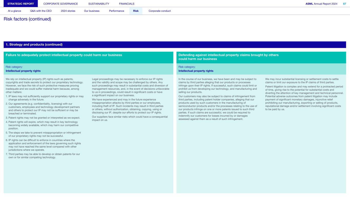 1.战略和产品(续)未能充分保护知识产权可能会损害我们的业务针对他人提出的知识产权索赔进行辩护可能会损害我们的业务风险类别:风险类别:知识产权知识产权我们依靠专利、版权和商业秘密等知识产权(IP)权利来保护我们的专有技术。然而,我们面临此类保护措施被证明不足的风险,我们可能会遭受物质损害,原因之一是:1。知识产权法律可能无法充分支持我们的所有权,或者可能在未来发生不利变化。2.我们与客户、员工和技术开发合作伙伴以及其他人签订的保护我们知识产权的协议(例如保密、许可)可能不够充分,或者可能被违反或终止。3.专利权可能不会像我们预期的那样被授予或解释。4.专利权将到期,这可能导致关键技术变得广泛可用,这可能会损害我们的竞争地位。5.我们为防止盗用或侵犯我们的所有权而采取的措施可能不会成功。6.知识产权可能难以在与我们经营所在的其他司法管辖区相比适用和执行管辖此类权利的法律可能未达到相同水平的国家执行。7.第三方可能能够为我们自己或类似的竞争技术开发或获得专利。可能需要法律诉讼来强制执行我们的知识产权,其有效性和范围可能会受到其他人的质疑。任何此类诉讼都可能导致大量成本和管理资源的转移,并且,如果在诉讼中做出对我们不利的决定,可能会导致大量成本或对我们的业务产生重大影响。我们经历过并可能在未来经历第三方或我们的员工的盗用攻击,包括盗窃IP。此类事件可能导致第三方或其他人未经授权获取、复制、使用或披露我们的知识产权,尽管我们努力保护我们的知识产权。我们的供应商面临类似的风险,这可能会对我们产生相应的影响。在我们的业务过程中,我们一直并且可能会受到第三方的索赔,声称我们的产品或工艺侵犯了他们的知识产权。如果成功,这类索赔可能会限制或禁止我们开发我们的技术,以及制造和销售我们的产品。我们的客户还可能受到第三方(包括专利持有人公司)的侵权索赔,指称此类客户在制造半导体产品和/或与使用我们的产品有关的过程中使用的我们的产品侵犯了颁发给此类第三方的一项或多项专利。如果此类索赔成功,我们可能会被要求赔偿我们的客户因此类侵权行为而遭受的损失或对其评估的损害。我们可能会产生大量的许可或结算成本来解决索赔或限制我们对第三方的知识产权索赔的敞口。专利诉讼复杂,可能会延长一段较长的时间,从而产生潜在的大量成本,并转移关键管理和技术人员的注意力。专利诉讼的潜在不利结果可能包括支付重大金钱损失、禁止我们制造、出口或销售产品的禁令救济、声誉损害和/或涉及我们将支付的重大成本的和解。战略报告公司治理可持续发展财务ASML年度报告202467一览与CEO的问答2024故事我们的业务绩效风险公司行为风险因素(续)