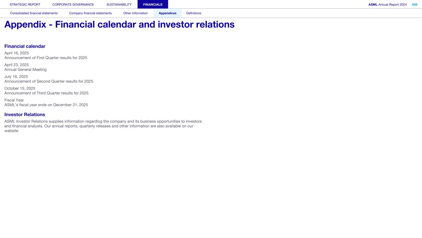 财务日历2025年4月16日公布2025年第一季度业绩2025年4月23日股东周年大会2025年7月16日公布2025年第二季度业绩2025年10月15日公布2025财政年度第三季度业绩公告ASML的财政年度截至2025年12月31日投资者关系ASML投资者关系向投资者和金融分析师提供有关该公司及其商业机会的信息。我们的年度报告、季度发布和其他信息也可在我们的网站上查阅。战略报告公司治理可持续发展财务ASML年度报告2024408合并财务报表公司财务报表其他信息附录定义附录-财务日历与投资者关系