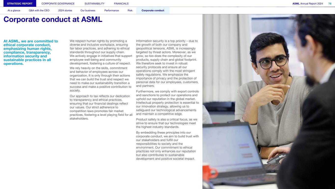 在ASML,我们致力于遵守道德的公司行为,在所有运营中强调人权、合规、透明度、信息安全和可持续实践。我们通过促进多元化和包容性的工作场所、确保公平的劳动实践以及在整个供应链中遵守道德标准来尊重人权。我们积极参与支持员工福祉和社区发展的举措,培养尊重文化。我们在很大程度上依赖于整个组织员工的技能、承诺和行为。只有通过他们的行动,我们才能建立我们所需要的信任和尊重,使我们的可持续发展转型取得成功,并为社会做出积极贡献。我们的税收方法反映了我们对透明度和道德实践的奉献精神,确保我们的金融交易反映我们的价值观。我们对竞争法的严格遵守促进了公平的市场实践,为所有利益相关者营造了公平的竞争环境。信息安全是重中之重——由于我们公司的发展和地缘政治紧张局势,ASML越来越多地成为威胁行为者的目标。此外,随着我们的发展,我们的产品、供应链和全球足迹的复杂性也在增长。因此,我们寻求投资于强大的安全协议,并确保我们的所有运营都符合最严格的安全法规。我们强调隐私的重要性以及对员工、客户和合作伙伴的个人数据保护。此外,我们遵守出口管制和制裁,以保护我们的业务并维护我们在全球市场的声誉。知识产权保护对我们的创新战略至关重要,使我们能够保护我们的技术进步并保持竞争优势。产品安全也是一个关键焦点,因为我们努力确保我们的技术符合最高的行业标准。通过将这些原则嵌入我们的企业行为中,我们旨在与利益相关者建立信任,并履行我们对社会和环境的责任。我们对道德实践的承诺不仅提高了我们的声誉,还有助于可持续发展和积极的社会影响。战略报告公司治理可持续发展财务ASML年度报告2024 78一览与CEO的问答2024故事我们的业务绩效风险公司行为在ASML的公司行为