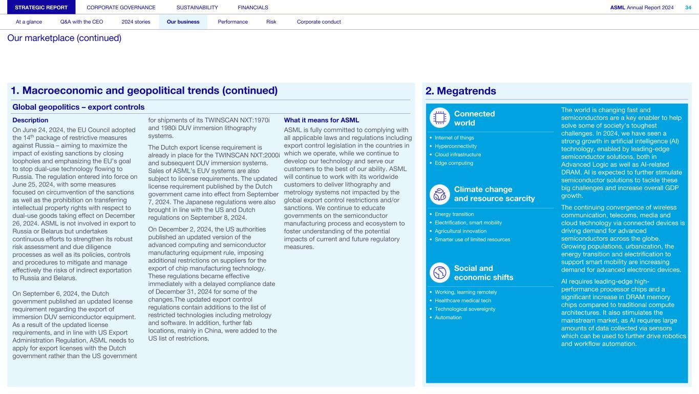 战略报告企业治理可持续发展财务ASML年度报告2024 34一览与CEO的问答2024故事我们的业务绩效风险企业行为我们的市场(续)1。宏观经济和地缘政治趋势(续)全球地缘政治–出口管制说明2024年6月24日,欧盟理事会通过了针对俄罗斯的第14套限制性措施——旨在通过堵住漏洞,最大限度地发挥现有制裁的影响,并强调欧盟的目标是阻止军民两用技术流向俄罗斯。该条例于2024年6月25日生效,部分措施侧重于规避制裁以及禁止转让军民两用商品知识产权的规定于2024年12月26日生效。ASML不涉及对俄罗斯或白俄罗斯的出口,但不断努力加强其稳健的风险评估和尽职调查流程以及政策、控制和程序,以有效减轻和管理对俄罗斯和白俄罗斯的间接出口风险。2024年9月6日,荷兰政府公布了关于浸没式DUV半导体设备出口的更新许可要求。由于更新了许可证要求,并且根据美国出口管理局的规定,ASML需要向荷兰政府而不是美国政府申请出口许可证,以装运其TWINSCAN NXT:1970i和1980i DUV浸没式光刻系统。荷兰对TWINSCAN NXT:2000i和随后的DUV浸入式系统的出口许可要求已经到位。ASML的EUV系统的销售也需遵守许可要求。荷兰政府公布的更新许可要求自2024年9月7日起生效。日本的规定也于2024年9月8日与美国和荷兰的规定保持一致。2024年12月2日,美国当局公布了先进计算和半导体制造设备规则的更新版本,对芯片制造技术出口的供应商施加了额外限制。这些法规立即生效,部分变更的延迟遵守日期为2024年12月31日。更新后的出口管制法规包含对包括计量和软件在内的限制技术清单的补充。此外,主要在中国的更多晶圆厂地点被添加到美国的限制清单中。这对ASML意味着什么ASML充分致力于遵守所有适用的法律法规,包括我们经营所在国家的出口管制立法,同时我们继续开发我们的技术并尽我们所能为我们的客户提供服务。ASML将继续与其全球客户合作,提供不受全球出口管制限制和/或制裁影响的光刻和计量系统。我们继续对各国政府进行半导体制造工艺和生态系统方面的教育,以促进对当前和未来监管措施的潜在影响的理解。2.大趋势世界正在快速变化,半导体是帮助解决一些社会最严峻挑战的关键推动因素。2024年,我们看到人工智能(AI)技术强劲增长,这得益于先进逻辑和人工智能相关DRAM领域的领先半导体解决方案。人工智能有望进一步刺激半导体解决方案应对这些重大挑战,并提高整体GDP增长。无线通信、电信、媒体和云技术通过连接设备的持续融合正在推动全球对先进半导体的需求。不断增长的人口、城市化、支持智能移动的能源转型和电气化正在增加对先进电子设备的需求。AI需要领先的高性能处理器芯片,并且与传统计算架构相比,DRAM存储芯片的数量将大幅增加。它还刺激了主流市场,因为人工智能需要通过传感器收集的大量数据,这些数据可用于进一步推动机器人技术和工作流程自动化。互联世界•物联网•超连接•云基础设施•边缘计算气候变化和资源稀缺•能源转型•电气化、智能移动•农业创新•更智能地使用有限的资源社会和经济转变•远程工作、学习•医疗保健医疗技术•技术主权•自动化