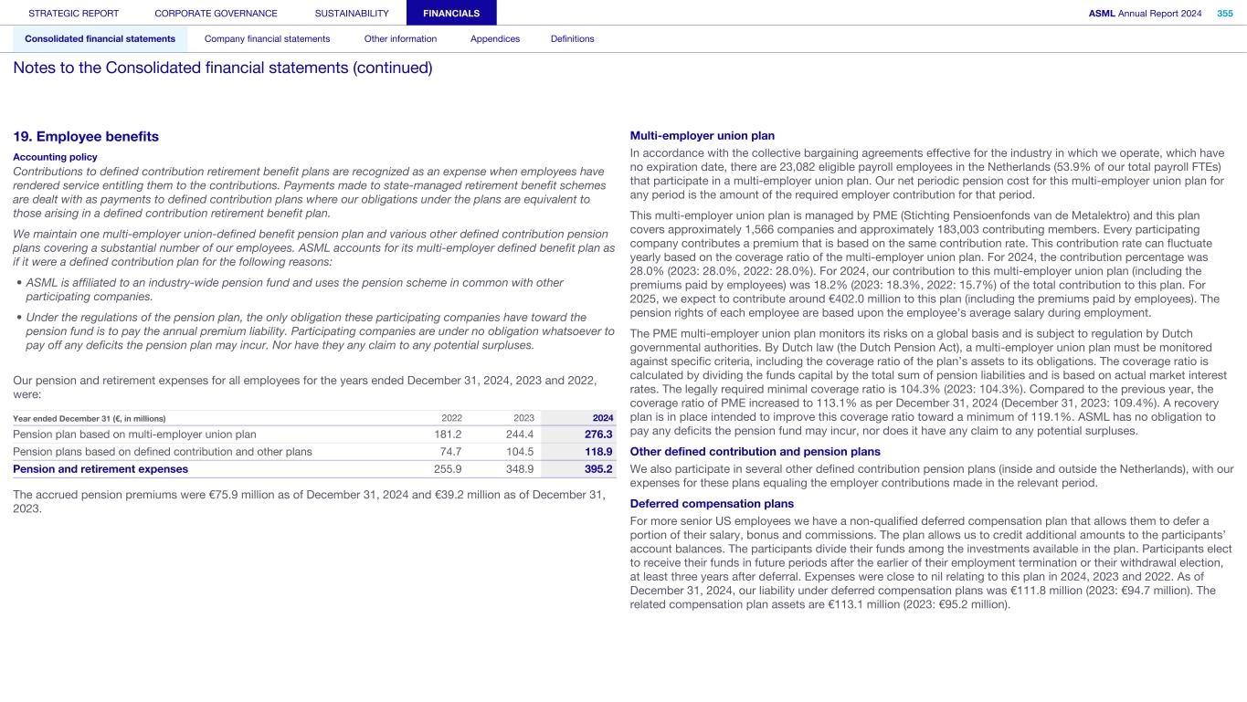 19.雇员福利会计政策对设定供款退休福利计划的供款在雇员提供了使其有权获得供款的服务时确认为费用。向国家管理的退休福利计划支付的款项被视为向固定缴款计划支付的款项,如果我们在这些计划下的义务与在固定缴款退休福利计划中产生的义务相当。我们维持一个多雇主工会固定福利养老金计划和其他各种固定缴款养老金计划,覆盖大量员工。由于以下原因,ASML将其多雇主固定福利计划如同固定缴款计划一样进行会计处理:• ASML隶属于一个全行业的养老基金,并与其他参与公司共同使用该养老金计划。•根据养老金计划的规定,这些参与公司对养老金基金的唯一义务是支付年度保费负债。参与公司没有义务支付养老金计划可能产生的任何赤字。他们也没有声称有任何潜在的盈余。截至2024年12月31日、2023年和2022年12月31日止年度,我们所有员工的养老金和退休费用分别为:截至12月31日止年度(欧元,百万)202220232024基于多雇主工会计划的养老金计划181.2244.42 76.3基于固定缴款和其他计划的养老金计划74.7 104.5 118.9养老金和退休费用255.93 48.93 95.2截至2024年12月31日,应计养老金保费为7590万欧元,截至2023年12月31日为3920万欧元。多雇主工会计划根据对我们经营所在行业有效的集体谈判协议,这些协议没有到期日,荷兰有23,082名符合条件的发薪员工(占我们总发薪FTE的53.9%)参加了多雇主工会计划。我们针对这一多雇主工会计划在任何时期的净定期养老金成本是该时期所需的雇主缴款金额。这个多雇主工会计划由PME(Stichting Pensioenfonds van de Metalektro)管理,该计划涵盖约1,566家公司和约183,003个缴款成员。每一家参与的公司都会贡献一份以相同贡献率为基础的溢价。这一缴费率可以根据多雇主工会计划的覆盖率每年浮动。2024年的贡献百分比为28.0%(2023年:28.0%,2022年:28.0%)。就2024年而言,我们对这一多雇主工会计划的供款(包括雇员支付的保费)为该计划总供款的18.2%(2023年:18.3%,2022年:15.7%)。对于2025年,我们预计将为该计划贡献约4.02亿欧元(包括员工支付的保费)。每名职工的养老金权益,以职工在职期间的平均工资为准。PME多雇主工会计划在全球范围内监控其风险,并受荷兰政府当局的监管。根据荷兰法律(《荷兰养老金法案》),必须根据特定标准对多雇主工会计划进行监测,包括该计划资产与其义务的覆盖率。覆盖率按资金资本除以养老金负债总额计算,以实际市场利率为基础。法定最低覆盖率为104.3%(2023年:104.3%)。与上一年度相比,截至2024年12月31日,PME覆盖率增至113.1%(2023年12月31日:109.4%)。一项复苏计划已经到位,旨在将这一覆盖率提高到最低119.1%。ASML没有义务支付养老基金可能产生的任何赤字,也没有对任何潜在盈余提出任何索赔。其他固定缴款和养老金计划我们还参与了其他几个固定缴款养老金计划(荷兰境内外),我们为这些计划支付的费用等于相关期间的雇主缴款。针对更高级的美国员工的递延薪酬计划我们有一个不合格的递延薪酬计划,允许他们递延一部分工资、奖金和佣金。该计划允许我们将额外金额记入参与者的账户余额。参与者将他们的资金分配给计划中可用的投资。参与者选择在其终止雇用或退出选举中较早者之后的未来期间领取其资金,至少在延期三年后。2024年、2023年和2022年与该计划相关的支出几乎为零。截至2024年12月31日, 我们在递延补偿计划下的负债为1.118亿欧元(2023年:9470万欧元)。相关补偿计划资产为1.131亿欧元(2023年:9520万欧元)。战略报告公司治理可持续发展财务ASML年度报告2024355合并财务报表公司财务报表其他信息附录定义合并财务报表附注(续)