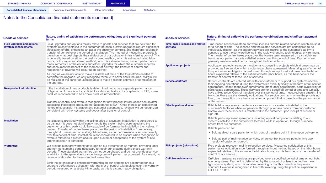 现场升级和选项(系统增强)现场升级和选项主要涉及为客户工厂中已安装的系统交付的商品和服务。某些升级需要大量的安装工作,增强客户控制的资产,因此导致在安装期间的控制权转移。衡量进展的方法是基于最能描述我们在转让控制权方面义务的履行情况。这一般是基于成本发生法,即使用工时估计,或价值转移法,即使用系统性能测量估计。对于客户在交付时刻接受并消费利益的期权及其他升级,控制权转移和收入确认将在交付时发生。只要我们无法对完成升级所需的总努力作出可靠估计,我们只会确认收入以支付所产生的成本。保证金将在我们能够做出可靠估计或完成升级的较早时间实现。新产品介绍如果新产品的安装被确定为不是单独的履约义务,或者如果在FAT上没有充分的既定接受历史,则新产品被视为“新产品介绍”。新产品推出的控制权转移和收入确认发生在SAT成功安装和客户接受之后。一旦有既定的成功安装和客户接受的历史,将在控制权转移后确认与其他系统和货物一致的收入。安装安装在一个系统的售价范围内提供。如果安装不会显着修改正在购买的系统,并且如果需要,客户或第三方可能能够自己进行安装,则该安装被认为是不同的。控制权的转移发生在从通过SAT交付开始的安装期间,以直线为基础衡量,因为我们的业绩在这段时间内平均得到满足。当与系统相关的收入确认发生在安装完成后客户在SAT接受系统时,安装不被视为可区分。保修我们为我们的系统提供12个月的标准保修范围,提供在这些保修期内维修我们系统所需的人工和非消耗性部件。这些标准保修不能购买,并且除了系统将按承诺履行的一般保证之外,不提供服务。因此,这些标准保修没有分配任何收入。我们系统上的延长和增强保证都作为一项单独的履约义务入账,控制权的转移发生在保修期内,以直线法计量,因为这是一项随时可用的义务。货物或服务性质、履行履约义务的时间和重大付款条款——基于时间的许可和相关服务——基于时间的许可涉及软件许可和在一段时间内出售的相关服务。许可证和相关服务不被视为单独可区分,因为支持服务是客户在快速变化的技术环境中继续使用软件许可证的能力不可或缺的一部分。控制权的转移发生在许可期限内,以直线法衡量,因为我们的业绩在这段时间内平均得到满足。付款一般在整个许可期限内分期进行。应用项目应用项目是节点过渡和咨询项目,有时可能在带量采购协议中作为免费服务提供。衡量这一履约义务的满足情况是通过基于所花费的劳动小时数相对于估计的总劳动小时数的输入法进行的,因为这最好地描述了这类服务的控制权转移。服务合同与我们的客户订立服务合同,以支持我们在系统生命周期内持续运营中使用的系统,通常形式为全方位服务协议、有限人力协议、其他劳务协议、零件可用性或零件使用协议。这些服务有一段特定的时间,通常有一个固定的价格。这段时间内的控制权转移,按直线法计量,因为这些是随时可用的债务。对于价格不固定的服务合同,交易价格有一个可变成分,它是基于系统的性能。可计费零件和人工可计费人工代表在运行时为我们安装在客户工厂的系统提供维护服务, 通过我们客户的采购订单。对这些服务的控制在收到客户签字后转移给客户。可结算零件是指通过客户的采购订单,在运行时安装在客户工厂中的与我们的系统相关的光学组件在内的备件。可结算零件可以是:•作为直接备件出售,其控制权转移在交付时指向时间点;或•作为维护服务的一部分出售,其中控制权转移在收到客户签字后指向时间点。外地项目(搬迁)外地项目主要代表搬迁服务。衡量这一履约义务的满足情况是通过基于所花费的劳动小时数相对于估计的总劳动小时数的输入法进行的,因为这最能描述我们服务控制权的转移。OnPulse维护OnPulse维护服务在我们的光源系统上提供特定时间段内的服务。付款由每个光源系统统计的脉冲量决定,这是可变的。开票是根据统计的脉冲每月进行的。收入按照使用EU-IFRS 15.B16中的实用权宜之计开具发票确认。商品或服务的性质、履行履约义务的时间安排和重大付款条件战略报告公司治理可持续发展财务ASML年度报告2024337合并财务报表公司财务报表其他信息附录定义合并财务报表附注(续)