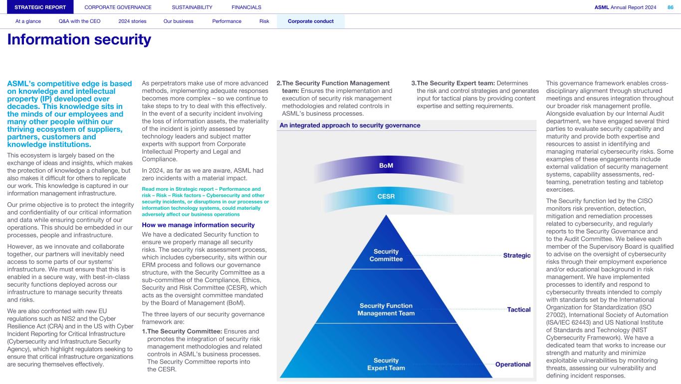 ASML的竞争优势是基于数十年发展起来的知识和知识产权(IP)。这些知识存在于我们的员工和我们蓬勃发展的供应商、合作伙伴、客户和知识机构生态系统中的许多其他人的脑海中。这个生态系统很大程度上是基于思想和见解的交流,这使得保护知识成为一项挑战,但也让其他人很难复制我们的工作。这些知识被捕捉在我们的信息管理基础设施中。我们的首要目标是保护我们关键信息和数据的完整性和机密性,同时确保我们业务的连续性。这应该嵌入我们的流程、人员和基础设施中。然而,当我们一起创新和协作时,我们的合作伙伴将不可避免地需要访问我们系统基础设施的某些部分。我们必须确保以安全的方式启用这一功能,在我们的基础设施中部署一流的安全功能,以管理安全威胁和风险。我们还面临着新的欧盟法规,例如NIS2和《网络复原力法案》(CRA),以及美国的关键基础设施网络事件报告(CyberSecurity and Infrastructure Security Agency),这突出了监管机构寻求确保关键基础设施组织有效保护自己。随着肇事者使用更先进的方法,实施适当的应对措施变得更加复杂——因此我们继续采取措施,试图有效地处理这一问题。在发生涉及信息资产损失的安全事件时,事件的重要性由技术领导者和主题专家在企业知识产权和法律与合规的支持下共同评估。据我们所知,2024年,ASML发生了零起具有实质性影响的事件。在战略报告中阅读更多内容–性能和风险–风险–风险因素–网络安全和其他安全事件,或我们的流程或信息技术系统中断,可能会对我们的业务运营产生重大不利影响我们如何管理信息安全我们拥有专门的安全职能,以确保我们妥善管理所有安全风险。包括网络安全在内的安全风险评估流程属于我们的ERM流程,并遵循我们的治理结构。安全委员会是合规、道德、安全和风险委员会(CESR)的一个小组委员会,该委员会担任管理委员会(BoM)授权的监督委员会。我们的安全治理框架的三层是:1.安全委员会:确保并促进将安全风险管理方法和相关控制整合到ASML的业务流程中。安全委员会向CESR报告。2.安全职能管理团队:确保在ASML业务流程中实施和执行安全风险管理方法和相关控制。3.安全专家团队:通过提供内容专业知识和设置需求,确定风险和控制策略并为战术计划生成输入。这一治理框架通过结构化会议实现跨学科一致性,并确保在我们更广泛的风险管理概况中实现整合。除了我们内部审计部门的评估外,我们还聘请了多个第三方来评估安全能力和成熟度,并提供专业知识和资源,以协助识别和管理重大网络安全风险。这些活动的一些例子包括安全管理系统的外部验证、能力评估、重新组队、渗透测试和桌面练习。由CISO领导的安全职能监测与网络安全相关的风险预防、检测、缓解和补救过程,并定期向安全治理和审计委员会报告。我们认为,监事会的每位成员都有资格通过其在风险管理方面的就业经验和/或教育背景就网络安全风险的监督提供建议。我们已经实施了识别和应对网络安全威胁的流程,旨在遵守国际标准化组织(ISO 27002)、国际自动化协会(ISA/IEC 62443)和美国国家标准与技术研究院(NIST网络安全框架)制定的标准。我们有一个专门的团队,致力于通过监测威胁、评估我们的脆弱性和定义事件响应来提高我们的实力和成熟度,并最大限度地减少可利用的漏洞。战略报告企业治理可持续发展财务ASML年度报告202486一览与CEO的问答2024故事我们的业务绩效风险企业行为信息安全