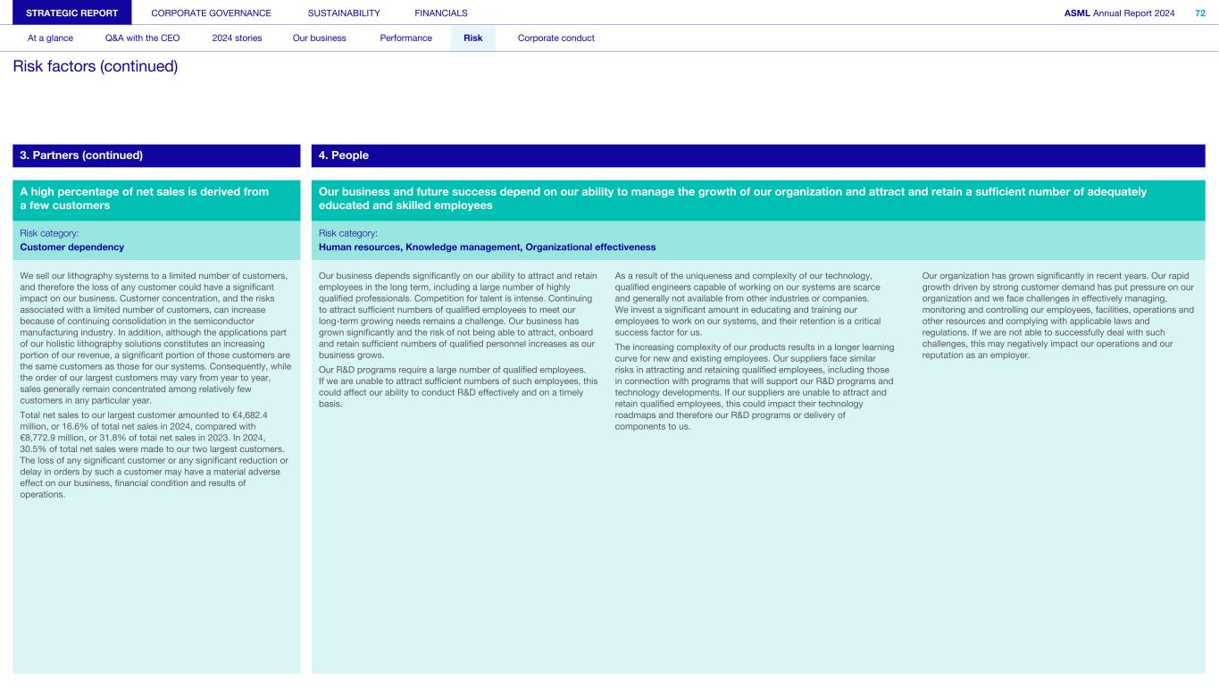 3.合作伙伴(续)4。高比例的净销售额来自少数客户我们的业务和未来的成功取决于我们管理组织增长以及吸引和留住足够数量的受过充分教育和熟练员工的能力风险类别:风险类别:客户依赖人力资源、知识管理、组织效率我们向有限数量的客户销售我们的光刻系统,因此任何客户的流失都可能对我们的业务产生重大影响。客户集中,以及与数量有限的客户相关的风险,可能会因为半导体制造行业的持续整合而增加。此外,尽管我们整体光刻解决方案的应用部分构成了我们收入的越来越大的一部分,但这些客户中有很大一部分是与我们系统的客户相同的客户。因此,虽然我们最大客户的订单每年可能有所不同,但销售通常在任何特定年份仍然集中在相对较少的客户中。对我们最大客户的总净销售额为46.824亿欧元,占2024年总净销售额的16.6%,而2023年为87.729亿欧元,占总净销售额的31.8%。2024年,总净销售额的30.5%是向我们的两个最大客户进行的。任何重要客户的损失或此类客户的订单的任何重大减少或延迟可能会对我们的业务、财务状况和经营业绩产生重大不利影响。我们的业务很大程度上取决于我们长期吸引和留住员工的能力,包括大量高素质的专业人士。人才竞争激烈。继续吸引足够数量的合格员工来满足我们长期增长的需求仍然是一项挑战。我们的业务已显著增长,无法吸引、入职和留住足够数量的合格人员的风险随着我们业务的增长而增加。我们的研发项目需要大量合格的员工。如果我们无法吸引足够数量的这类员工,这可能会影响我们及时有效地进行研发的能力。由于我们技术的独特性和复杂性,能够在我们的系统上工作的合格工程师非常稀缺,并且通常无法从其他行业或公司获得。我们在教育和培训员工在我们的系统上工作方面投入了大量资金,他们的留任对我们来说是一个关键的成功因素。我们产品的日益复杂导致新员工和现有员工的学习曲线变长。我们的供应商在吸引和留住合格员工方面面临类似的风险,包括那些与将支持我们的研发计划和技术开发的计划相关的风险。如果我们的供应商无法吸引和留住合格的员工,这可能会影响他们的技术路线图,从而影响我们的研发计划或向我们交付组件。我们的组织在最近几年有了显著的增长。我们由强劲的客户需求推动的快速增长给我们的组织带来了压力,我们在有效管理、监控和控制我们的员工、设施、运营和其他资源以及遵守适用的法律法规方面面临挑战。如果我们不能成功应对这些挑战,这可能会对我们的运营和我们作为雇主的声誉产生负面影响。战略报告公司治理可持续发展财务ASML年度报告202472与CEO的一览问答2024故事我们的业务绩效风险公司行为风险因素(续)