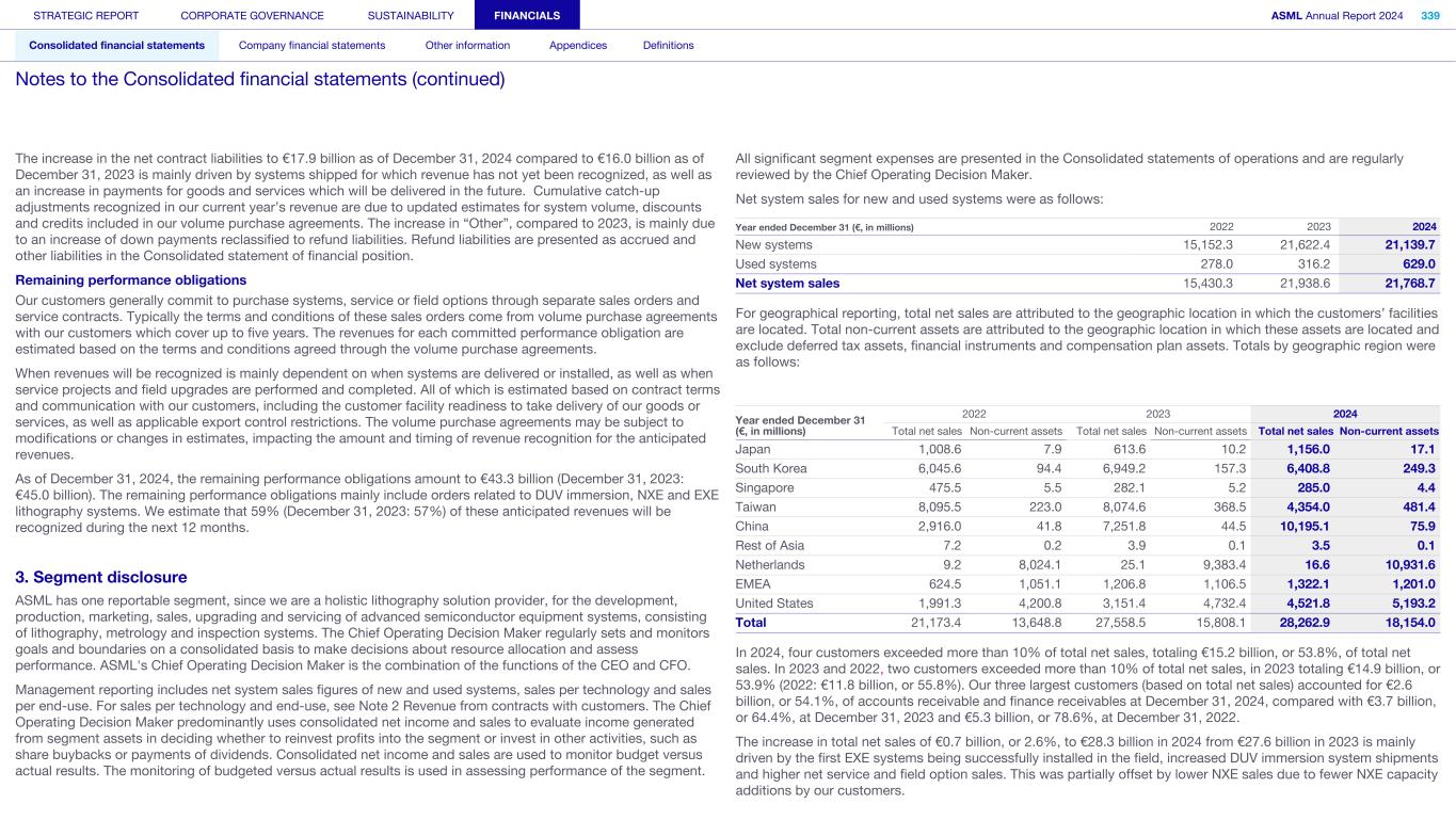 截至2024年12月31日,净合同负债增加至179亿欧元,而截至2023年12月31日为160亿欧元,这主要是由于尚未确认收入的已发货系统,以及将在未来交付的商品和服务的付款增加。我们本年度收入中确认的累计追赶调整是由于我们的批量采购协议中包含的系统数量、折扣和信用的更新估计。与2023年相比,“其他”的增加主要是由于重新分类为退款负债的首付增加。退款负债在综合财务状况表中列报为应计负债和其他负债。剩余履约义务我们的客户通常通过单独的销售订单和服务合同承诺购买系统、服务或现场选项。通常,这些销售订单的条款和条件来自与我们的客户的批量采购协议,涵盖长达五年。每项承诺履约义务的收入是根据通过批量采购协议商定的条款和条件估计的。何时确认收入主要取决于系统何时交付或安装,以及服务项目和现场升级何时执行和完成。所有这些都是根据合同条款和与我们客户的沟通进行估计的,包括客户设施准备接收我们的货物或服务,以及适用的出口管制限制。批量采购协议可能会修改或更改估计,从而影响预期收入的收入确认金额和时间。截至2024年12月31日,剩余履约义务为433亿欧元(2023年12月31日:450亿欧元)。其余履约义务主要包括与DUV浸没式、NXE和EXE光刻系统相关的订单。我们估计,这些预期收入的59%(2023年12月31日:57%)将在未来12个月内确认。3.分部披露ASML设有1个报告分部,由于我们是一家整体光刻解决方案提供商,为先进半导体设备系统的开发、生产、营销、销售、升级和服务,包括光刻、计量和检测系统。首席运营决策者定期在综合基础上设定和监测目标和边界,以做出有关资源分配的决策并评估绩效。ASML的首席运营决策者是CEO和CFO职能的结合体。管理层报告包括新系统和旧系统的净系统销售数字、每项技术的销售额和每项最终用途的销售额。关于每项技术和最终用途的销售额,见附注2与客户签订的合同收入。首席运营决策者主要使用综合净收入和销售额来评估分部资产产生的收入,以决定是否将利润再投资于分部或投资于其他活动,例如股票回购或支付股息。合并的净收入和销售额用于监测预算与实际结果。预算与实际结果的监测用于评估该分部的业绩。所有重大分部费用均在综合经营报表中列报,并由首席经营决策者定期审查。新系统和旧系统的净系统销售额如下:截至12月31日止年度(欧元,单位:百万)202220232024新系统15,152.321,62 2.421,139.7旧系统278.03 16.26 29.0系统净销售额15,430.321,938.621,768.7用于地域报告,总净销售额归因于客户设施所在的地理位置。非流动资产总额归属于这些资产所在的地理位置,不包括递延税项资产、金融工具和补偿计划资产。按地理区域分列的总数为如下:净销售总额非流动资产净销售总额非流动资产净销售总额非流动资产日本1,008.67.96 13.6 10.21,156.01 7.1韩国6,045.69 4.46,949.2157.36,408.82 49.3新加坡475.55.528 2.15.2285.0 4.4台湾8,095.52 23.08,074.63 68.54,354.04 81.4中国2,916.04 1.87,251.84 4.510,195.17 5.9亚洲其他地区7.2 0.2 3.9 0.1 3.5 0.1荷兰9.28,0 24.125.19,383.4 16.610,931.6欧洲、中东和非洲624.51,051.11,206.81,106.51,322.11,201.0美国1,991.34,200.83,151.44,73 2.44,521.85,193.2合计21,173.413,6百万)2022202320242024年,有四个客户超过了总净销售额的10%,总计152亿欧元,占总净销售额的53.8%。2023年和2022年,有两个客户超过总净销售额的10%, 2023年总额149亿欧元,或53.9%(2022年:118亿欧元,或55.8%)。截至2024年12月31日,我们的三个最大客户(基于总净销售额)的应收账款和应收融资款为26亿欧元,占比54.1%,而2023年12月31日为37亿欧元,占比64.4%,2022年12月31日为53亿欧元,占比78.6%。总净销售额从2023年的276亿欧元增长到2024年的283亿欧元,增长了7亿欧元,即2.6%,这主要是由于首批EXE系统成功安装在现场、DUV浸没式系统出货量增加以及净服务和现场选项销售额增加。这部分被由于我们的客户增加的NXE产能减少而导致的NXE销售额下降所抵消。战略报告公司治理可持续发展财务ASML年度报告2024339合并财务报表公司财务报表其他信息附录定义合并财务报表附注(续)