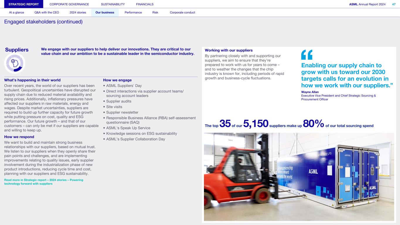 供应商我们与供应商合作,帮助交付我们的创新成果。它们对我们的价值链以及我们成为半导体行业可持续领导者的雄心至关重要。他们的世界正在发生的事情近年来,我们供应商的世界一直动荡不安。由于材料供应减少和价格上涨,地缘政治的不确定性扰乱了我们的供应链。此外,通胀压力影响了我们的原材料、能源和工资供应商。尽管市场存在不确定性,但供应商需要为未来增长进一步建设能力,同时对成本、质量和ESG绩效施加压力。我们未来的增长——以及我们客户的增长——只有在我们的供应商有能力并且愿意跟上的情况下才能满足。我们如何应对我们希望与我们的供应商建立并保持牢固的业务关系,建立在相互信任的基础上。当供应商公开分享他们的痛点和挑战时,我们会听取他们的意见,并且正在实施与质量问题相关的改进,在新产品推出的工业化阶段早期供应商参与,减少周期时间和成本,与我们的供应商进行规划以及ESG可持续性。在战略报告中阅读更多– 2024年故事–与供应商一起推动技术向前发展,我们如何参与• ASML供应商日•通过供应商客户团队/采购客户负责人进行直接互动•供应商审计•现场访问•供应商通讯•负责任的商业联盟(RBA)自我评估问卷(SAQ)• ASML的供应商合作日战略报告公司治理可持续性财务知识会• ASML年度报告202447与首席执行官的问答一目了然2024年故事我们的业务绩效风险公司行为通过合作与我们的供应商进行了利益相关者(续)的合作与我们的供应商密切合作并为其提供支持,我们的目标是确保他们准备好在未来几年与我们合作——并经受住芯片行业众所周知的变化,包括快速增长和商业周期波动时期。使我们的供应链能够与我们一起朝着2030年的目标发展,这要求我们与供应商合作的方式发生变化。”Wayne Allan执行副总裁兼首席战略采购和采购官我们5,150家供应商中排名前35位的供应商占我们采购总支出的80%