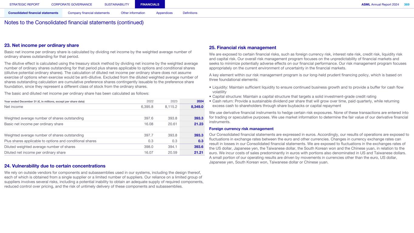 23.每股普通股净收入每股普通股基本净收入的计算方法是用净收入除以该期间已发行普通股的加权平均数。稀释效应是使用库存股法计算的,方法是将净收益除以该期间已发行普通股的加权平均数加上适用于期权和有条件股份的股份(稀释性潜在普通股)。每股普通股摊薄净收益的计算并不假设在行使期权具有反稀释性的情况下行使期权。从稀释加权平均流通股数计算中排除的是可向优先股基金会或有发行的累计优先股,因为它们代表的是与普通股不同类别的股票。每股普通股基本和摊薄净收益计算如下:截至12月31日止年度(欧元,百万,每股数据除外)202220232024净收益6,395.88,115.28,349.0加权平均已发行股份数397.63 93.83 93.3基本每股普通股净收益16.08 20.61 21.23加权平均已发行股份数397.73 93.83 93.3加上适用于期权和有条件股份的股份0.3 0.3 0.3稀释加权平均股份数398.03 94.13 93.6稀释后每股普通股净收益16.07 20.59 21.2124。某些集中导致的漏洞我们依赖外部供应商提供我们系统中使用的组件和子组件,包括其设计,每个组件都是从单一供应商或数量有限的供应商处获得的。我们对有限的一组供应商的依赖涉及几个风险,包括可能无法获得所需组件的充足供应、对定价的控制减少,以及这些组件和子组件交付不及时的风险。25.金融风险管理我们面临一定的金融风险,如外汇风险、利率风险、信用风险、流动性风险和资金风险。我们的整体风险管理计划侧重于金融市场的不可预测性,并力求最大限度地减少对我们财务业绩的潜在不利影响。我们的风险管理计划适当侧重于当前金融市场的不确定性环境。我们风险管理计划中的一个关键要素是我们长期坚持的审慎融资政策,该政策基于三个基本要素:•流动性:保持充足的流动性,以确保业务持续增长,并为现金流波动提供缓冲•资本结构:维持以稳固的投资级信用评级为目标的资本结构•现金回报:提供可持续的每股股息,该股息将随着时间的推移而增长,按季度支付,同时通过股票回购或资本偿还将多余的现金返还给股东我们使用衍生金融工具来对冲某些风险敞口。这些交易都不是为了交易或投机目的而进行的。我们使用市场信息来确定我们的衍生金融工具的公允价值。外汇风险管理我们的合并财务报表以欧元表示。因此,我们的经营业绩受到欧元与其他货币汇率波动的影响。货币汇率的变化可能导致我们的合并财务报表出现亏损。我们面临美元、日元、台币、韩元和人民币相对于欧元汇率波动的风险。我们主要以欧元支付销售成本,部分也以美元和台币计价。我们的经营业绩有一小部分是由欧元、美元、日元、韩元、台币或人民币以外的货币的变动所驱动的。战略报告公司治理可持续发展财务ASML年度报告2024369合并财务报表公司财务报表其他信息附录定义合并财务报表附注(续)