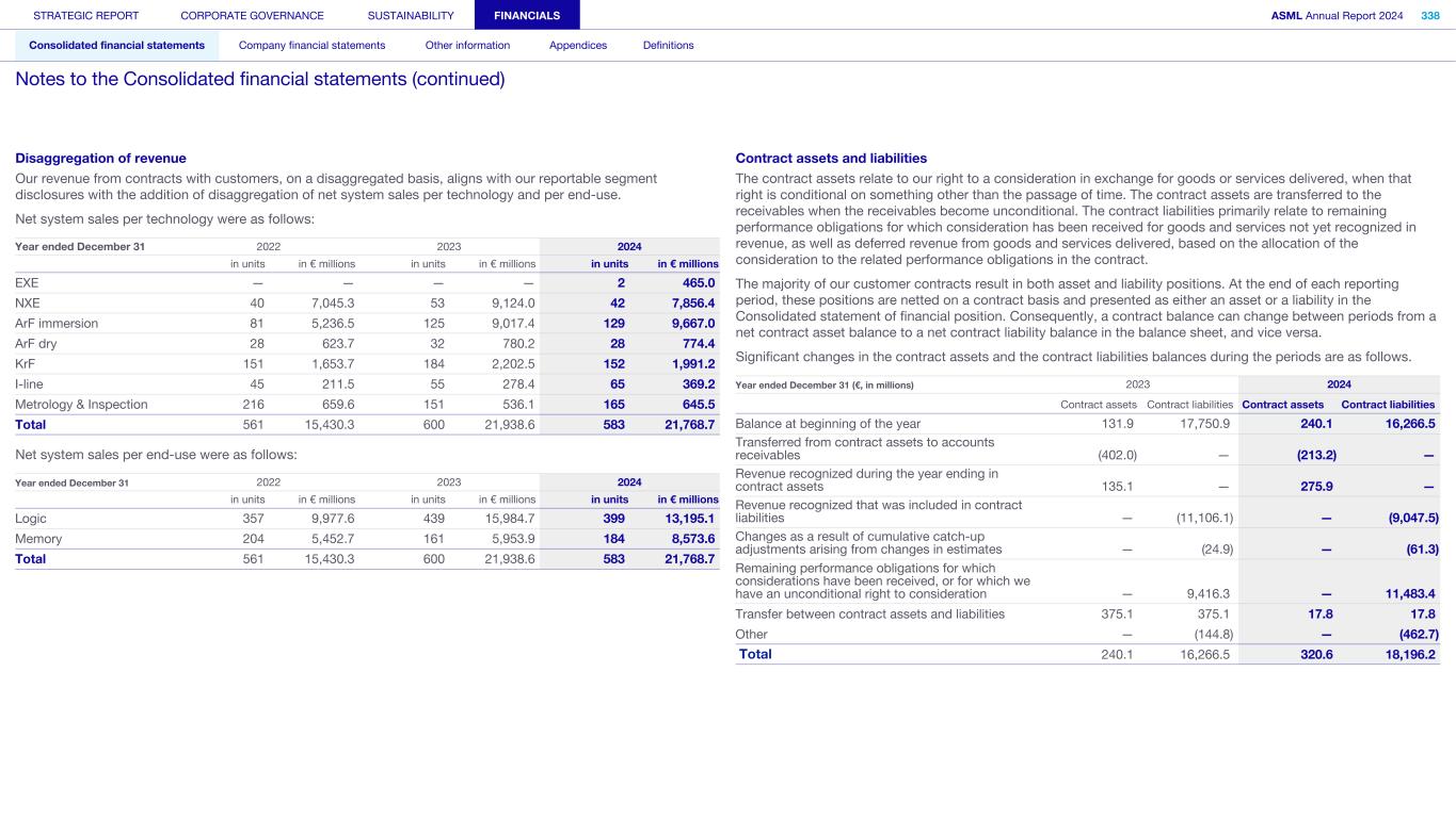 收入分类我们与客户签订的合同收入在分类基础上与我们的可报告分部披露保持一致,增加了每项技术和每项最终用途的净系统销售额分类。每项技术的系统净销售额如下:截至2022年12月31日止年度202220232024以百万欧元为单位以百万欧元为单位EX ———— 2465.0 NXE 407,045.3539,124.0427,856.4 ArF浸入式815,236.5 1259,017.4 1299,667.0 ArF dry 28623.73 2780.22 8774.4 KrF 1511,653.7 1842,202.5 1521,991.2 I-line 45211.555278.465369.2计量与检测216659.6151536.116565.5总计56115,430.360021,938.658321,768.7每个最终用途的系统净销售额为如下:截至2022年12月31日止年度202220232024单位欧元百万单位欧元百万单位欧元逻辑3579,977.643915,984.7 39913,195.1内存2045,452.71615,953.9 1848,573.6合计56115,430.360021,938.658321,768.7合同资产和负债合同资产与我们获得对价以换取交付的商品或服务的权利有关,当该权利以时间流逝以外的事情为条件时。合同资产在应收款成为无条件时转入应收款。合同负债主要涉及已收到尚未在收入中确认的货物和服务的对价的剩余履约义务,以及根据对合同中相关履约义务的对价分配而产生的已交付货物和服务的递延收入。我们的大多数客户合同都导致资产和负债头寸。在每个报告期末,这些头寸按合同为基础进行净额结算,并在综合财务状况表中作为资产或负债列报。因此,合同余额可以在不同期间从资产负债表中的净合同资产余额变为净合同负债余额,反之亦然。期间合同资产及合同负债余额的重大变动情况如下。截至12月31日止年度(欧元,百万)20232024合同资产合同负债合同资产合同负债年初余额131.917,750.92 40.116,266.5从合同资产转入应收账款(402.0)—(213.2)—期末在合同资产中确认的收入135.1 — 275.9 —计入合同负债的确认收入—(11,106.1)—(9,047.5)因估计变动产生的累计追缴调整而发生的变动—(24.9)—(61.3)已收到对价的剩余履约义务,或我们对其拥有无条件对价权利— 9,416.3 — 11,483.4合同资产与负债之间的转移375.13 75.1 7.81 7.8其他—(144.8)—(462.7)合计240.116,266.53 20.618,196.2战略报告公司治理可持续发展财务ASML 2024338年度报告合并财务报表公司财务报表其他信息附录定义合并财务报表附注(续)