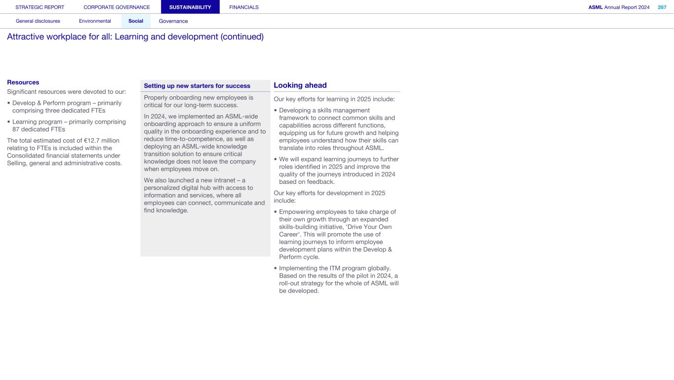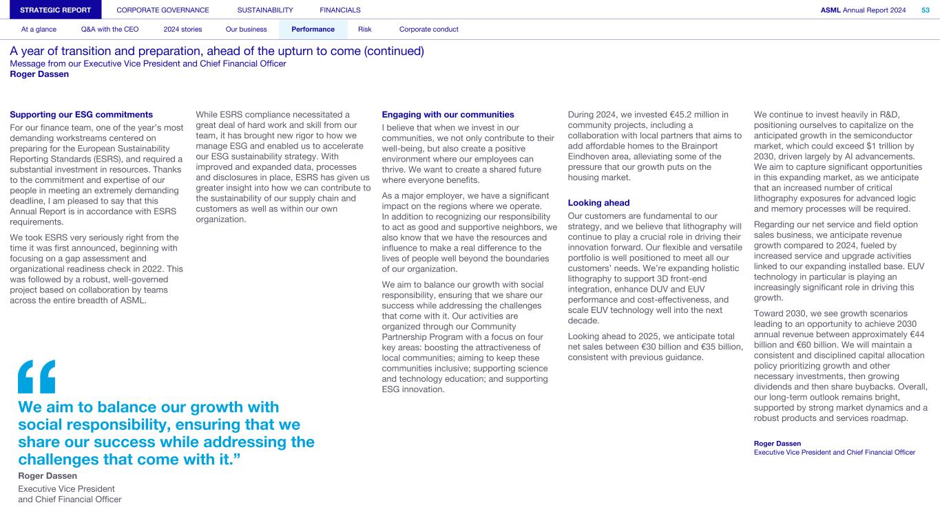 支持我们对财务团队的ESG承诺,这是今年最苛刻的工作流程之一,其核心是为欧洲可持续发展报告标准(ESRS)做准备,需要对资源进行大量投资。由于我们的员工在满足极其苛刻的最后期限方面的承诺和专业知识,我很高兴地说,这份年度报告符合ESRS的要求。从ESRS首次宣布时起,我们就非常认真地对待它,从2022年专注于差距评估和组织准备情况检查开始。紧随其后的是一个强大、管理良好的项目,该项目基于ASML整个广度的团队的协作。虽然ESRS合规需要我们团队付出大量努力和技能,但它为我们管理ESG的方式带来了新的严谨性,并使我们能够加速我们的ESG可持续发展战略。随着数据、流程和披露的改进和扩展到位,ESRS让我们更深入地了解如何为我们的供应链和客户以及我们自己的组织内的可持续性做出贡献。与我们的社区互动我相信,当我们投资于我们的社区时,我们不仅为他们的福祉做出了贡献,而且还创造了一个积极的环境,让我们的员工能够茁壮成长。我们要创造人人受益的命运共同体。作为一家主要雇主,我们对我们经营所在的地区有着重大影响。除了认识到我们作为善邻和支持邻居的责任外,我们还知道,我们拥有资源和影响力,可以在我们组织的边界之外为人们的生活带来真正的改变。我们的目标是平衡我们的增长与社会责任,确保我们分享我们的成功,同时应对随之而来的挑战。我们的活动通过我们的社区伙伴关系计划组织,重点关注四个关键领域:提高当地社区的吸引力;旨在保持这些社区的包容性;支持科学技术教育;以及支持ESG创新。在2024年期间,我们在社区项目上投资了4520万欧元,其中包括与当地合作伙伴的合作,旨在为Brainport Eindhoven地区增加经济适用房,缓解我们的增长给房地产市场带来的一些压力。展望未来我们的客户是我们战略的基础,我们相信光刻技术将继续在推动他们的创新方面发挥关键作用。我们灵活多样的产品组合能够很好地满足客户的所有需求。我们正在扩展整体光刻技术,以支持3D前端集成,增强DUV和EUV性能和成本效益,并将EUV技术扩展到下一个十年。展望2025年,我们预计总净销售额在300亿欧元至350亿欧元之间,与之前的指引一致。我们继续在研发方面进行大量投资,定位于利用半导体市场的预期增长,到2030年,半导体市场可能会超过1万亿美元,这主要是由人工智能进步推动的。我们的目标是在这个不断扩大的市场中抓住重大机遇,因为我们预计将需要更多用于先进逻辑和内存工艺的关键光刻曝光。关于我们的净服务和现场期权销售业务,我们预计与2024年相比收入将增长,这得益于与我们不断扩大的安装基础相关的服务和升级活动增加。尤其是EUV技术在推动这一增长方面发挥着越来越重要的作用。到2030年,我们看到增长情景带来了实现2030年年收入约440亿欧元至600亿欧元之间的机会。我们将保持一致和有纪律的资本配置政策,优先考虑增长和其他必要的投资,然后是增加股息,然后是股票回购。总体而言,在强劲的市场动态以及稳健的产品和服务路线图的支持下,我们的长期前景依然光明。Roger Dassen执行副总裁兼首席财务官战略报告公司治理可持续财务2024年度报告53与CEO的问答一目了然2024年的故事我们的业务绩效风险公司进行一年的过渡和准备,领先于未来的好转(续)我们的执行副总裁兼首席财务官 Roger Dassen的信息我们的目标是在增长与社会责任之间取得平衡,确保我们在分享成功的同时应对随之而来的挑战。”Roger Dassen执行副总裁兼首席财务官