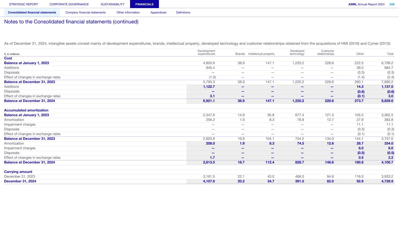 截至2024年12月31日,无形资产主要包括开发支出、品牌、知识产权、已开发技术以及通过收购HMI(2016)和Cymer(2013)获得的客户关系:欧元,单位:百万开发支出品牌知识产权已开发技术客户关系2023年1月1日其他总成本余额4,850.9 38.91 47.11,220.22 28.62 22.56,708.2新增945.4 ———— 39.3984.7处置————(0.3)(0.3)汇率变动的影响(1.0)————(1.4)(2.4)12月31日余额,20235,795.3 38.91 47.11,220.22 28.62 60.17,690.2新增1,122.7 ———— 14.31,137.0处置——————(0.6)(0.6)汇率变动影响3.1 ————(0.1)3.0 2024年12月31日余额6,921.13 8.91 47.11,220.22 28.6 273.78,829.6 1月1日累计摊销余额,20232,347.6 14.995.86 77.41 21.3 105.53,362.5摊销256.2 1.98.376.81 2.72 7.93 83.8减值费用—————— 11.11 1.1处置——————(0.3)(0.3)汇率变动的影响————(0.1)(0.1)12月31日余额,2023,603.8 16.8 104.17 54.21 34.01 44.13,757.0摊销208.0 1.98.37 4.51 2.628.73 34.0减值费用—————— 8.08.0处置————(0.5)(0.5)汇率变动影响1.7 ———— 0.5 2.2 2024年12月31日余额2,813.5 18.71 12.48 28.71 46.6 180.84,100.7账面金额2023年12月31日3,191.52 2.14 3.04 66.09 4.61 16.03,933.2 12月31日,20244,107.62 0.23 4.73 91.58 2.09 2.94,728.9战略报告公司治理可持续发展财务ASML年度报告2024346合并财务报表公司财务报表其他信息附录定义合并财务报表附注(续)