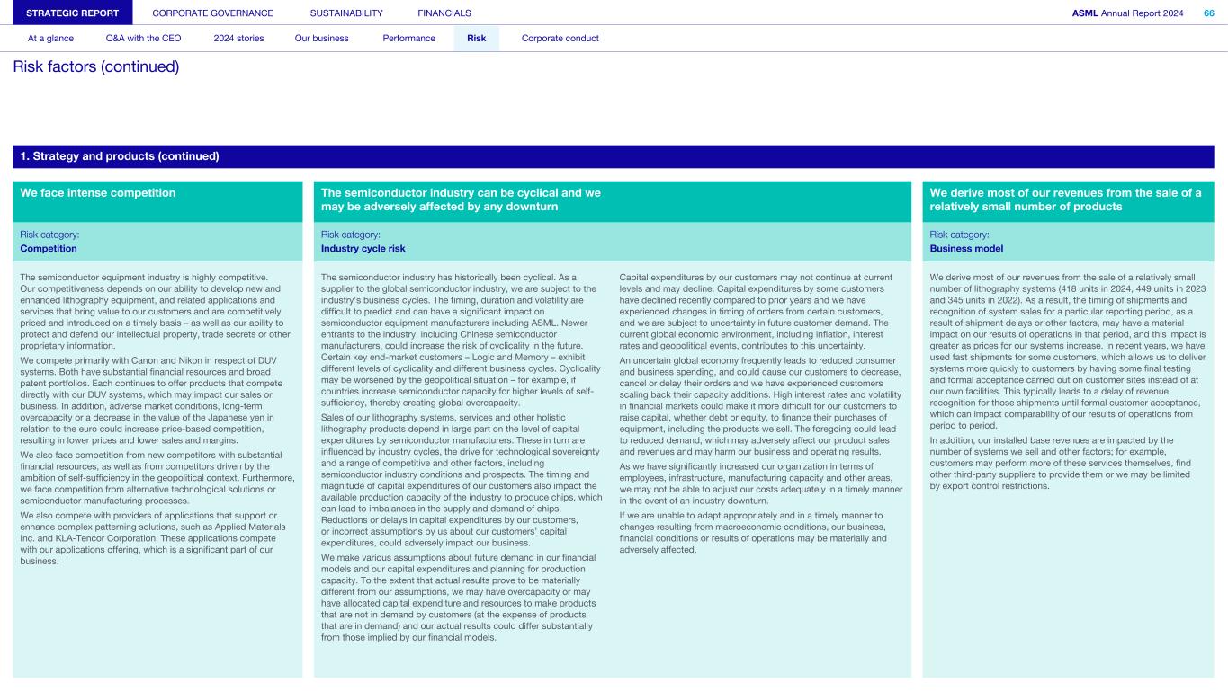 1.战略与产品(续)我们面临激烈的竞争半导体行业可能具有周期性,我们可能会受到任何低迷的不利影响我们的大部分收入来自销售数量相对较少的产品风险类别:风险类别:风险类别:竞争行业周期风险商业模式半导体设备行业竞争激烈。我们的竞争力取决于我们开发新的和增强的光刻设备的能力,以及为我们的客户带来价值并以具有竞争力的价格及时推出的相关应用和服务——以及我们保护和捍卫我们的知识产权、商业秘密或其他专有信息的能力。我们主要在DUV系统方面与佳能和尼康竞争。两者都拥有可观的财政资源和广泛的专利组合。每家公司继续提供与我们的DUV系统直接竞争的产品,这可能会影响我们的销售或业务。此外,不利的市场条件、长期产能过剩或日元相对于欧元的价值下降可能会增加基于价格的竞争,从而导致价格下降、销售额和利润率下降。我们还面临着来自拥有大量财政资源的新竞争对手的竞争,以及来自地缘政治背景下自给自足雄心驱动的竞争对手的竞争。此外,我们还面临着来自替代技术解决方案或半导体制造工艺的竞争。我们还与支持或增强复杂图案化解决方案的应用程序提供商进行竞争,例如应用材料公司和KLA-Tencor公司。这些应用程序与我们的应用程序产品竞争,这是我们业务的重要组成部分。半导体行业历来具有周期性。作为全球半导体行业的供应商,我们受制于行业的景气周期。其时间、持续时间和波动性较难预测,会对包括ASML在内的半导体设备厂商产生重大影响。该行业的新进入者,包括中国半导体制造商,可能会增加未来的周期性风险。某些关键终端市场客户—— Logic和Memory ——表现出不同程度的周期性和不同的商业周期。周期性可能会因地缘政治局势而恶化——例如,如果各国为了更高水平的自给自足而增加半导体产能,从而造成全球产能过剩。我们的光刻系统、服务和其他整体光刻产品的销售在很大程度上取决于半导体制造商的资本支出水平。这些反过来又受到行业周期、对技术主权的驱动以及一系列竞争和其他因素的影响,包括半导体行业状况和前景。我们客户的资本支出的时间和幅度也会影响行业生产芯片的可用产能,这会导致芯片的供需失衡。我们的客户减少或延迟资本支出,或我们对客户资本支出的错误假设,可能会对我们的业务产生不利影响。我们在财务模型中对未来需求做出各种假设,并对产能进行资本支出和规划。如果实际结果证明与我们的假设存在重大差异,我们可能存在产能过剩,或者可能已经分配资本支出和资源来制造客户没有需求的产品(以牺牲有需求的产品为代价),我们的实际结果可能与我们的财务模型所暗示的结果存在重大差异。我们客户的资本支出可能不会继续保持在当前水平,并且可能会下降。近期部分客户的资本支出较往年有所下降,我们经历了某些客户订单时间的变化,我们受制于未来客户需求的不确定性。当前的全球经济环境,包括通货膨胀、利率和地缘政治事件,助长了这种不确定性。不确定的全球经济经常导致消费者和企业支出减少,并可能导致我们的客户减少、取消或延迟他们的订单,我们已经经历了客户缩减他们的产能增加。金融市场的高利率和波动可能会使我们的客户更难筹集资金,无论是债务还是股权,以资助他们购买设备,包括我们销售的产品。上述情况可能导致需求减少,从而可能对我们的产品销售和收入产生不利影响,并可能损害我们的业务和经营业绩。随着我们在员工、基础设施、制造能力等方面显著增加了我们的组织, 在行业不景气的情况下,我们可能无法及时充分调整成本。如果我们无法适当和及时地适应宏观经济状况导致的变化,我们的业务、财务状况或经营业绩可能会受到重大不利影响。我们的大部分收入来自销售数量相对较少的光刻系统(2024年为418台,2023年为449台,2022年为345台)。因此,由于发货延迟或其他因素,在特定报告期内发货的时间和系统销售的确认可能会对我们在该期间的经营业绩产生重大影响,随着我们系统价格的上涨,这种影响会更大。近年来,我们对一些客户使用了快速出货,这使我们能够通过在客户现场而不是在我们自己的设施进行一些最终测试和正式验收,更快地将系统交付给客户。这通常会导致这些发货的收入确认延迟到正式客户接受,这可能会影响我们不同时期经营业绩的可比性。此外,我们的安装基础收入受到我们销售的系统数量和其他因素的影响;例如,客户可能自己执行更多这些服务,找到其他第三方供应商提供它们,或者我们可能受到出口管制限制。战略报告公司治理可持续发展财务ASML年度报告202466与CEO的一览问答2024故事我们的业务绩效风险公司行为风险因素(续)
