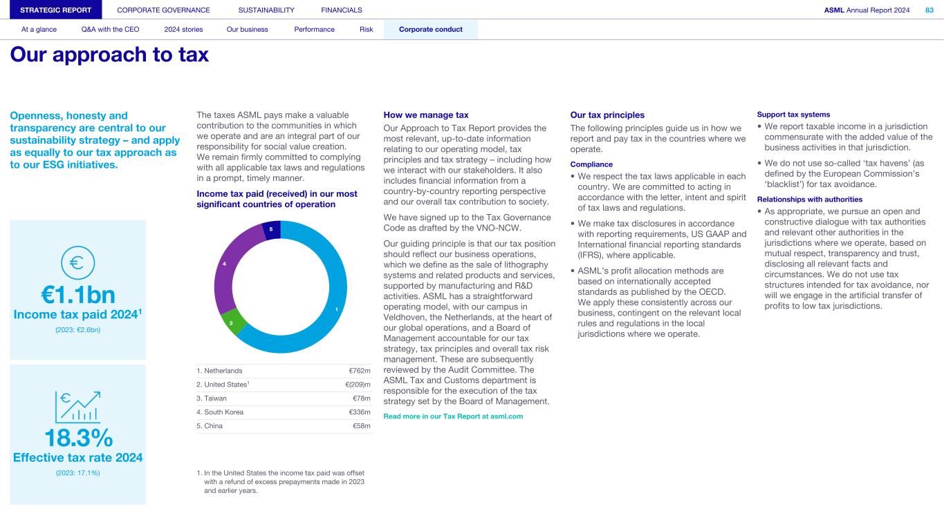 开放、诚实和透明是我们可持续发展战略的核心——同样适用于我们的税务方法以及我们的ESG举措。已交所得税11亿欧元20241年(2023年:26亿欧元)18.3% 2024年有效税率(2023年:17.1%)ASML支付的税款为我们经营所在的社区做出了宝贵贡献,并且是我们创造社会价值责任的组成部分。我们仍然坚定地致力于及时、及时地遵守所有适用的税收法律法规。在我们最重要的业务国家支付(收到)的所得税13451。荷兰7.62亿欧元2。美国1欧元(209)米3。台湾7800万欧元4。韩国3.36亿欧元5。中国5800万欧元1。在美国,支付的所得税被2023年及更早几年的超额预付款退款所抵消。我们如何管理税收我们的税务报告方法提供了与我们的运营模式、税收原则和税收战略相关的最相关的最新信息——包括我们如何与利益相关者互动。它还包括从逐国报告角度的财务信息和我们对社会的整体税收贡献。我们已经签署了VNO-NCW起草的《税收治理守则》。我们的指导原则是,我们的税务状况应反映我们的业务运营,我们将其定义为销售光刻系统及相关产品和服务,并得到制造和研发活动的支持。ASML拥有直截了当的运营模式,我们位于荷兰费尔德霍芬的园区是我们全球业务的核心,管理委员会对我们的税务战略、税务原则和整体税务风险管理负责。这些随后由审计委员会审查。ASML税务和海关部门负责执行管理委员会制定的税务战略。在asml.com上阅读我们的税务报告中的更多信息我们的税务原则以下原则指导我们如何在我们经营所在的国家报告和纳税。合规•我们尊重每个国家适用的税法。我们致力于按照税收法律法规的文字、意图和精神行事。•我们根据报告要求、美国公认会计原则和国际财务报告准则(IFRS)(如适用)进行税务披露。• ASML的利润分配方法基于经合组织(OECD)发布的国际公认标准。我们在我们的业务中始终如一地应用这些,这取决于我们经营所在的当地司法管辖区的相关当地规则和法规。支持税收制度•我们报告一个司法管辖区的应税收入与该司法管辖区的经营活动的增加值相称。•我们不使用所谓的‘避税天堂’(欧盟委员会‘黑名单’定义)来避税。与当局的关系•我们酌情在相互尊重、透明和信任的基础上,与我们经营所在司法管辖区的税务当局和其他相关当局进行公开和建设性对话,披露所有相关事实和情况。我们不会使用旨在避税的税收结构,也不会从事将利润人为转移到低税收管辖区的行为。战略报告公司治理可持续发展财务ASML年度报告202483与CEO的一览问答2024故事我们的业务绩效风险公司行为我们的税收方法