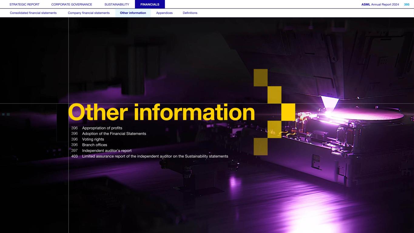 战略报告公司治理可持续发展金融公司ASML年度报告2024395合并财务报表公司财务报表其他信息附录定义其他信息396利润分配396财务报表的采纳396投票权396分支机构397独立审计师的报告403独立审计师对可持续发展报表的有限鉴证报告