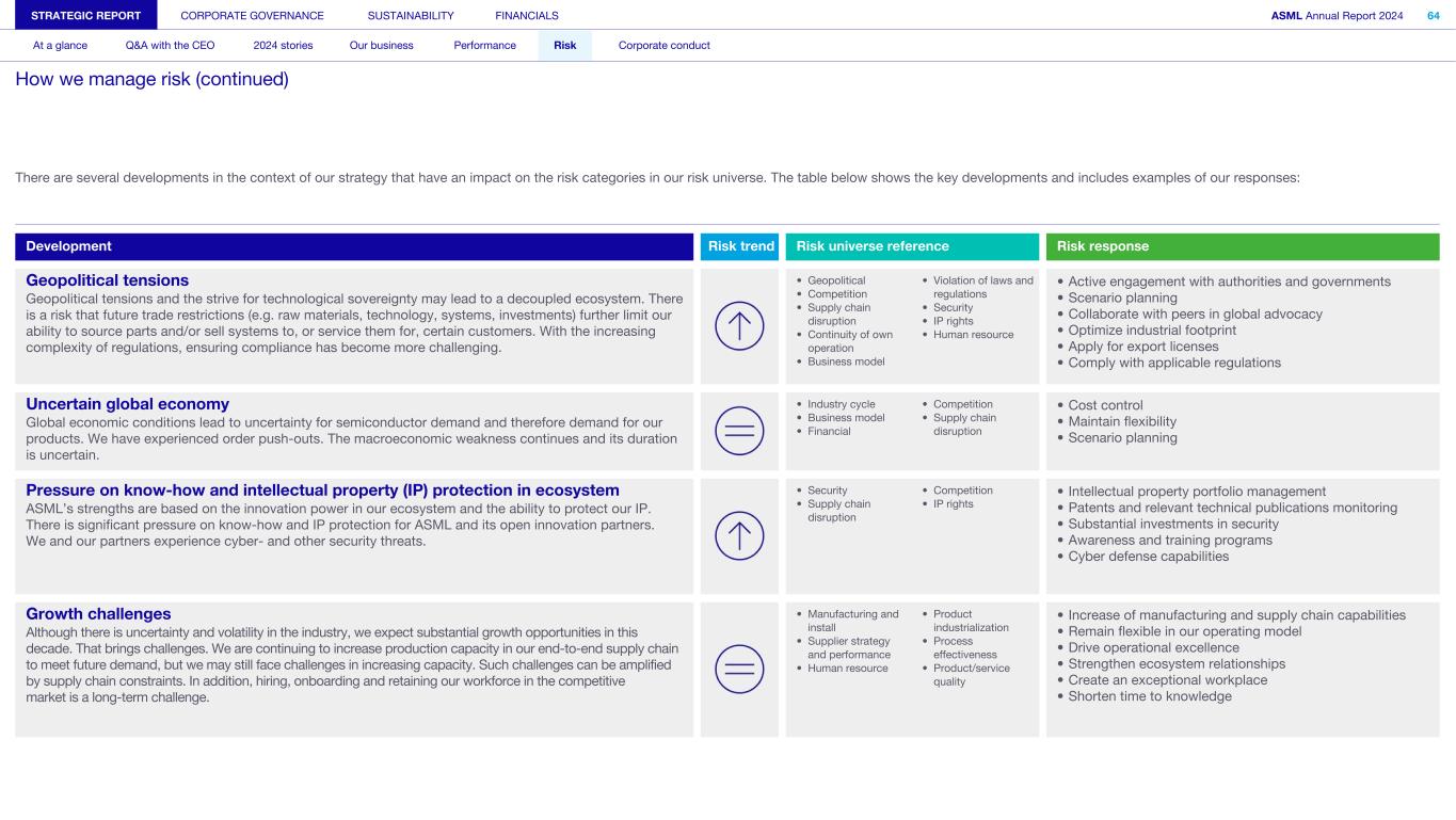 在我们的战略背景下,有几项发展对我们风险领域中的风险类别产生了影响。下表显示了关键进展,并包括我们的应对措施示例:发展风险趋势风险宇宙参考风险应对地缘政治紧张局势•地缘政治•竞争•供应链中断•自身运营的连续性•商业模式•违反法律法规•安全•知识产权•人力资源•与当局和政府积极接触•场景规划•与同行合作开展全球宣传•优化工业足迹•申请出口许可证•遵守适用法规地缘政治紧张局势和争取技术主权可能会导致生态系统脱钩。未来的贸易限制(例如原材料、技术、系统、投资)可能会进一步限制我们向某些客户采购零件和/或销售系统或为其提供服务的能力。随着法规的日益复杂,确保合规变得更具挑战性。不确定的全球经济•行业周期•商业模式•财务•竞争•供应链中断•成本控制•保持灵活性•场景规划全球经济状况导致半导体需求的不确定性,从而导致对我们产品的需求。我们经历过订单推出。宏观经济弱势持续,持续时间不确定。生态系统中的专有技术和知识产权(IP)保护面临压力•安全•供应链中断•竞争•知识产权•知识产权组合管理•专利和相关技术出版物监测•对安全进行大量投资•意识和培训计划•网络防御能力ASML的优势是基于我们生态系统中的创新力量以及保护我们知识产权的能力。对于ASML及其开放创新合作伙伴而言,专有技术和知识产权保护面临重大压力。我们和我们的合作伙伴面临网络和其他安全威胁。增长挑战•制造和安装•供应商战略和业绩•人力资源•产品产业化•工艺效率•产品/服务质量•提高制造和供应链能力•在我们的运营模式中保持灵活性•推动卓越运营•加强生态系统关系•创造卓越的工作场所•缩短了解时间尽管行业存在不确定性和波动性,但我们预计这十年将有巨大的增长机会。这带来了挑战。我们正在继续增加我们端到端供应链的产能,以满足未来的需求,但我们在增加产能方面仍可能面临挑战。供应链限制可能会放大这些挑战。此外,在竞争激烈的市场中招聘、入职和留住我们的员工是一项长期挑战。战略报告公司治理可持续发展财务ASML年度报告202464与CEO的一览问答2024故事我们的业务绩效风险公司行为我们如何管理风险(续)