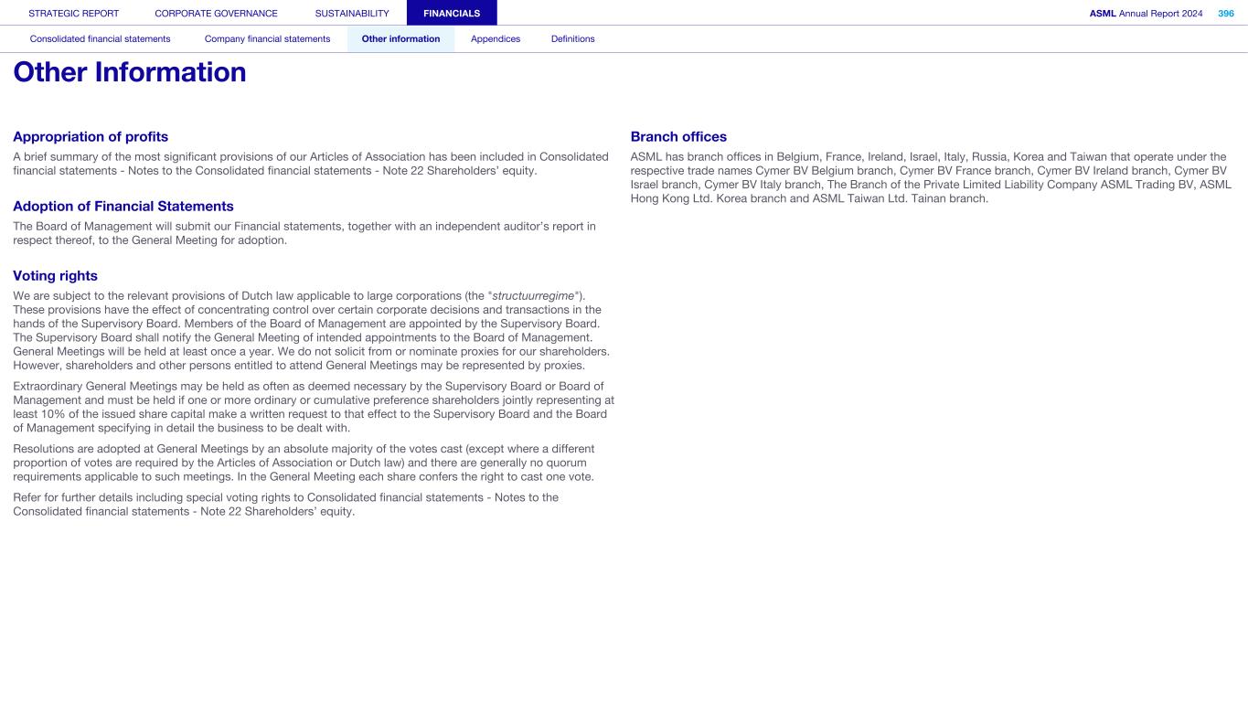 利润分配我们《公司章程》最重要条款的简要摘要已列入合并财务报表-合并财务报表附注-附注22股东权益。采用财务报表管理委员会将把我们的财务报表连同独立核数师的报告提交大会通过。投票权我们受适用于大公司的荷兰法律的相关规定(“结构制度”)的约束。这些规定具有将对某些公司决策和交易的控制权集中在监事会手中的效果。管理委员会成员由监事会任命。监事会应将拟任命的管理委员会成员通知股东大会。每年至少召开一次大会。我们不为我们的股东征集或提名代理人。然而,股东和其他有权出席股东大会的人可以由代理人代表。临时股东大会可以在监事会或管理委员会认为必要时举行,并且必须在一名或多名共同代表至少10%已发行股本的普通或累积优先股股东就此向监事会和管理委员会提出书面请求并详细说明要处理的业务时举行。决议在大会上以所投票数的绝对多数通过(《公司章程》或荷兰法律要求不同比例投票的情况除外),一般不存在适用于此类会议的法定人数要求。在股东大会上,每一股都授予投一票的权利。请参阅更多详情,包括合并财务报表特别表决权-合并财务报表附注-附注22股东权益。分公司ASML在比利时、法国、爱尔兰、以色列、意大利、俄罗斯、韩国和台湾设有分公司,分别以各自的商品名Cymer BV比利时分公司、Cymer BV法国分公司、Cymer BV爱尔兰分公司、Cymer BV以色列分公司、Cymer BV意大利分公司、私人有限责任公司branch of the Private Limited Liability Company丨Trading BV、ASML Hong Kong Ltd.韩国分公司和ASML Taiwan Ltd.台南分公司经营。战略报告公司治理可持续发展财务ASML年度报告2024396合并财务报表公司财务报表其他信息附录定义其他信息