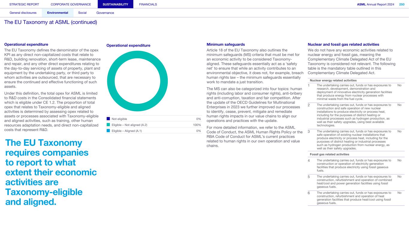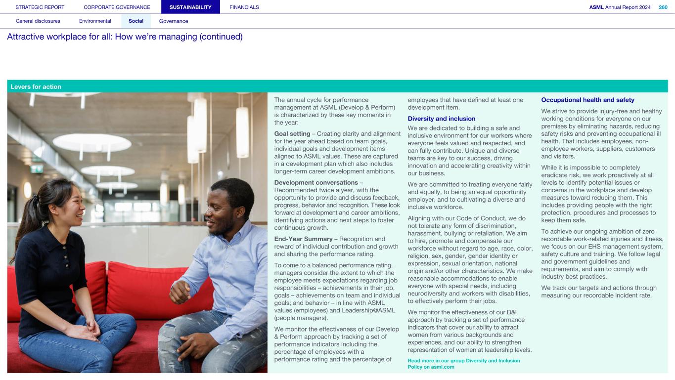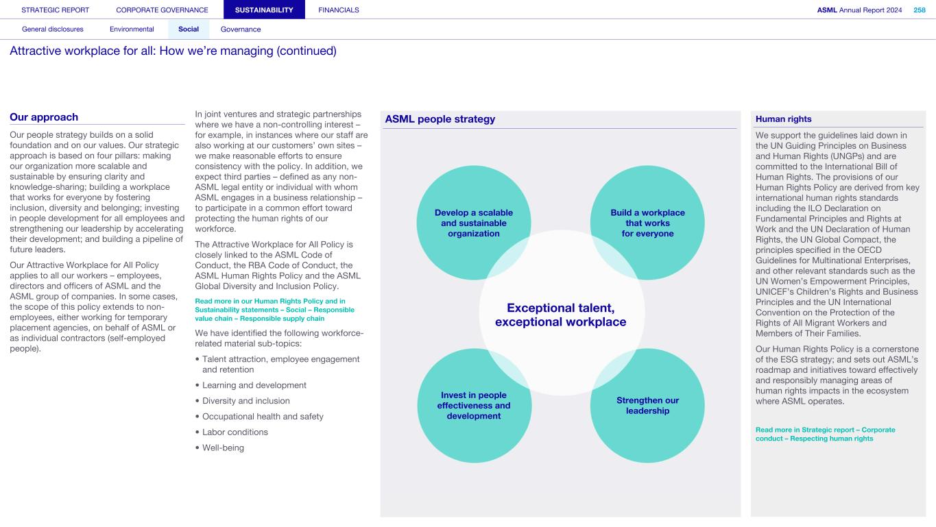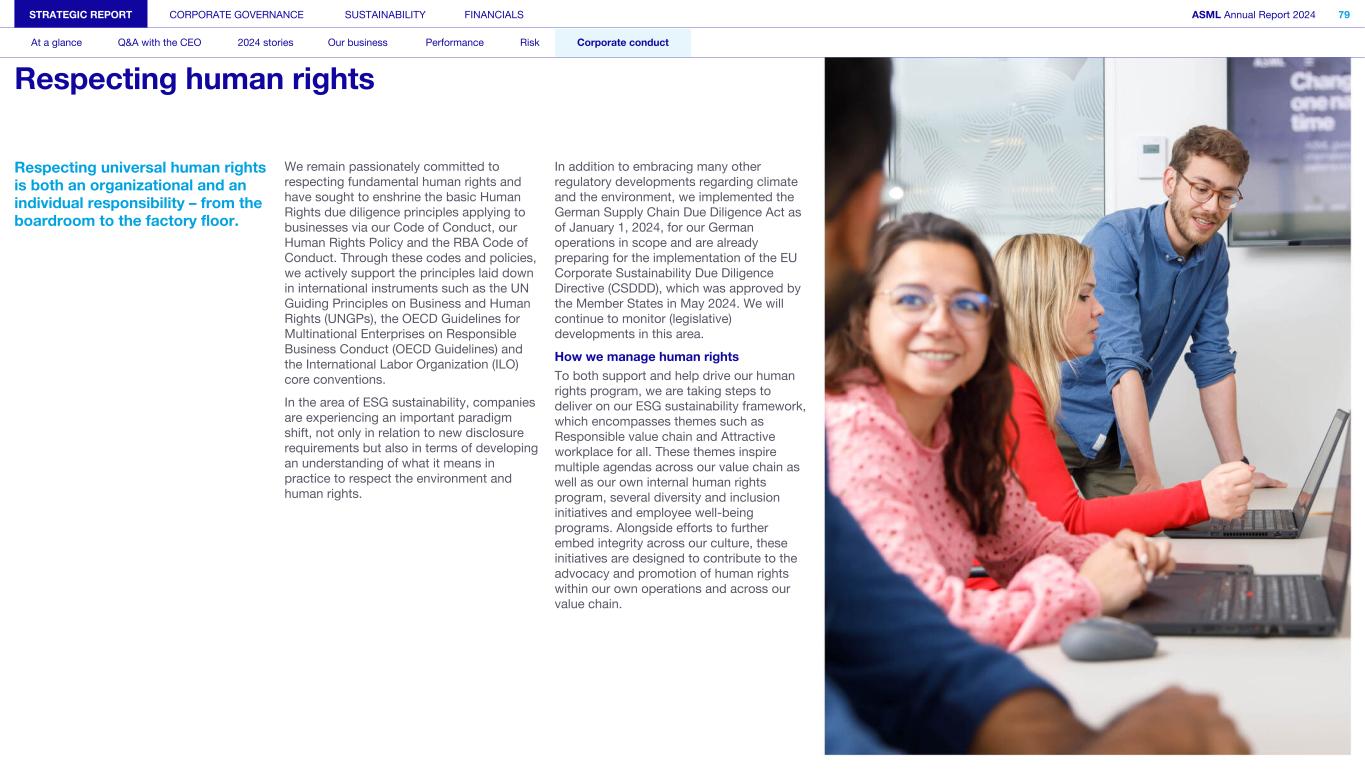 尊重普遍人权既是一种组织责任,也是一种个人责任——从会议室到工厂车间。我们仍然热情地致力于尊重基本人权,并寻求通过我们的行为准则、我们的人权政策和澳洲联储行为准则,将适用于企业的基本人权尽职调查原则纳入其中。通过这些守则和政策,我们积极支持《联合国商业与人权指导原则》(UNGP)、《经合组织跨国企业负责任商业行为准则》(OECD准则)和《国际劳工组织(ILO)核心公约》等国际文书中规定的原则。在ESG可持续发展领域,公司正在经历一场重要的范式转变,这不仅与新的披露要求有关,而且在发展对尊重环境和人权在实践中意味着什么的理解方面。除了接受有关气候和环境的许多其他监管发展外,我们自2024年1月1日起对我们的德国业务实施了德国供应链尽职调查法案,并且已经在为实施欧盟企业可持续发展尽职调查指令(CSDDD)做准备,该指令于2024年5月获得成员国批准。我们将继续监测这方面的(立法)发展。我们如何管理人权以支持和帮助推动我们的人权计划,我们正在采取措施实现我们的ESG可持续发展框架,其中包括负责任的价值链和对所有人都有吸引力的工作场所等主题。这些主题激发了我们整个价值链的多个议程,以及我们自己的内部人权计划、多项多元化和包容性倡议以及员工福利计划。除了努力在我们的文化中进一步嵌入诚信之外,这些倡议旨在为在我们自己的业务中和整个价值链中倡导和促进人权作出贡献。战略报告企业治理可持续发展财务ASML年度报告202479与CEO的一览问答2024故事我们的业务绩效风险尊重人权的企业行为