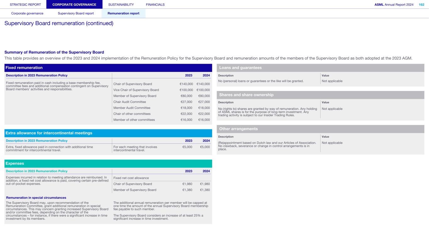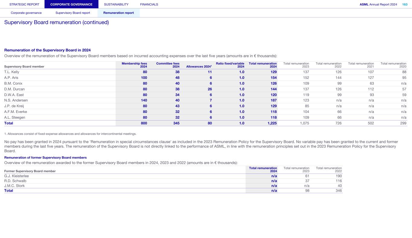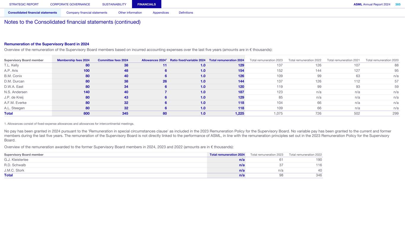 2024年监事会薪酬根据过去五年发生的会计费用计算的监事会成员薪酬概览(金额以千欧元计):监事会成员会员费2024年委员会费用2024年津贴20241固定/可变比率2024年薪酬总额2024年薪酬总额2023年薪酬总额2022年薪酬总额2021年薪酬总额2020 T.L. Kelly 8038111.01 2913712610788 A.P. Aris 1004861.015415214412795 B.M. Conix 804061.01 61099963 n/a D.M. Durcan 8038261.01 4413712611257 D.W.A. East 803461.01 20119999359 N.S. Andersen 1404071.0187123 n/a n/a n/a J.P. de Kreij 804361.01 2985 n/a n/a n/a A.F.M. Everke 803261.01 1810466 n/a n/a A.L. Steegen 803261.01 1810966 n/a n/a total 800345801.01,2251,0757265022991。津贴包括固定费用津贴和洲际会议津贴。根据2023年监事会薪酬政策中包含的“特殊情况下的薪酬条款”,2024年未授予任何薪酬。在过去五年中,没有向现任和前任成员发放浮动薪酬。监事会的薪酬与ASML的绩效不直接挂钩,符合2023年监事会薪酬政策中规定的薪酬原则。2024、2023和2022年度授予前监事会成员的薪酬概览(金额单位:千欧元):监事会成员薪酬总额2024年薪酬总额2023年薪酬总额2022 G.J. Kleisterlee n/a 61190 R.D. Schwalb n/a 37116 J.M.C. Stork n/a n/a 40合计n/a 98346战略报告公司治理可持续财务ASML年度报告2024385合并财务报表公司财务报表其他信息附录定义合并财务报表附注(续)