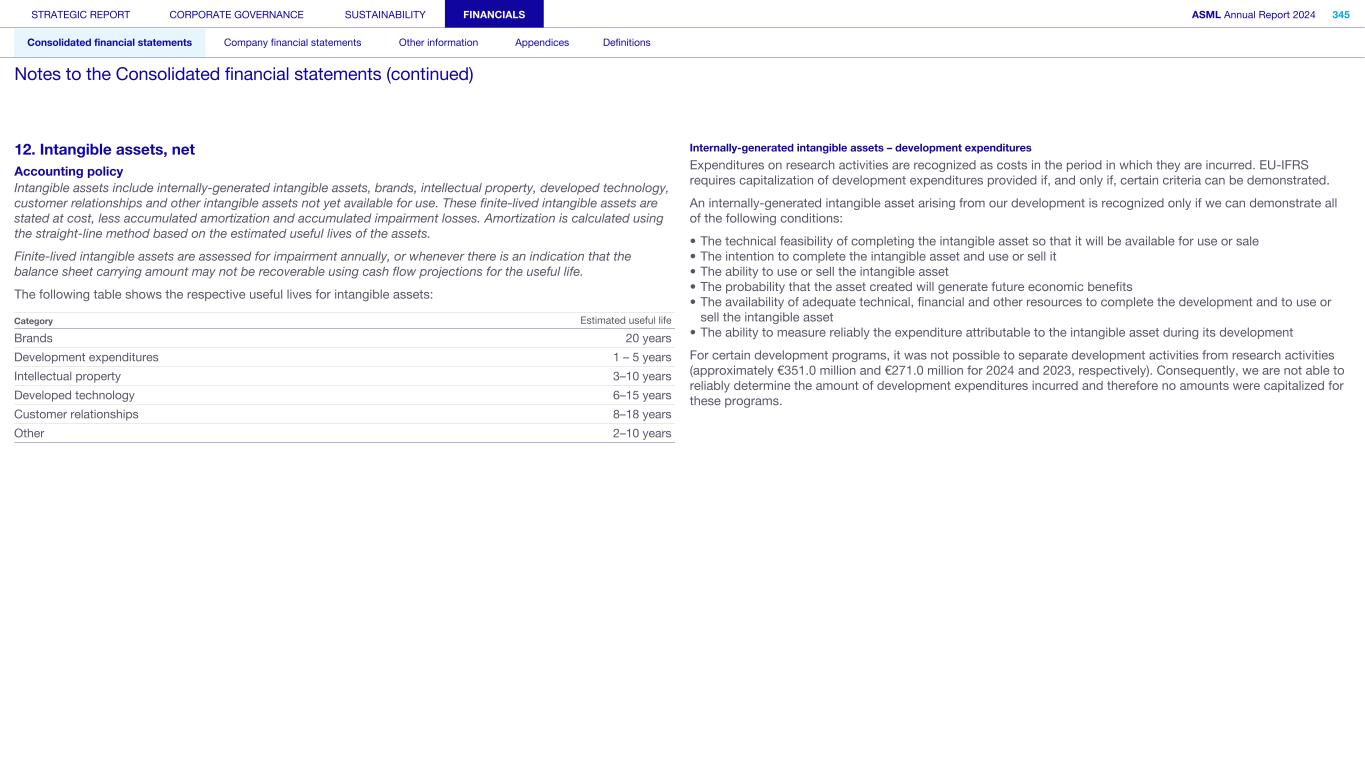 12.无形资产,净值会计政策无形资产包括内部生成的无形资产、品牌、知识产权、已开发技术、客户关系和其他尚不能使用的无形资产。这些使用寿命有限的无形资产按成本减累计摊销和累计减值损失列报。摊销按照资产的预计使用寿命采用直线法计算。使用寿命有限的无形资产每年评估减值,或每当有迹象表明资产负债表的账面值可能无法使用使用寿命的现金流量预测收回时。下表列示了无形资产各自的使用寿命:类别预计使用寿命品牌20年开发支出1 – 5年知识产权3 – 10年开发技术6 – 15年客户关系8 – 18年其他2 – 10年内部生成的无形资产–开发支出研究活动的支出在发生期间确认为成本。EU-IFRS要求,当且仅当某些标准可以证明时,提供的开发支出将资本化。只有当我们能够证明以下所有条件时,我们的开发所产生的内部产生的无形资产才被确认:•完成该无形资产以使其可供使用或出售的技术可行性•完成该无形资产并使用或出售该无形资产的意图•使用或出售该无形资产的能力•所创造的资产产生未来经济利益的概率•可获得足够的技术,财务和其他资源以完成开发并使用或出售该无形资产•能够可靠地计量归属于该无形资产在其开发过程中的支出对于某些开发项目,无法将开发活动与研究活动分开(2024年和2023年分别约为3.51亿欧元和2.71亿欧元)。因此,我们无法可靠地确定发生的开发支出金额,因此没有为这些计划资本化的金额。战略报告公司治理可持续发展财务报告ASML年度报告2024345合并财务报表公司财务报表其他信息附录定义合并财务报表附注(续)