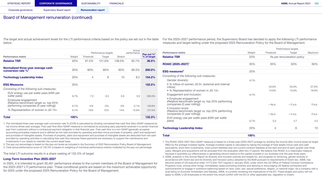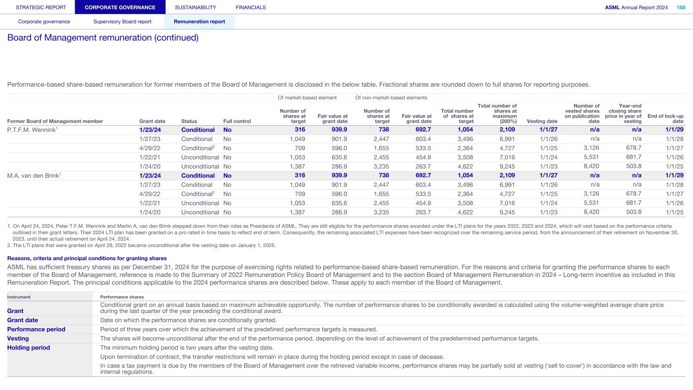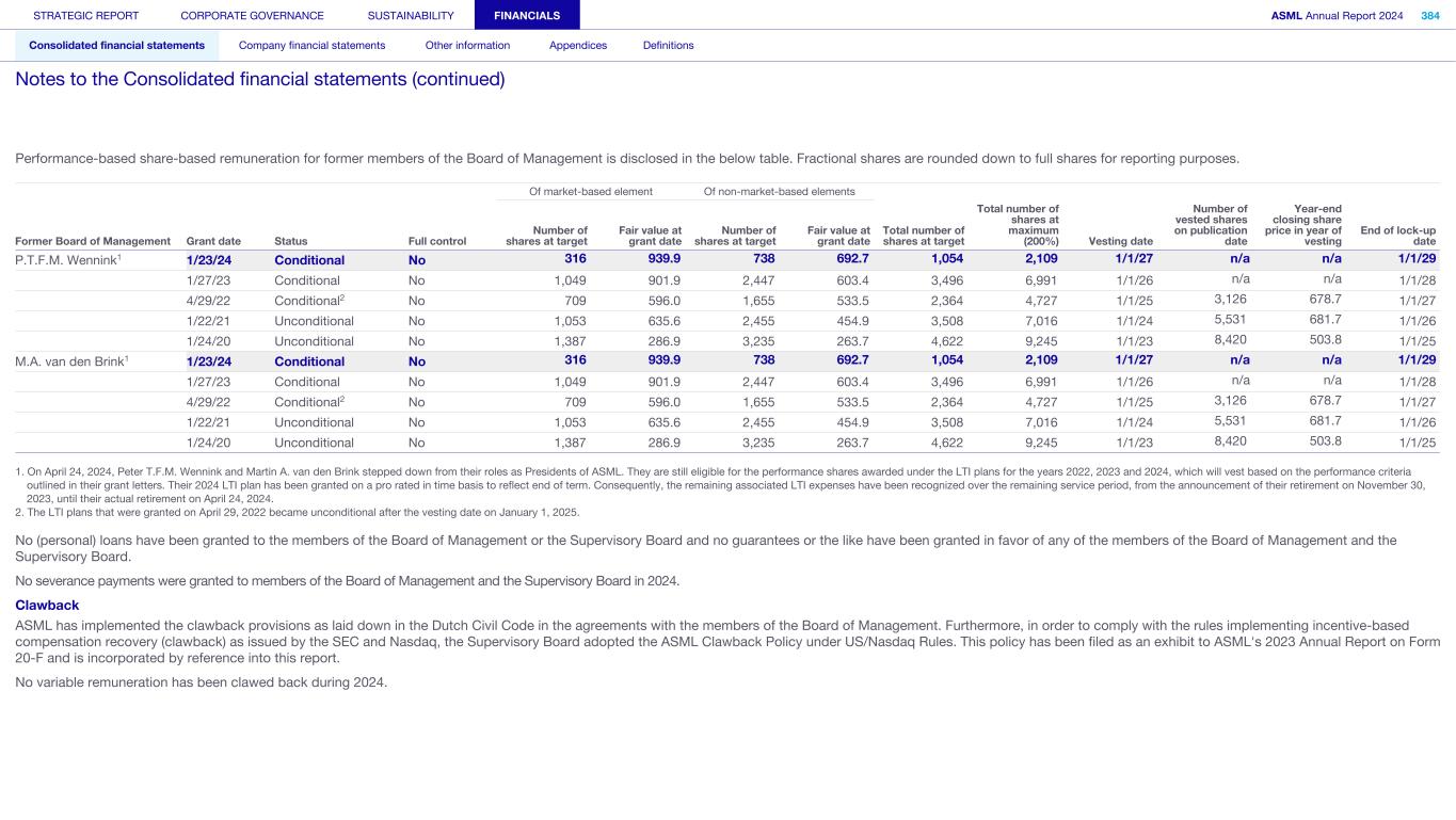 下表披露了管理委员会前成员基于业绩的股份薪酬。为报告目的,零碎股份向下取整为完整股份。非市场化要素的市场化要素前董事会授予日状态完全控制授予日目标公允价值的股份数量授予日目标公允价值的股份数量授予日目标公允价值的股份总数最高股份总数(200%)归属日归属股数公布日归属当年年终收盘股价锁定期结束日期P.T.F.M. Wennink1 1/23/24条件号316939.97 38692.71,0542,1091/1/27 n/a n/a 1/1/291/27/23条件号1,049901.92,447603.43,4966,9911/1/26 n/a n/a 1/284/29/22条件2否709596.01,655533.52,3644,7271/1/253,126678.71/1/271/22/21无条件否1,053635.62,455454.93,5087,0161/1/245,531681.71/1/261/24/20无条件否1,387286.93,235263.74,6229,2451/238,420503.81/1/25M.A. van den Brink1 1/23/24有条件否316939.97 38692.71,0542,1091/1/27 n/a n/a 1/291/27/23有条件否1,049901.92,447603.43,4966,9911/1/26 n/a n/a 1/284/29/22有条件2否709263.7 4,622 9,245 1/1/23 8,420 503.8 1/1/25 1.2024年4月24日,Peter T.F.M. Wennink和Martin A. van den Brink辞去ASML总裁职务。他们仍有资格获得根据LTI计划授予的2022、2023和2024年业绩份额,这些业绩份额将根据其授予函中概述的业绩标准归属。他们的2024年LTI计划已在时间基础上按比例授予,以反映任期结束。因此,剩余的相关LTI费用已在剩余服务期内确认,从2023年11月30日宣布退休,到2024年4月24日实际退休。2.于2022年4月29日授出的LTI计划于2025年1月1日归属日期后成为无条件。没有向管理委员会或监事会成员发放任何(个人)贷款,也没有为管理委员会和监事会的任何成员提供任何担保或类似的担保。2024年没有向管理委员会和监事会成员发放遣散费。回拨ASML已在与管理委员会成员的协议中实施了《荷兰民法典》中规定的回拨条款。此外,为了遵守SEC和纳斯达克发布的实施基于激励的薪酬回收(回拨)的规则,监事会根据美国/纳斯达克规则采用了ASML回拨政策。本保单已作为证据提交给ASML的2020-F表格的2023年年度报告,并以引用方式并入本报告。2024年期间没有任何可变薪酬被收回。战略报告公司治理可持续发展财务ASML年度报告2024384合并财务报表公司财务报表其他信息附录定义合并财务报表附注(续)
