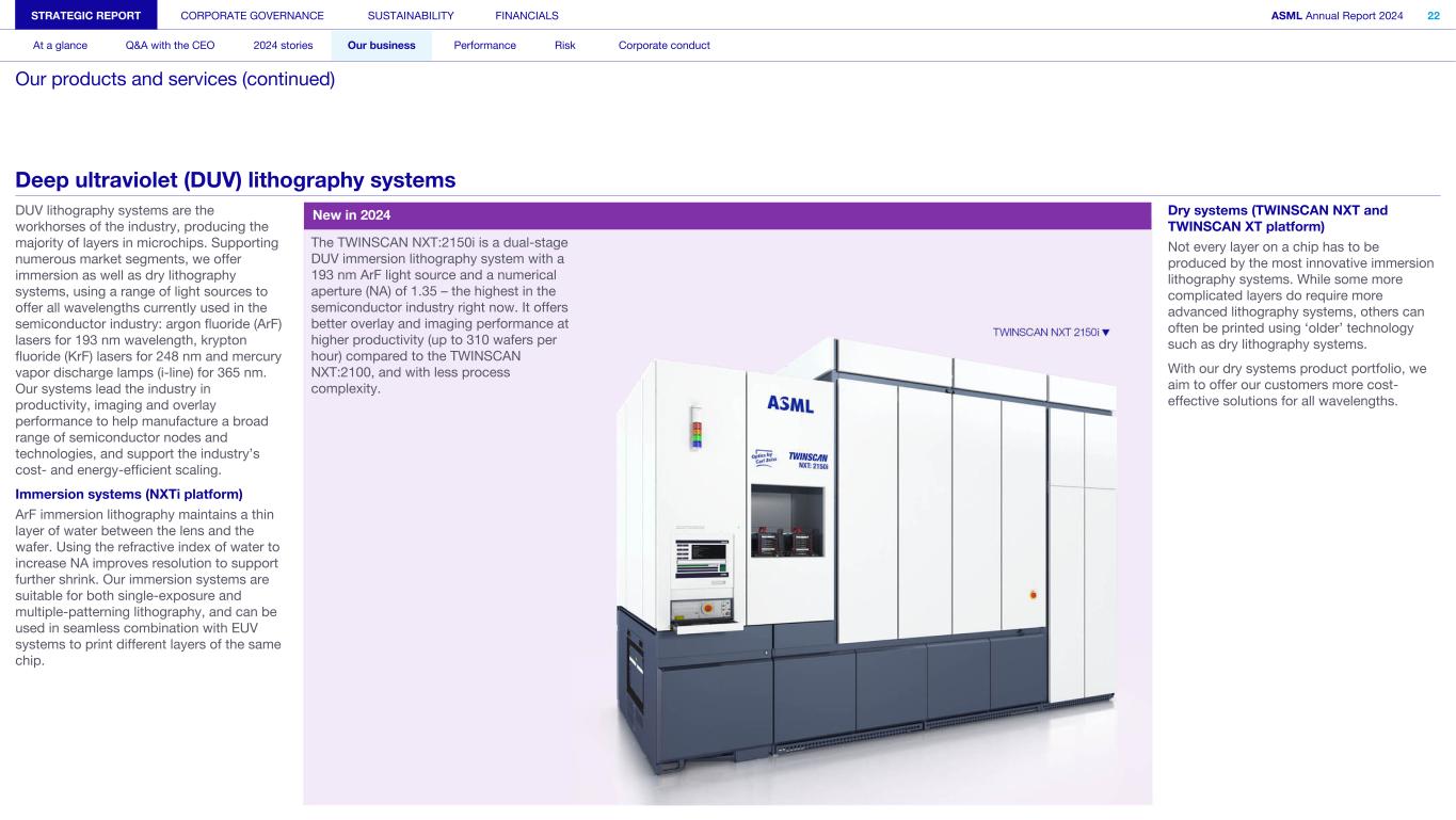 DUV光刻系统是该行业的主力,在微芯片中生产大部分层。支持众多细分市场,我们提供浸没式和干式光刻系统,使用一系列光源提供目前半导体行业使用的所有波长:用于193nm波长的氟化氩(ArF)激光器、用于248nm的氟化氪(KRF)激光器和用于365nm的汞蒸气放电灯(i-line)。我们的系统在生产力、成像和覆盖性能方面领先行业,帮助制造范围广泛的半导体节点和技术,并支持行业的成本和能源效率扩展。浸入科技系统(NXTi平台)ArF浸没式光刻在镜头和晶圆之间保持一层薄薄的水。利用水的折射率提高NA提高分辨率以支持进一步收缩。我们的两种浸入式系统适用于单次曝光和多次图案化光刻,可与EUV系统无缝结合使用,以打印同一芯片的不同层。TWINSCAN NXT:2150i是一款双级DUV浸没式光刻系统,采用193 nm ArF光源,数值孔径(NA)为1.35 ——目前半导体行业最高。与TWINSCAN NXT:2100相比,它在更高的生产率(高达每小时310片晶圆)下提供更好的叠加和成像性能,并且工艺复杂性更低。干式系统(TWINSCAN NXT和TWINSCAN XT平台)并非芯片上的每一层都必须由最具创新性的浸没式光刻系统生产。虽然一些更复杂的图层确实需要更先进的光刻系统,但其他图层通常可以使用干式光刻系统等‘更老’的技术进行打印。凭借我们的干式系统产品组合,我们的目标是为客户提供更具成本效益的全波长解决方案。战略报告企业治理可持续发展财务ASML 2024年度报告22一览CEO问答2024故事我们的业务绩效风险企业行为我们的产品和服务(续)深紫外(DUV)光刻系统2024年新