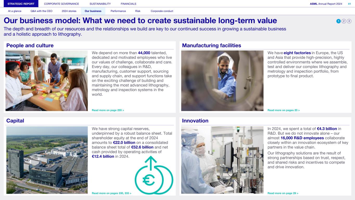 战略报告公司治理可持续发展金融学ASML年度报告2024 41与CEO问答一览2024故事我们的业务绩效风险企业行为我们的商业模式:我们创造可持续长期价值所需要的我们资源的深度和广度以及我们建立的关系是我们在发展可持续业务和采用整体光刻方法方面继续取得成功的关键。人和文化制造设施我们依赖于超过44,000名有才华、敬业和积极进取的员工,他们践行我们的挑战、协作和关怀价值观。每天,我们在研发、制造、客户支持、采购和供应链以及支持职能部门的同事们都承担着建设和维护世界上最先进的光刻、计量和检测系统这一激动人心的挑战。我们在欧洲、美国和亚洲拥有八家工厂,它们提供高精度、高度受控的环境,我们在这些环境中组装、测试和交付我们复杂的光刻、计量和检测产品组合,从原型到最终产品。第255页阅读更多>第20页阅读更多>资本创新我们拥有强大的资本储备,并以稳健的资产负债表为基础。2024年底的股东权益总额为220亿欧元,合并资产负债表总额为526亿欧元,2024年经营活动提供的净现金为124亿欧元。2024年,我们在研发上总共花费了43亿欧元。但我们并不是单独进行创新——我们的近16,000名研发员工在价值链关键合作伙伴的创新生态系统中密切协作。我们的光刻解决方案是基于信任、尊重、分担风险和激励的强大合作伙伴关系的结果,以竞争和推动创新。更多阅读第330、333页>更多阅读第29页>