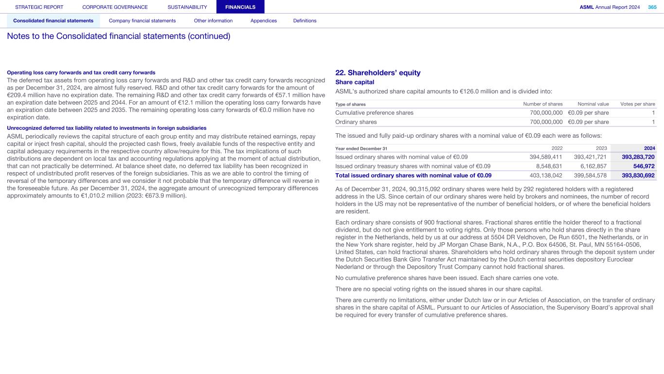 经营亏损结转和税收抵免结转截至2024年12月31日确认的经营亏损结转和研发及其他税收抵免结转的递延所得税资产几乎全部保留。研发和其他税收抵免结转金额为2.094亿欧元,没有到期日。剩余的5710万欧元研发和其他税收抵免结转将在2025年至2044年之间到期。1210万欧元的经营亏损结转到期日在2025年至2035年之间。0.0百万欧元的剩余经营亏损结转没有到期日。与对外国子公司的投资相关的未确认递延所得税负债ASML定期审查每个集团实体的资本结构,并可能分配留存收益、偿还资本或注入新资本,前提是相关实体的预计现金流、可自由支配的资金和相关国家的资本充足率要求允许/要求这样做。此类分配的税收影响取决于实际分配时刻适用的当地税收和会计法规,这实际上无法确定。于资产负债表日,未就境外子公司的未分配利润储备确认递延所得税负债。这是因为我们能够控制暂时性差异的回拨时间,我们认为暂时性差异在可预见的未来回拨的可能性不大。截至2024年12月31日,未确认暂时性差异总额约为10.102亿欧元(2023年:6.739亿欧元)。22.股东权益股本ASML的法定股本为1.26亿欧元,分为:股份种类股份数量每股面值投票累计优先股700,000,000欧元每股0.09欧元1普通股700,000,000欧元每股0.09欧元1已发行每股面值0.09欧元的缴足普通股如下:截至2022年12月31日止年度202220232024已发行普通股面值0.09欧元394,589,411393,421,721393,283,720已发行普通库存股面值0.098,548,6316,162,857546,972已发行普通股总额面值0.09欧元403,138,042399,584,578393,830,692截至2024年12月31日,注册地址在美国的292名登记持有人持有90,315,092股普通股。由于我们的某些普通股由经纪人和被提名人持有,美国记录持有人的数量可能无法代表受益持有人的数量,也无法代表受益持有人的居住地。每股普通股由900股零碎股份组成。零碎股份使其持有人有权获得零碎股息,但不赋予投票权。只有那些在荷兰的股份登记册中直接持有股份的人,由我们在我们地址5504 DR Veldhoven,De Run 6501,the Netherlands持有,或在纽约股份登记册中持有,由JP Morgan Chase Bank,N.A.,P.O. Box 64506,St. Paul,MN 55164-0506,United States持有,才能持有零碎股份。通过荷兰中央证券存管机构Euroclear Nederland维护的荷兰证券银行Giro转让法案下的存款系统或通过存托信托公司持有普通股的股东不能持有零碎股份。未发行累计优先股。每一股有一票表决权。我们股本中的已发行股份并无特别投票权。目前,无论是根据荷兰法律还是在我们的公司章程中,对ASML股本中普通股的转让没有任何限制。按照我司章程,累计优先股的每一次转让均需监事会批准。战略报告公司治理可持续发展财务ASML年度报告2024365合并财务报表公司财务报表其他信息附录定义合并财务报表附注(续)