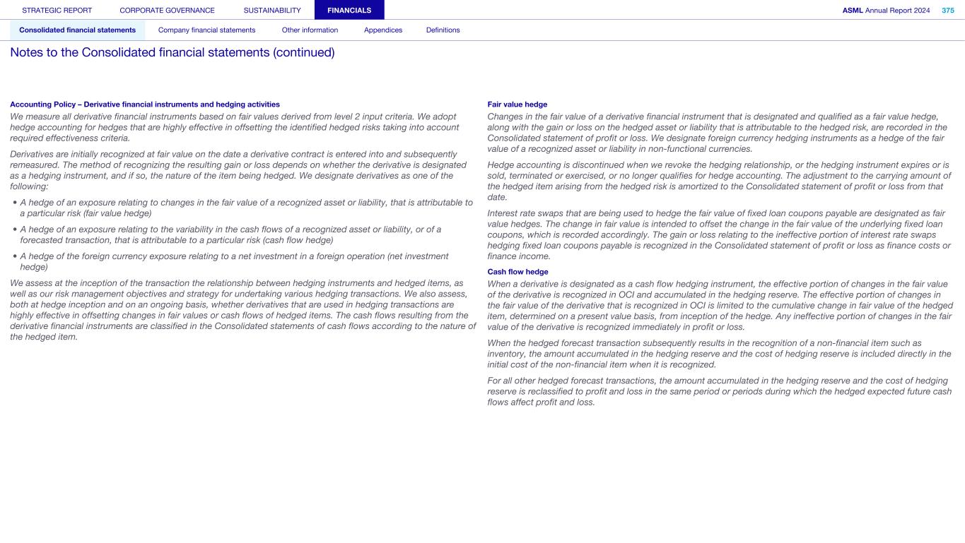 会计政策–衍生金融工具和套期活动我们根据第2级输入标准得出的公允价值计量所有衍生金融工具。我们在考虑到所需有效性标准的情况下,对在抵消已识别的被套期风险方面非常有效的套期采用套期会计。衍生工具最初按订立衍生工具合约之日的公允价值确认,并随后重新计量。确认由此产生的收益或损失的方法取决于衍生工具是否被指定为套期工具,如果被指定为套期工具,则取决于被套期项目的性质。我们将衍生工具指定为以下其中一种:•与已确认资产或负债的公允价值变动相关的、可归因于特定风险的风险敞口的套期保值(公允价值套期保值)•与已确认资产或负债的现金流量的可变性相关的风险敞口的套期保值,或与预测交易相关的风险敞口的套期保值,可归因于特定风险(现金流量套期保值)•与境外经营净投资相关的外汇风险的套期保值(净投资套期保值)我们在交易开始时评估套期工具和被套期项目之间的关系,以及我们进行各种套期保值交易的风险管理目标和策略。我们还评估,无论是在套期开始时还是在持续的基础上,套期交易中使用的衍生工具在抵消被套期项目的公允价值或现金流量变化方面是否非常有效。衍生金融工具产生的现金流量按照被套期项目的性质在合并现金流量表中分类。公允价值套期被指定为公允价值套期的衍生金融工具的公允价值变动,连同归属于被套期风险的被套期资产或负债的利得或损失,计入综合损益表。我们将外币套期保值工具指定为以非功能货币对已确认资产或负债的公允价值进行套期保值。当我们撤销套期关系,或套期工具到期或被出售、终止或行使,或不再符合套期会计条件时,套期会计即被终止。因被套期风险而产生的被套期项目账面值调整自该日起摊销至合并损益表。正在用于对应付固定贷款息票公允价值进行套期保值的利率互换被指定为公允价值套期保值。公允价值变动意在冲抵相关固定贷款息票公允价值变动,相应入账。与利率掉期对冲固定应付贷款息票的无效部分有关的收益或损失在综合损益表中确认为财务成本或财务收入。现金流量套期当衍生工具被指定为现金流量套期工具时,衍生工具公允价值变动的有效部分在其他综合收益中确认,并在套期保值准备金中累计。在OCI中确认的衍生工具公允价值变动的有效部分,限于自套期开始时起按现值基础确定的被套期项目公允价值的累计变动。衍生工具公允价值变动的任何无效部分立即确认为损益。被套期保值的预测交易后续导致确认存货等非金融项目时,套期保值准备金和套期保值准备金成本累计的金额在确认时直接计入该非金融项目的初始成本。对于所有其他被套期的预测交易,在被套期的预期未来现金流量影响损益的同一期间或期间,将套期准备金和套期准备金成本中累计的金额重新分类至损益。战略报告公司治理可持续发展财务ASML年度报告2024375合并财务报表公司财务报表其他信息附录定义合并财务报表附注(续)