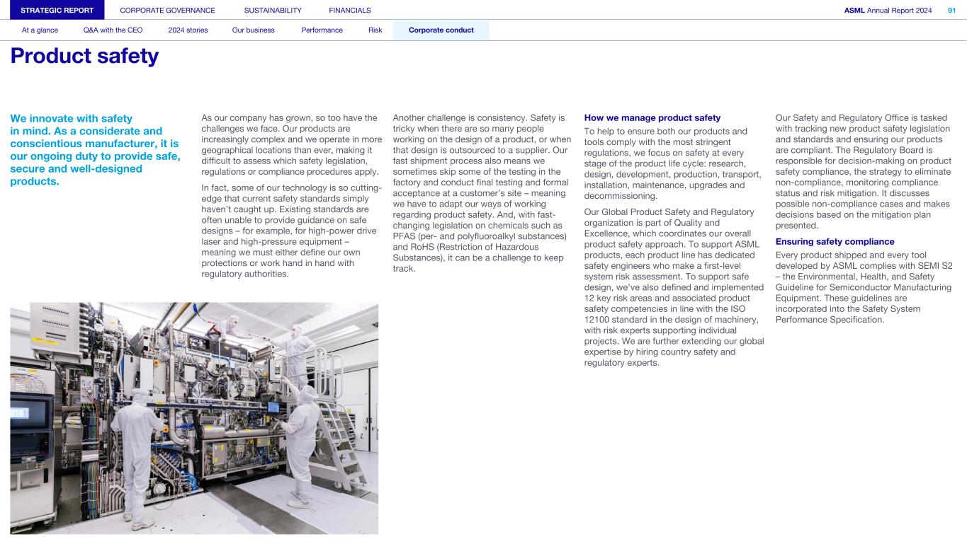 我们创新时考虑到了安全。作为一个体贴和认真的制造商,提供安全、可靠和精心设计的产品是我们持续的责任。随着我们公司的发展,我们面临的挑战也在增长。我们的产品日益复杂,我们在比以往更多的地理位置开展业务,因此很难评估适用哪些安全法规、法规或合规程序。事实上,我们的一些技术是如此尖端,以至于目前的安全标准根本没有赶上。现有标准往往无法为安全设计提供指导——例如,针对大功率驱动激光器和高压设备——这意味着我们必须要么定义我们自己的保护措施,要么与监管机构携手合作。另一个挑战是一致性。当有这么多人从事产品设计工作,或者该设计被外包给供应商时,安全是很棘手的。我们的快速出货流程也意味着我们有时会跳过工厂的一些测试,在客户的现场进行最终测试和正式验收——这意味着我们必须调整关于产品安全的工作方式。而且,随着关于PFAS(全氟和多氟烷基物质)和RoHS(有害物质限制)等化学品的立法快速变化,保持跟踪可能是一项挑战。我们如何管理产品安全以帮助确保我们的产品和工具都符合最严格的规定,我们专注于产品生命周期的每个阶段的安全:研究、设计、开发、生产、运输、安装、维护、升级和退役。我们的全球产品安全和监管组织是质量和卓越的一部分,它协调我们的整体产品安全方法。为ASML产品提供支持,每个产品线都有专门的安全工程师,他们进行一级系统风险评估。为支持安全设计,我们还在机械设计中根据ISO12100标准定义并实施了12个关键风险领域和相关产品安全能力,风险专家为单个项目提供支持。我们正在通过聘请国家安全和监管专家来进一步扩展我们的全球专业知识。我们的安全和监管办公室的任务是跟踪新产品安全立法和标准,并确保我们的产品合规。监管委员会负责就产品安全合规、消除不合规的战略、监测合规状态和风险缓解做出决策。它讨论可能的不遵守情事,并根据提出的缓解计划作出决定。确保安全合规ASML开发的每一款出货的产品和每一种工具都符合SEMI S2 –半导体制造设备的环境、健康和安全指南。这些准则被纳入安全系统性能规范。战略报告企业治理可持续发展财务ASML年度报告202491与CEO的一览问答2024故事我们的业务绩效风险企业行为产品安全