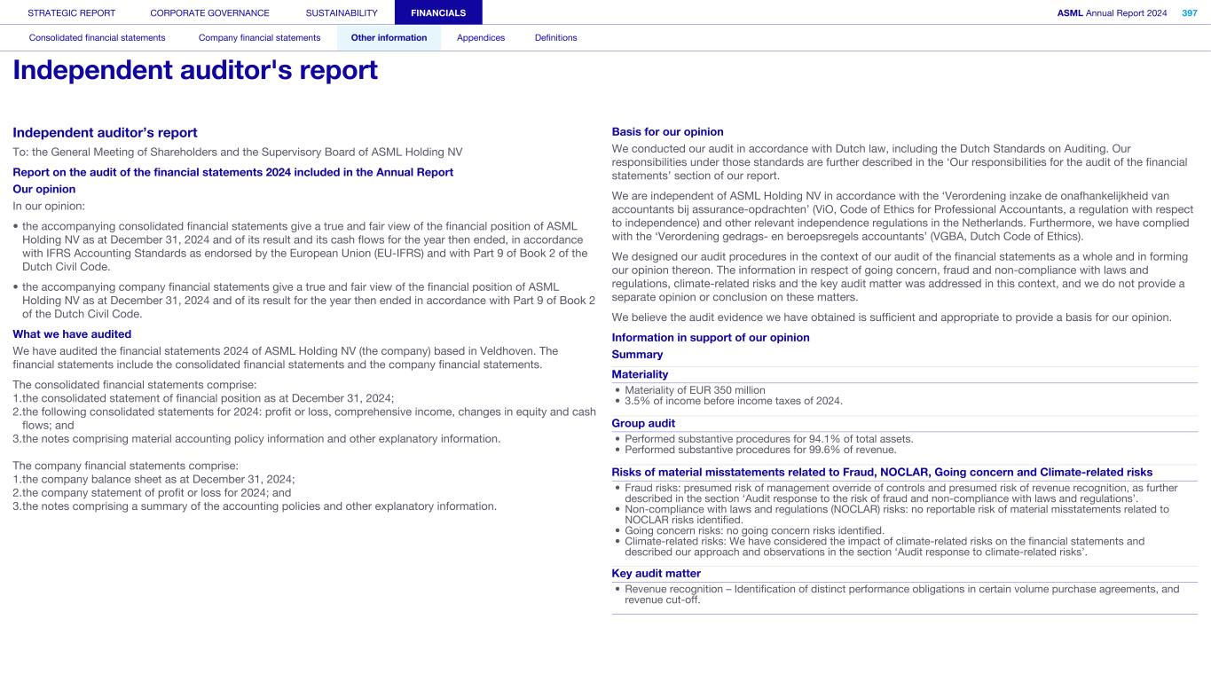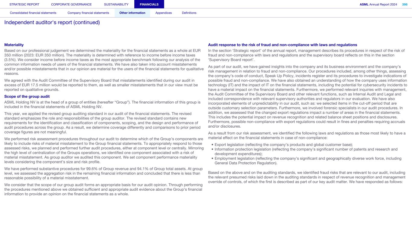 根据我们的专业判断,我们确定财务报表整体的重要性为3.5亿欧元(2023年:3.5亿欧元)。重要性参照所得税前收入(3.5%)确定。我们根据对财务报表使用者共同信息需求的分析,将所得税前收入作为最合适的基准。我们还考虑了我们认为出于定性原因对财务报表使用者具有重大意义的错报和/或可能的错报。我们同意监事会审计委员会的意见,即将向他们报告我们在审计期间发现的超过1750万欧元的错报,以及我们认为必须基于定性理由报告的较小错报。集团审计的范围阿斯麦 NV处于一组实体(以下简称“集团”)的首位。该集团的财务信息包含在阿斯麦 NV的财务报表中。今年,我们在财务报表审计中应用了修订后的集团审计准则。修订后的准则强调了集团审计机构的作用和责任。修订后的标准包含对组成部分的识别和分类、范围界定以及整个集团审计程序的设计和执行的新要求。因此,我们以不同的方式确定覆盖范围,与前期覆盖数字的比较没有意义。我们在整个审计过程中执行了风险评估程序,以确定集团的哪些组成部分可能包括集团财务报表的重大错报风险。为了适当应对那些评估过的风险,我们计划并执行了进一步的审计程序,无论是在组件层面还是在中央。根据集团运营的高度集中化,我们确定了与重大错报风险相关的一个组成部分。作为集团审计员,我们审计了这一部分。我们根据组件的大小和风险状况设置组件性能重要性级别。我们对99.6%的集团收入和94.1%的集团总资产履行了实质性程序。在集团层面,我们评估了剩余财务信息中的聚合风险,得出的结论是,出现重大错报的可能性低于合理水平。我们认为,我们集团审计的范围构成了我们审计意见的适当基础。通过履行上述程序,我们获取了有关本集团财务信息的充分、适当的审计证据,从而对财务报表整体发表意见。审计应对舞弊和不遵守法律法规风险在年报‘战略报告’一节中,管理层描述了其在舞弊和不遵守法律法规风险方面的程序,监事会在‘监事会报告’一节中对此进行了反思。作为我们审计的一部分,我们深入了解了公司及其商业环境以及公司在欺诈和违规方面的风险管理。我们的程序包括,除其他外,评估公司的行为准则、畅谈政策、事件登记及其调查可能存在欺诈和不合规迹象的程序。我们还了解了公司如何使用信息技术(IT)以及IT对财务报表的影响,包括网络安全事件对财务报表产生实质性影响的可能性。此外,我们向管理层、监事会审计委员会以及内部审计和法律等其他相关职能部门进行了相关询问,并将与相关监管机构和监管机构的通信纳入了我们的评估。我们还在审计中纳入了不可预测性的要素,例如:我们在截止期内选择了超出惯常选择参数的项目。此外,我们让法证专家参与了我们的审计程序。此外,我们评估称,变更后的出口法规影响了财务报表中的多个领域。这包括对收入确认以及相关资产负债表状况和披露的潜在影响。此外,可能出现的不遵守出口法规的情况可能会导致需要应计和/或披露的罚款和处罚。根据我们的风险评估结果, 我们确定了以下法律法规,这些法律法规最有可能在不合规的情况下对财务报表产生重大影响:•出口立法(反映公司的产品和全球客户群);•信息保护立法(反映公司大量的专利和研发支出);•就业立法(反映公司重要且地域多样化的劳动力,包括通用数据保护条例)。基于上述和审计准则,我们识别了与我们的审计相关的欺诈风险,包括在收入确认和管理层超越控制方面的审计准则中规定的相关假定风险,其中第一个被描述为我们关键审计事项的一部分。我们回复如下:战略报告公司治理可持续发展金融ASML年度报告2024398合并财务报表公司财务报表其他信息附录定义独立审计师报告(续)