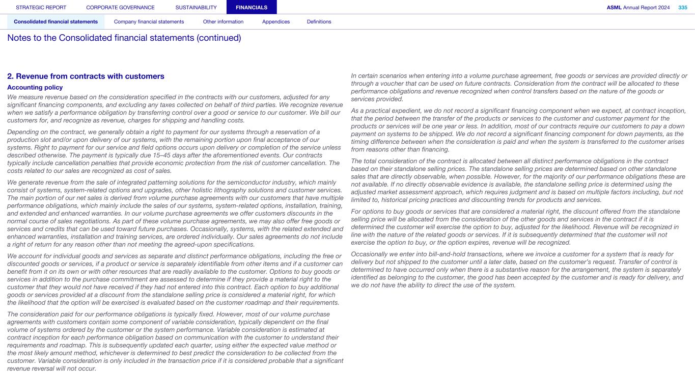 2.与客户签订的合同产生的收入会计政策我们根据与客户签订的合同中规定的对价计量收入,并根据任何重要的融资成分进行调整,不包括代表第三方收取的任何税款。当我们通过向客户转让对商品或服务的控制权来履行履约义务时,我们确认收入。我们向客户收取运费和装卸费,并将其确认为收入。根据合同的不同,我们通常通过预订生产时段和/或在交付我们的系统时获得我们系统的付款权,剩余部分在我们的系统最终被接受时获得。除非另有说明,我们的服务和现场选项的付款权发生在服务交付或完成时。付款通常在上述事件发生后15 – 45天到期。我们的合同通常包括取消处罚,为客户取消风险提供经济保护。与我们的销售有关的成本确认为销售成本。我们通过销售半导体行业的集成图案化解决方案产生收入,这些解决方案主要包括系统、系统相关选项和升级、其他整体光刻解决方案和客户服务。我们净销售额的主要部分来自与客户签订的具有多项履约义务的批量采购协议,这些协议主要包括销售我们的系统、系统相关选项、安装、培训以及延长和增强的保修。在我们的带量采购协议中,我们在正常的销售谈判过程中为客户提供折扣。作为这些批量购买协议的一部分,我们还可能提供免费商品或服务以及可用于未来购买的积分。偶尔,系统,与相关的延长和增强保修,安装和培训服务,是单独订购。我们的销售协议不包括除不符合商定规格之外的任何原因的退货权。我们将个别商品和服务作为单独和可区分的履约义务进行会计处理,包括免费或打折的商品或服务,如果一项产品或服务可与其他项目分开识别,并且如果客户可以自行或利用客户随时可以获得的其他资源从中受益。除购买承诺外,对购买商品或服务的选择权进行评估,以确定它们是否向客户提供了如果他们没有签订本合同就不会获得的重大权利。以低于单独售价的折扣购买额外商品或服务的每一项选择权均被视为一项重大权利,为此,将根据客户路线图及其要求评估行使该选择权的可能性。为我们的履约义务支付的对价通常是固定的。然而,我们与客户的大部分批量采购协议都包含一些可变对价的组成部分,通常取决于客户订购的系统的最终数量或系统性能。每项履约义务的可变对价在合同开始时根据与客户的沟通以了解其要求和路线图进行估计。随后每个季度对此进行更新,使用预期价值法或最有可能的金额法,以确定的最佳方式预测将向客户收取的对价。只有在认为很可能不会发生重大收益转回的情况下,才会在交易价格中包含可变对价。在订立带量采购协议的某些情况下,直接或通过可用于未来合同的凭证提供免费商品或服务。合同产生的对价将根据所提供商品或服务的性质分配给这些履约义务和控制权转移时确认的收入。作为一种实用的权宜之计,当我们预计在合同开始时,向客户转让产品或服务与客户支付产品或服务之间的期限为一年或更短时,我们不会记录重大融资成分。此外,我们的大多数合同都要求我们的客户支付系统的首付才能发货。我们没有记录首付款的重大融资成分,因为支付对价和系统转让给客户之间的时间差异是由融资以外的原因引起的。合同的总对价根据其单独售价在合同中的所有不同履约义务之间分配。独立销售价格根据其他可直接观察到的独立销售情况确定, 有可能的时候。然而,对于我们的大部分履约义务而言,这些都不可用。如果没有可直接观察到的证据,则采用调整后的市场评估法确定独立售价,这需要判断,并基于包括但不限于历史定价惯例和产品和服务的贴现趋势等多重因素。对于被视为重大权利的购买商品或服务的选择权,如果确定客户将行使购买选择权,则从独立售价中提供的折扣将从合同中其他商品和服务的对价中分配,并根据可能性进行调整。收入将根据相关商品或服务的性质确认。后续确定客户不行使期权买入,或期权到期的,确认收入。有时,我们会进行账单持有交易,即我们根据客户的要求,为一个准备好交付但直到以后才发货给客户的系统向客户开具发票。只有当安排存在实质性原因、系统被单独认定为属于客户、货物已被客户接受并准备交付、我们不具备指挥使用系统的能力时,才确定控制权转移已经发生。战略报告公司治理可持续发展财务ASML年度报告2024335合并财务报表公司财务报表其他信息附录定义合并财务报表附注(续)