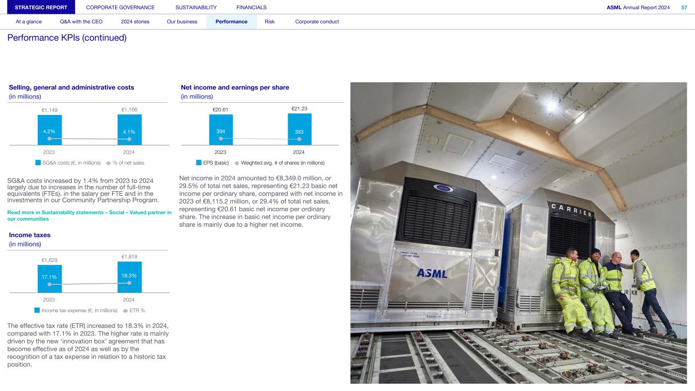 销售、一般和管理成本(百万)欧元1,149欧元1,1664.2% 4.1% SG & A成本(欧元,百万)占净销售额的百分比20232024年SG & A成本从2023年到2024年增长了1.4%,这主要是由于全职等效人员(FTE)数量、每个FTE的工资以及对我们的社区伙伴计划的投资的增加。在可持续发展声明中阅读更多内容–社会–我们社区中有价值的合作伙伴所得税(百万)欧元1,629欧元1,81817.1% 18.3%所得税费用(欧元,百万)丨% 20232024年有效税率(ETR)从2023年的17.1%增加到2024年的18.3%。较高的税率主要是由于自2024年起生效的新‘创新箱’协议以及确认与历史税收状况相关的税收费用。净收入和每股收益(百万)欧元20.61欧元21.23 394393 EPS(基本)加权平均。#股(百万)20232024年净收入为83.490亿欧元,占总净销售额的29.5%,相当于每股普通股基本净收入21.23欧元,而2023年净收入为81.152亿欧元,占总净销售额的29.4%,相当于每股普通股基本净收入20.61欧元。每股普通股基本净收入增加主要是由于净收入增加。战略报告公司治理可持续发展财务ASML年度报告2024 57一览与CEO的问答2024故事我们的业务绩效风险公司行为绩效KPI(续)
