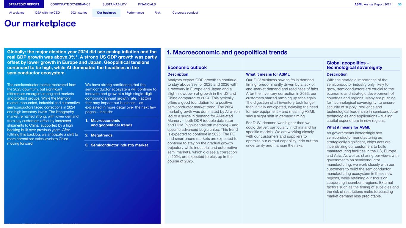 战略报告企业治理可持续发展金融家ASML 2024年度报告33与CEO的一览问答2024故事我们的业务绩效风险企业行为我们的全球市场:2024年主要选举年确实出现了通胀缓解,实际GDP增长超过3%*.美国强劲的GDP增长被欧洲和日本较低的增长部分抵消。地缘政治紧张局势持续高涨,而人工智能占据了半导体生态系统的头条新闻。半导体市场从2023年的低迷中复苏,但终端市场和产品群之间出现了显着差异。在存储器市场反弹的同时,工业和汽车半导体在2024年面临修正,库存水平较高。光刻机市场保持强劲,主要客户的需求下降被对中国的出货量增加所抵消,这得益于前几年积压的大量订单。在完成这一积压工作后,我们预计未来将转向更正常的中国销售水平。我们对半导体生态系统将继续创新并以高单位数的年复合增长率增长抱有强烈信心。可能影响我们业务的因素——将在接下来的几页中更详细地解释——包括:1。宏观经济和地缘政治趋势2。大趋势3。半导体行业市场*资料来源:IMF《世界经济展望》,2024年10月1。宏观经济和地缘政治趋势经济展望全球地缘政治–技术主权描述分析师预计,随着欧洲和日本的复苏以及美国和中国的增长与2024年相比略有放缓,2025年和2026年GDP增长将继续保持在3%以上。这通常为积极的半导体市场趋势提供了良好的基础。2024年的市场增长由AI主导,这导致对AI相关内存—— DDR(双倍数据速率)和HBM(高带宽内存)——以及特定的先进逻辑芯片的需求激增。预计这一趋势将在2025年持续下去。个人电脑和智能手机市场预计将继续保持逐步增长的轨迹,而工业和汽车半导体市场在2024年确实出现了调整,预计将在2025年回升。这对ASML意味着什么我们的EUV业务看到了需求时机的转变,主要是由于终端市场需求不足和晶圆厂准备就绪。在2023年的库存调整之后,我们的客户又开始增加晶圆厂。消化所有库存所需的时间比最初预期的要长,这推迟了对新设备的需求——这意味着ASML看到了需求时间的轻微转变。对于DUV,需求高于我们的交付能力,尤其是在中国和特定车型上。我们正与客户和供应商密切合作,以优化我们的输出能力,安然度过不确定性并管理风险。描述随着半导体产业的战略重要性只可能增长,半导体对各国和地区的经济和战略发展至关重要。许多国家正在推动‘技术主权’,以确保半导体技术和应用的供应安全、弹性和技术领先——推动新地区的资本支出。这对ASML意味着什么随着政府越来越多地将半导体制造视为具有战略意义,芯片法案正在激励我们的客户在美国、欧洲和亚洲建造制造设施。除了与各国政府分享我们对半导体制造的看法外,我们还与客户密切合作,在这些新地区建立半导体制造生态系统,同时保持我们对支持现有地区的重点。补贴发放的时间和限制的风险等外部因素使得预测市场需求的可预测性较低。