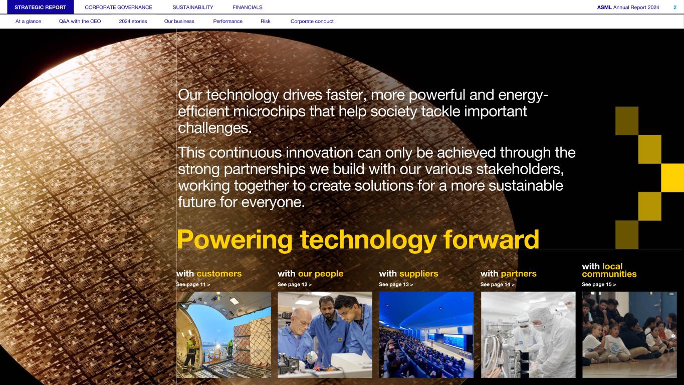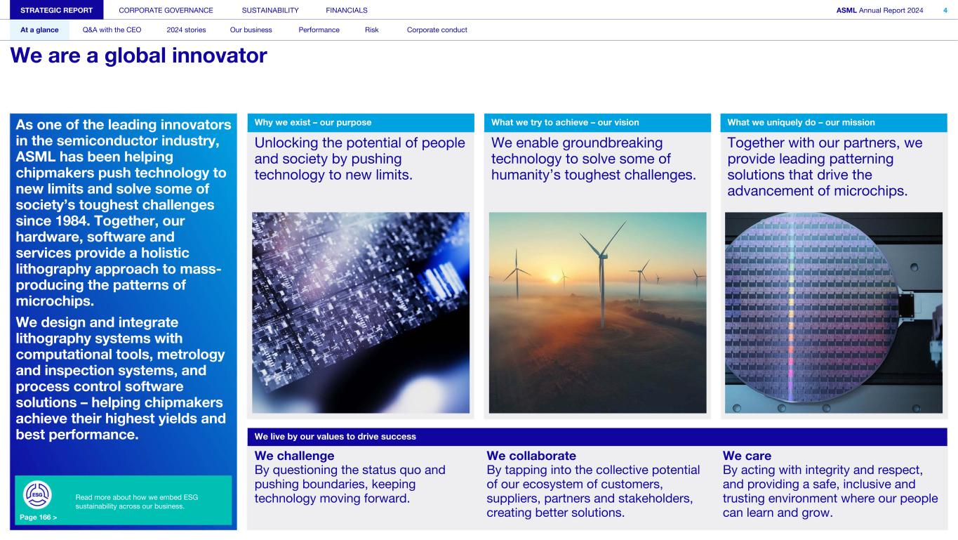 我们为什么存在——我们的目标、我们努力实现的目标——我们的愿景、我们独特的工作——我们的使命作为半导体行业领先的创新者之一,ASML自1984年以来一直在帮助芯片制造商将技术推向新的极限,并解决社会上一些最严峻的挑战。我们的硬件、软件和服务共同提供了一种整体的光刻方法来批量生产微芯片的图案。我们设计并集成光刻系统与计算工具、计量和检测系统以及过程控制软件解决方案——帮助芯片制造商实现最高产量和最佳性能。通过将技术推向新的极限,释放人与社会的潜力。我们启用了突破性技术,以解决人类面临的一些最严峻挑战。我们与合作伙伴一起,提供领先的图案化解决方案,推动微芯片的进步。我们以驱动成功的价值观生活我们挑战我们合作我们关心通过质疑现状和突破界限,让技术不断向前发展。通过挖掘我们的客户、供应商、合作伙伴和利益相关者生态系统的集体潜力,创造更好的解决方案。通过以诚信和尊重的态度行事,提供一个安全、包容和信任的环境,让我们的人民能够学习和成长。第166页>战略报告公司治理可持续发展财务ASML年度报告2024 4与CEO问答一览2024故事我们的业务绩效风险企业行为我们是全球创新者阅读更多关于我们如何将ESG可持续发展嵌入我们的业务的信息。