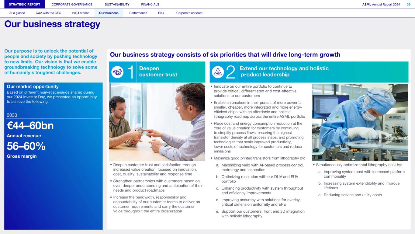 我们的目的是通过将技术推向新的极限来释放人和社会的潜力。我们的愿景是,我们能够使突破性技术解决人类面临的一些最严峻挑战。我们的市场机会基于在2024年投资者日期间分享的不同市场场景,我们提供了一个实现以下目标的机会:2030年44 – 600亿欧元年收入56 – 60%毛利率战略报告公司治理可持续性财务ASML年度报告202439与首席执行官的问答一目了然2024年的故事我们的业务绩效风险公司行为我们的业务战略我们的业务战略包括六个优先事项,这些优先事项将推动长期增长加深客户信任扩大我们的技术和整体产品领先地位12 •在我们的整个投资组合上进行创新,以继续提供关键的,为我们的客户提供差异化且具有成本效益的解决方案•使芯片制造商能够追求功能更强大、更小、更便宜、集成度更高和更节能的芯片,并在整个ASML产品组合中提供价格合理且整体的光刻路线图•通过持续简化工艺流程、确保所有工艺步骤的最高晶体管密度以及推广能够规模化提高生产力、降低客户技术成本并减少排放的技术,将降低成本和能源消耗置于为客户创造价值的核心位置•通过以下方式最大限度地利用光刻产生的良好打印晶体管:a.通过基于AI的过程控制最大限度地提高良率,计量和检测b.利用我们的DUV和EUV产品组合优化分辨率c.通过系统吞吐量和效率改进提高生产力d.通过覆盖、关键尺寸均匀性和EPE的解决方案提高精度e.通过整体光刻支持客户的前端3D集成•通过增加价值创造来加深客户的信任和满意度,专注于创新、成本、质量、可持续性和响应时间•基于对客户需求和产品路线图的更深入理解和预期,加强与客户的合作伙伴关系•增加带宽,我们的客户团队的责任和问责制,以交付客户要求并将客户声音贯穿整个组织•通过以下方式同时优化总光刻成本:a.以增加平台共性的方式改善系统成本b.增加系统可扩展性并改善寿命c.降低服务和公用事业成本