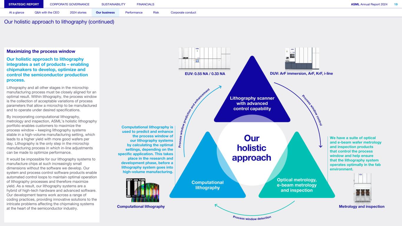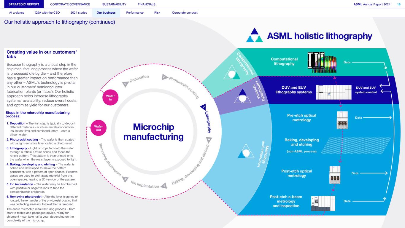 我们作为整体光刻领先供应商的地位使我们能够在整个价值链中创造价值。我们的整体光刻产品组合——基于光刻系统、计算光刻、计量和检测以及过程控制软件解决方案的智能集成——使我们的客户能够负担得起微芯片的扩展。在ASML,客户永远是第一位的——我们的解决方案基于他们的投入。我们帮助我们的客户产生每片硅片的最大价值,创造出更强大、更快、更节能的微芯片。战略报告公司治理可持续发展金融学ASML年度报告2024 42与CEO问答一览2024故事我们的业务绩效风险企业行为我们的商业模式:我们如何创造可持续的长期价值与超过10,000名客户支持员工,包括服务工程师和应用专家,我们全天候工作,以确保我们客户晶圆厂中的系统平稳运行。通过安装底座管理,我们的目标是通过广泛的服务和升级选项降低我们在现场系统的拥有成本创新和研发客户支持和安装底座管理系统集成和安装我们与我们整个创新生态系统的客户、供应商和合作伙伴一起,创新世界上最先进的光刻系统。作为系统架构师和集成商,我们与我们的世界级供应商网络合作,支持我们的客户制造更小、更快、更节能的微芯片,同时降低每片晶圆的成本。整体光刻帮助我们的客户产生每片硅片的最大价值,创造出更强大、更快、更节能的微芯片。