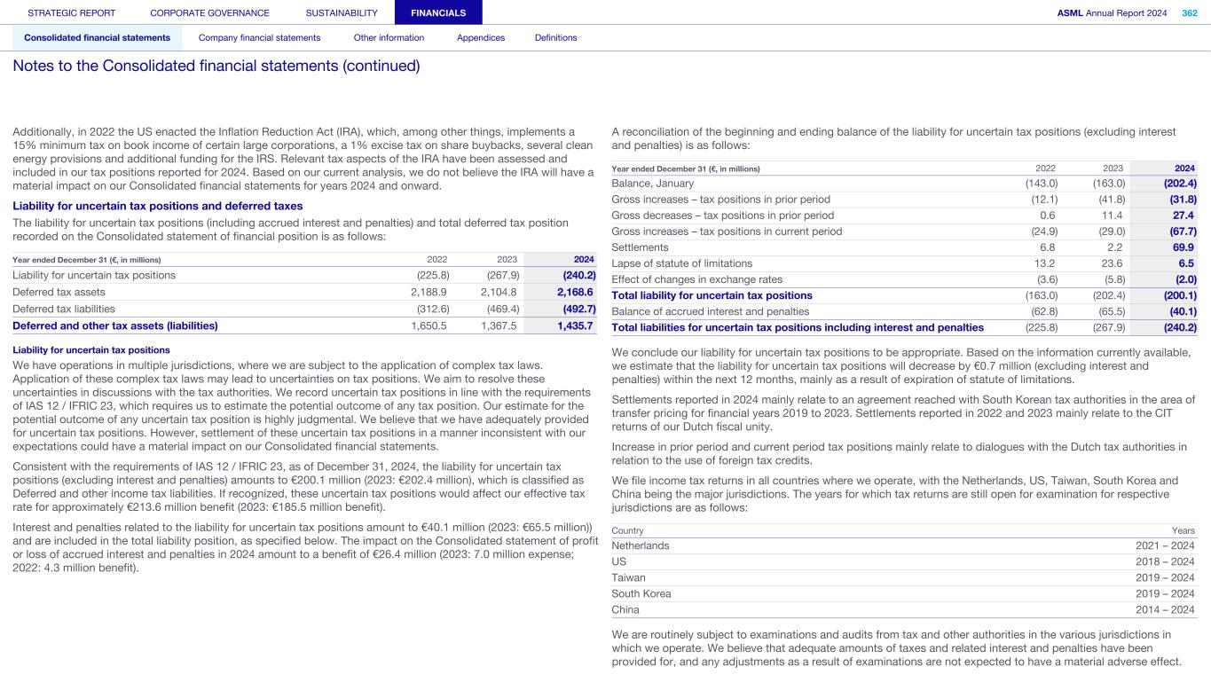 此外,2022年,美国颁布了《通胀削减法案》(IRA),除其他外,该法案对某些大公司的账面收入实施15%的最低税、对股票回购征收1%的消费税、若干清洁能源条款以及为IRS提供额外资金。爱尔兰共和军的相关税务方面已被评估并纳入我们为2024年报告的税务状况。根据我们目前的分析,我们认为IRA不会对我们2024年及以后的合并财务报表产生重大影响。不确定税务状况和递延税款的负债综合财务状况表中记录的不确定税务状况(包括应计利息和罚款)和总递延税务状况的负债如下:截至12月31日止年度(欧元,单位:百万)202220232024不确定税务状况的负债(225.8)(267.9)(240.2)递延税项资产2,188.92,104.82,168.6递延税项负债(312.6)(469.4)(492.7)递延和其他税项资产(负债)1,65 0.51,367.51,435.7不确定税务状况的负债我们在多个司法管辖区开展业务,在这些地区我们受到复杂税法的适用。适用这些复杂的税法可能会导致税务状况的不确定性。我们的目标是在与税务当局的讨论中解决这些不确定性。我们根据IAS 12/IFRIC 23的要求记录不确定的税务头寸,这要求我们估计任何税务头寸的潜在结果。我们对任何不确定的税务状况的潜在结果的估计是高度判断的。我们认为,我们已经为不确定的税收状况提供了充分的准备。然而,以不符合我们预期的方式解决这些不确定的税务状况可能会对我们的合并财务报表产生重大影响。根据IAS 12/IFRIC 23的要求,截至2024年12月31日,不确定税务状况的负债(不包括利息和罚款)为2.001亿欧元(2023年:2.024亿欧元),被归类为递延和其他所得税负债。如果得到承认,这些不确定的税收状况将影响我们约2.136亿欧元福利的有效税率(2023年:1.855亿欧元福利)。与不确定税务状况的负债相关的利息和罚款总额为4010万欧元(2023年:6550万欧元),计入总负债状况,具体如下。2024年应计利息和罚款对合并损益表的影响为2640万欧元(2023年:700万费用;2022年:430万福利)。不确定税务状况(不包括利息和罚款)负债的期初和期末余额对账如下:截至12月31日止年度(欧元,单位:百万)202220232024余额,1月(143.0)(163.0)(202.4)毛额增加–上一期税收头寸(12.1)(41.8)(31.8)毛额减少–上一期税收头寸0.61 1.427.4毛额增加–本期税收头寸(24.9)(29.0)(67.7)结算6.8 2.269.9诉讼时效失效13.22 3.66.5汇率变动的影响(3.6)(5.8)(2.0)不确定税收头寸的总负债(163.0)(202.4)(200.1)应计利息和罚款余额(62.8)(65.5)(40.1)不确定税收头寸的总负债,包括利息和罚款(225.8)(267.9)(240.2)我们得出结论,我们对不确定的税务状况的责任是适当的。根据目前可获得的信息,我们估计未来12个月内不确定税务头寸的负债将减少0.7百万欧元(不包括利息和罚款),这主要是由于诉讼时效到期。2024年报告的结算主要涉及与韩国税务当局在2019至2023财政年度转让定价领域达成的协议。2022年和2023年报告的结算主要涉及我们荷兰财政统一的企业所得税回报。上期和本期税收头寸的增加主要涉及与荷兰税务当局就使用外国税收抵免进行的对话。我们在我们经营的所有国家提交所得税申报表,荷兰、美国、台湾、韩国和中国是主要司法管辖区。各司法管辖区仍开放审查纳税申报表的年份如下:国家年份荷兰2021 – 2024美国2018 – 2024台湾2019 – 2024韩国2019 – 2024中国2014 – 2024我们经常受到我们经营所在各司法管辖区的税务和其他当局的审查和审计。我们认为,已经提供了足够的税款以及相关的利息和罚款, 并且由于考试而进行的任何调整预计不会产生重大不利影响。战略报告公司治理可持续发展财务ASML年度报告2024362合并财务报表公司财务报表其他信息附录定义合并财务报表附注(续)
