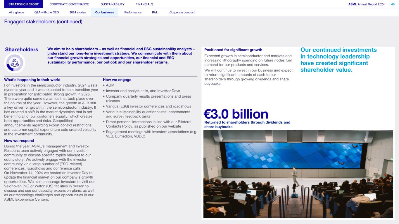 股东我们的目标是帮助股东——以及财务和ESG可持续发展分析师——了解我们的长期投资战略。我们与他们交流我们的财务增长战略和机会、我们的财务和ESG可持续发展表现、我们的前景和股东回报。对于半导体行业的投资者来说,他们的世界正在发生什么,2024年是充满活力的一年,预计这将是为2025年预期的强劲增长做准备的过渡年。在这一年中发生了相当多的动态。然而,人工智能的增长仍然是半导体行业增长的关键驱动力。它造成了市场动态的转变,并没有让我们所有的客户都平等受益,这既创造了机会,也带来了风险。有关出口管制限制和客户资本支出削减的地缘政治声明在投资界造成了波动。我们如何应对在这一年中,ASML的管理层和投资者关系团队积极与我们的投资者社区进行接触,讨论与我们的股权故事相关的特定话题。我们通过大量(ESG相关)会议、路演和电话会议积极与投资者群体互动。2024年11月14日,我们举办了投资者日,向金融市场介绍我们公司的增长机会。我们也鼓励投资者亲临我们的Veldhoven(NL)或Wilton(美国)设施,讨论和了解我们的产能扩张计划,以及我们在ASML体验中心的技术挑战和机遇。我们如何参与•年度股东大会•投资者和分析师电话会议,以及投资者日•公司季度业绩报告和新闻稿•各种(ESG)投资者会议和路演•各种可持续发展问卷、评估和调查反馈任务•根据我们的双边联系政策直接进行个人互动,如我们网站上发布的那样•与投资者协会的参与会议(例如VEB、Eumedion、VBDO)战略报告公司治理可持续发展财务ASML年度报告202448一览与首席执行官的问答2024故事我们的业务绩效风险公司行为参与的利益相关者(续)定位于显着增长我们对技术领先地位的持续投资创造了重要的股东价值。半导体终端市场的预期增长和未来节点上光刻支出的增加推动了对我们产品和服务的需求。我们将继续投资于我们的业务,并期望通过不断增加的股息和股票回购向我们的股东返还大量现金。通过股息和股票回购向股东返还30亿欧元。