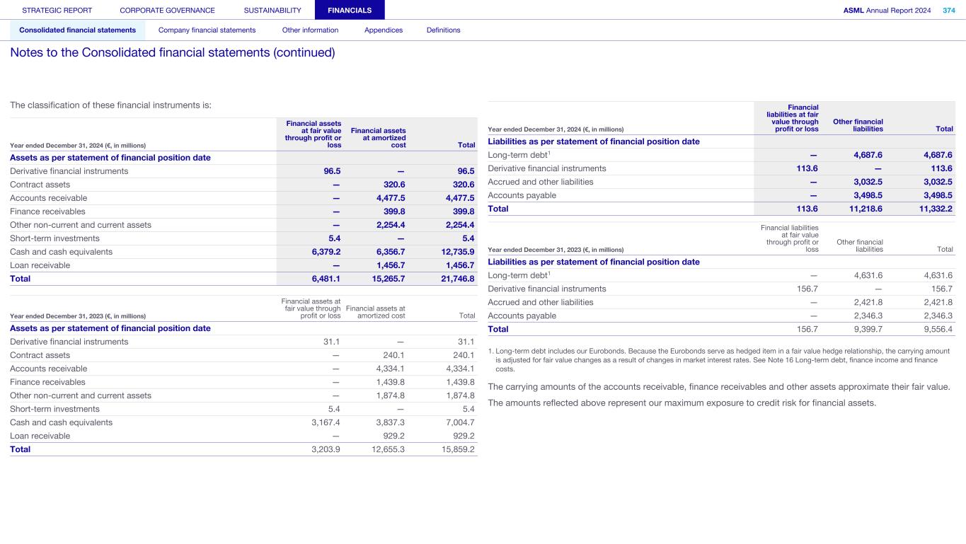 这些金融工具的分类为:截至2024年12月31日止年度(欧元,单位:百万)以公允价值计量且其变动计入损益的金融资产按摊余成本计量的金融资产按财务状况表日期计的总资产衍生金融工具96.5 — 96.5合同资产— 320.63 20.6应收账款— 4,477.54,477.5应收融资款— 399.8 399.8其他非流动资产— 2,254.42,254.4短期投资5.4 — 5.4现金及现金等价物6,379.26,356.712,735.9应收贷款— 1,456.71,456.7合计6,481.115,265.721,746.8截至2023年12月31日止年度(欧元,百万)以公允价值计量且其变动计入损益的金融资产以摊余成本计量的金融资产财务状况表日资产总额衍生金融工具31.1 — 31.1合同资产— 240.12 40.1应收账款— 4,334.14,334.1应收融资款— 1,439.81,439.8其他非流动和流动资产— 1,874.81,874.8短期投资5.4 — 5.4现金及现金等价物3,167.43,837.37,004.7应收贷款— 929.29 29.2合计3,203.912,655.315,859.2截至2024年12月31日止年度(欧元,百万)以公允价值计量且其变动计入损益的金融负债其他金融负债财务状况表日的负债总额长期债务1 — 4,687.64,687.6衍生金融工具113.6 — 113.6应计及其他负债— 3,032.53,032.5应付账款— 3,498.53,498.5合计113.611,218.611,33 2.2截至2023年12月31日止年度(欧元,百万)以公允价值计量且其变动计入损益的金融负债其他金融负债财务状况表日负债总额长期债务1 — 4,631.64,631.6衍生金融工具156.7 — 156.7应计及其他负债— 2,421.82,421.8应付账款— 2,346.32,346.3合计156.79,399.79,556.41。长期债务包括我们的欧洲债券。由于欧元债券在公允价值套期关系中作为被套期项目,账面金额因市场利率变动而进行公允价值变动调整。见附注16长期债务、财务收入和财务费用。应收账款、应收融资款及其他资产的账面值与其公允价值相若。上述金额代表了我们对金融资产信用风险的最大敞口。战略报告公司治理可持续发展财务ASML年度报告2024 374合并财务报表公司财务报表其他信息附录定义合并财务报表附注(续)